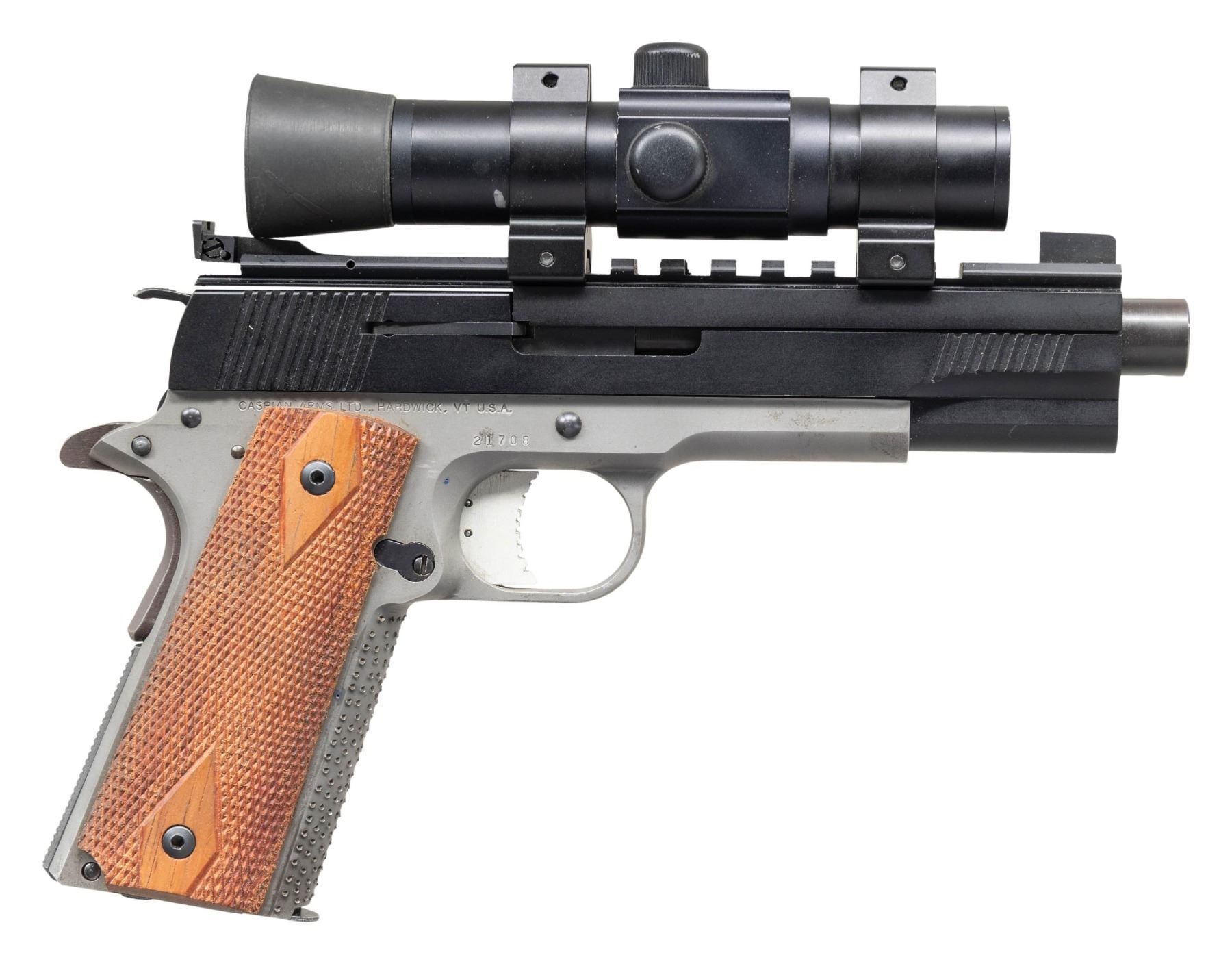 Cal. 22 LR. S# 21708. Bbl. 5 1/4". Stainless Caspian 1911 Government frame with randomly chiseled font strap having blued components of: Colt style serrated thumb safety, "as cast" 1911-A1 style grip safety, flat checkered mainspring housing, magazine latch, plunger tube, lightweight spur hammer and Allen head grip screws. Long aluminum serrated faced trigger with overtravel stop additionally having random horizontal slots. Checkered double diamond walnut grips. Fitted with Marvel 22 LR conversion unit (functions similar to S&W Model 41) widely known for its superior accuracy (usually below 1" groups at 50 yards!); S# H0651. Special variation with Picatinny style rail having Patridge front sight blade and Colt Elliason adjustable rear sight. Red dot sight by Ultra Dot with 1" tube, alloy scope rings and variable intensity dot control. MAGS: 1 Kart steel 10 rd. conversion unit magazine. CONDITION: all aspects near excellent including bore and grips. (25-3297/NW). MODERN. $800-1,200.