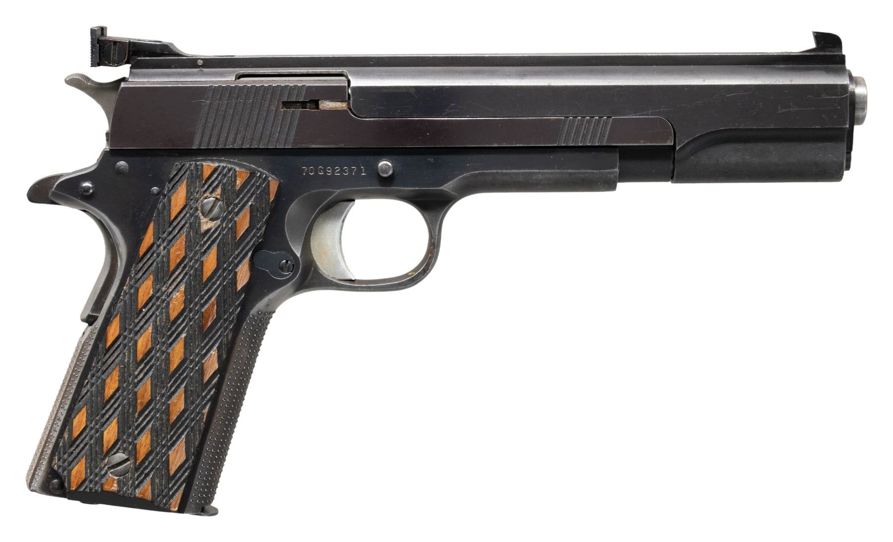 Cal. 22 LR. S# 70G92371. Bbl. 6". Blued Colt Government frame made 1976 plus Kart Conversion Unit (S#1240) having grooved raised rib with Patridge style front sight and Elliason style adjustable rear sight. Frontstrap of frame and rounded straight mainspring housing have neat rows of fine chiseled points for a secure grip. Serrated faced magazine release and thumb safety; 1911-A1 style grip safety. Medium aluminum trigger with serrated face and overtravel stop. Aftermarket matte stainless appearing hammer with checkered spur. Skip line checkered walnut grips with dark background and light colored diamonds; slotted grip screws. MAGS: 1 good Kart Conversion Unit 10 rd. with push button base (missing spot of finish) and polished steel follower. Front curve of upper half of body is polished to in the white. CONDITION: good plus overall with thinning of finish due to hand wear and functioning (including grip screws). Near excellent bore and grips. Especially nice target trigger pull. After applying thumb safety and attempting to use trigger, the hammer will fall when safety is disengaged; this safety issue should be addressed before use. (25-3294/NW). MODERN. $700-1,000.