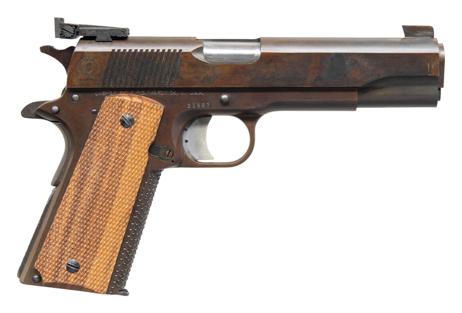 Cal. 45 ACP. S# 21967. Bbl. 5" stainless throated Kart NM with Kart match bushing. Blued with randomly chiseled font strap plus similar mainspring housing that was originally arched and milled flat before chiseling. Serrated faced slide stop, thumb safety and magazine latch. Caspian marked round top slide with slanted square cut rear cocking grooves having flared ejection port plus flat faced rearward slanting front blade and Bo-Mar style Kensight adjustable rear sight. Narrow checkered spur hammer and 1911-A1 style grip safety. Long aluminum serrated trigger with overtravel stop. Fully checkered walnut grips; slotted grip screws. MAGS: 1 good Colt Delta Elite 10MM magazine of 8 rds. with body electro numbered "7001". CONDITION: very good general appearance with slight plum tone to bluing along with spotty appearance to sides of slide that existed before finishing. Worn left grip screws with marred slots. Near excellent bore and grips. Fit is match tight and likely will need a typical break-in period to secure reliability. Match quality trigger pull. After applying thumb safety and attempting to use trigger, the hammer will fall when safety is disengaged; this safety issue should be addressed before use. (25-3296/NW). MODERN. $700-1,000.