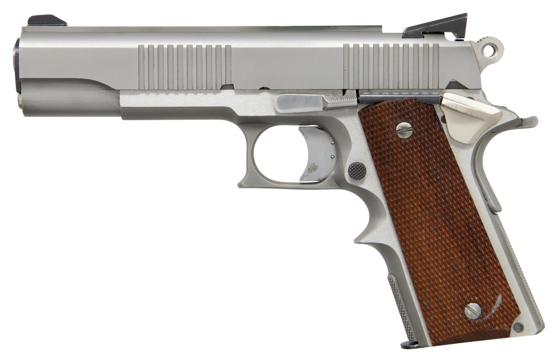 Cal. 45 ACP. S# S11847. Bbl. Colt 5" MK-IV Series 70 with US Military NM blued bushing. Special frame with front strap finger locator of the style popularized by Safari Arms; integrally cast raised panel of checkering below the locator. Trigger guard has distinctive front "hook" to aid in two handed shooting. Well fitted slide to frame plus barrel and bushing assembly. Slide has flat topped raised rib having 5 grooves plus rear milled for Bo-Mar style target sight but fitted with Novak style fixed sight; front sight is Millett Dual Crimp showing orange "T" face. Square cut vertical cocking grooves at rear and just forward of flared ejection port rather than near muzzle. Standard magazine latch, plunger tube, spring guide and ejector are blued; thumb safety appears to be by Colt with satin nickel grooved finish. Grip safety is 1911-A1 style plus flat checkered mainspring housing. 1911 Military style slide stop appears to be polished stainless. Commander style hammer and long aluminum trigger with serrated face and overtravel stop. Fully checkered walnut grips with slotted stainless screws. MAGS: unmarked blued 7 rd. with finish removed around latch section having Dykem Blue added (likely for fitting latch notch); base holes for pad plus numbered "2". CONDITION: very nicely set up defense style pistol that can easily be enhanced by replacing the rear sight with one that is adjustable. Style of front strap is unconventional, but very comfortable and user friendly. All appears near excellent including bore and grips. Hammer follows slide when fully released. (25-3300/NW). MODERN. $700-1,000.