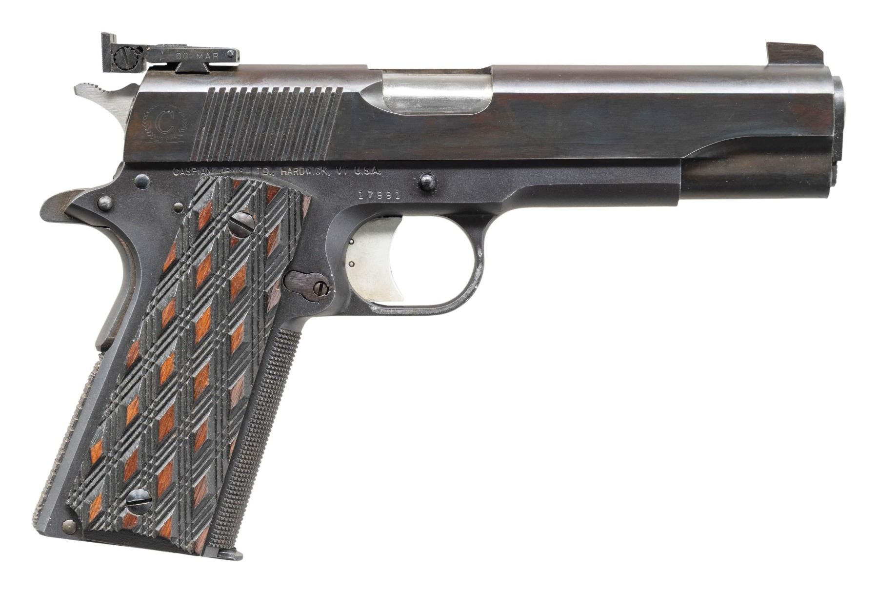 Cal. 45 ACP. S# 17991. Bbl. 5" stainless throated Kart NM with "NM" marked bushing. Blued finish with cast checkered front strap plus similarly checkered mainspring housing additionally having horizontal slots. Serrated faced slide stop, thumb safety and magazine latch. Caspian marked round top slide with flared ejection port plus undercut square faced Patridge front blade and Bo-Mar adjustable rear sight. Late commercial Colt style serrated hammer and 1911-A1 style grip safety. Long serrated faced aluminum trigger with overtravel stop. Dark skip line checkered walnut grips having raised light colored diamonds; slotted grip screws. MAGS: 1 Mec-Gar 7 rd. with finish removed around latch area. CONDITION: all aspects near excellent including bore and grips. Fit is match tight and likely will need a typical break-in period to secure reliability. Match quality trigger pull. (25-3305/NW). MODERN. $700-1,000.