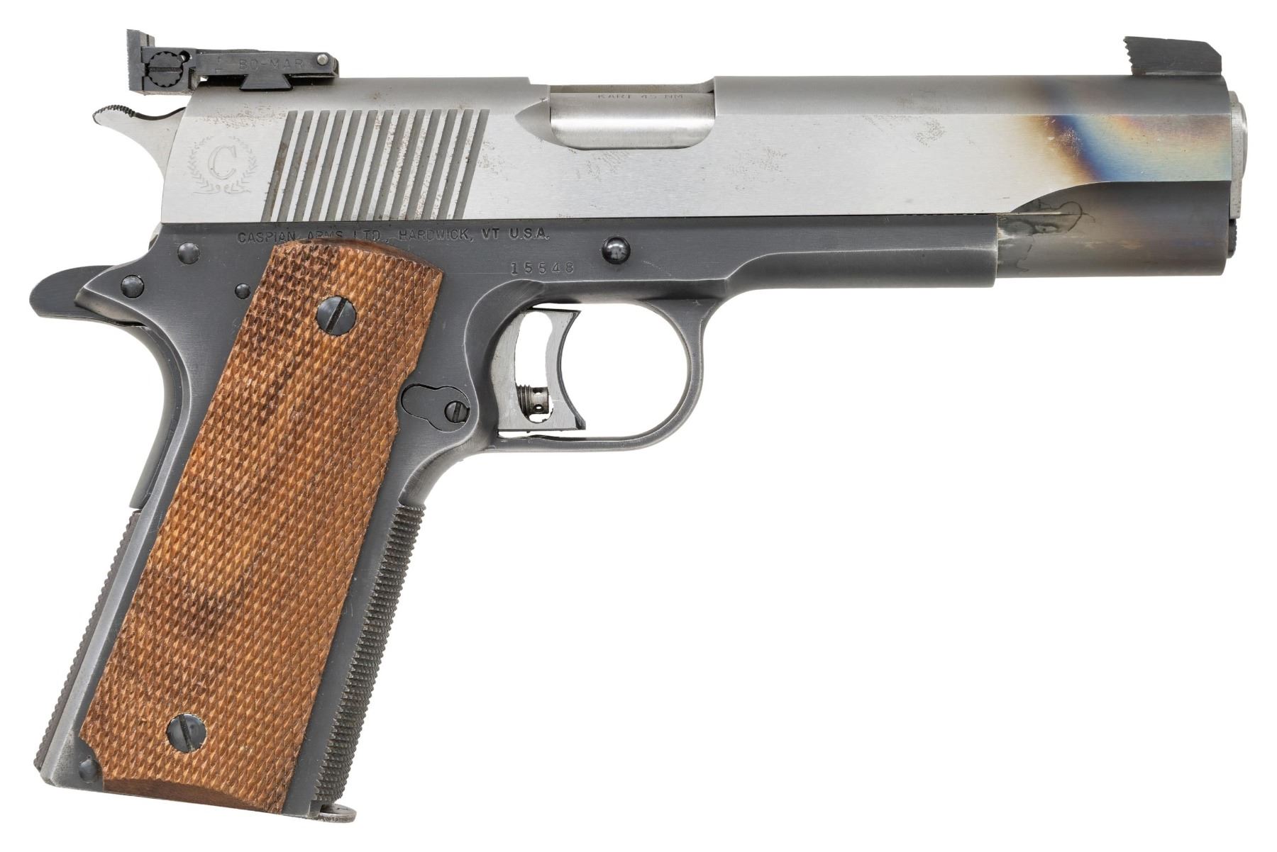 Cal. 45 ACP. S# 15548. Bbl. 5" stainless throated Kart NM with Kart match bushing. Cast checkered front strap plus similarly checkered mainspring housing. Serrated faced slide stop and magazine latch plus military style checkered thumb safety. Caspian marked stainless appearing (possibly unfinished carbon steel) round top slide with slanted square cut rear cocking grooves having flared ejection port plus serrated faced rearward slanting front blade and Bo-Mar adjustable rear sight; balance is blued. Narrow checkered spur hammer and 1911-A1 style grip safety. Colt Gold Cup trigger with overtravel stop. Fully checkered walnut grips; slotted grip screws. MAGS: 1 fair MS Little 7 rd. with finish removed around latch area; aftermarket round topped follower. CONDITION: generally good appearance with thinning of finish from hand wear and functioning. Small dent at very rear bottom of trigger guard. Slide has noticeable heat discoloration from sight installation. Near excellent bore and grips. Fit is match tight and likely will need a typical break-in period to secure reliability. Match quality trigger pull. (25-3299/NW). MODERN. $600-900.