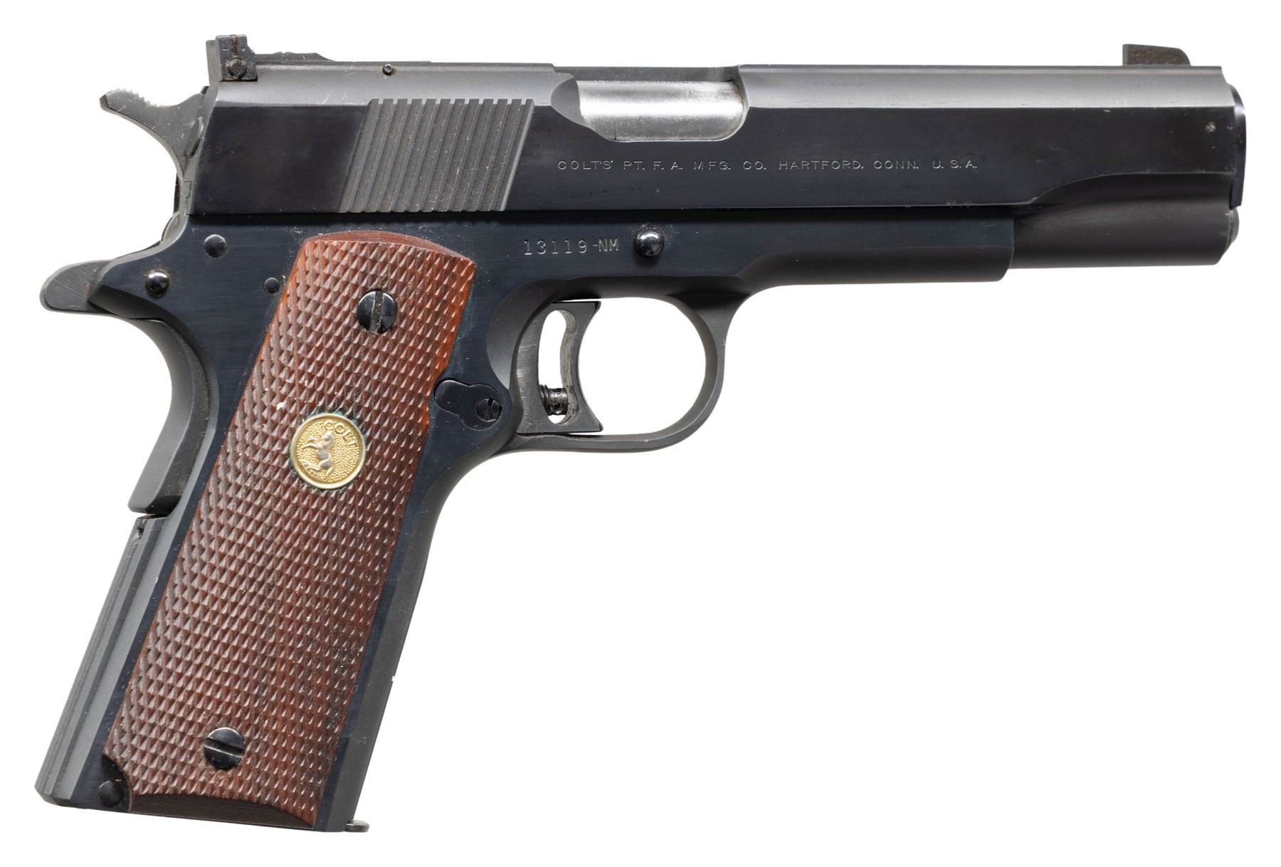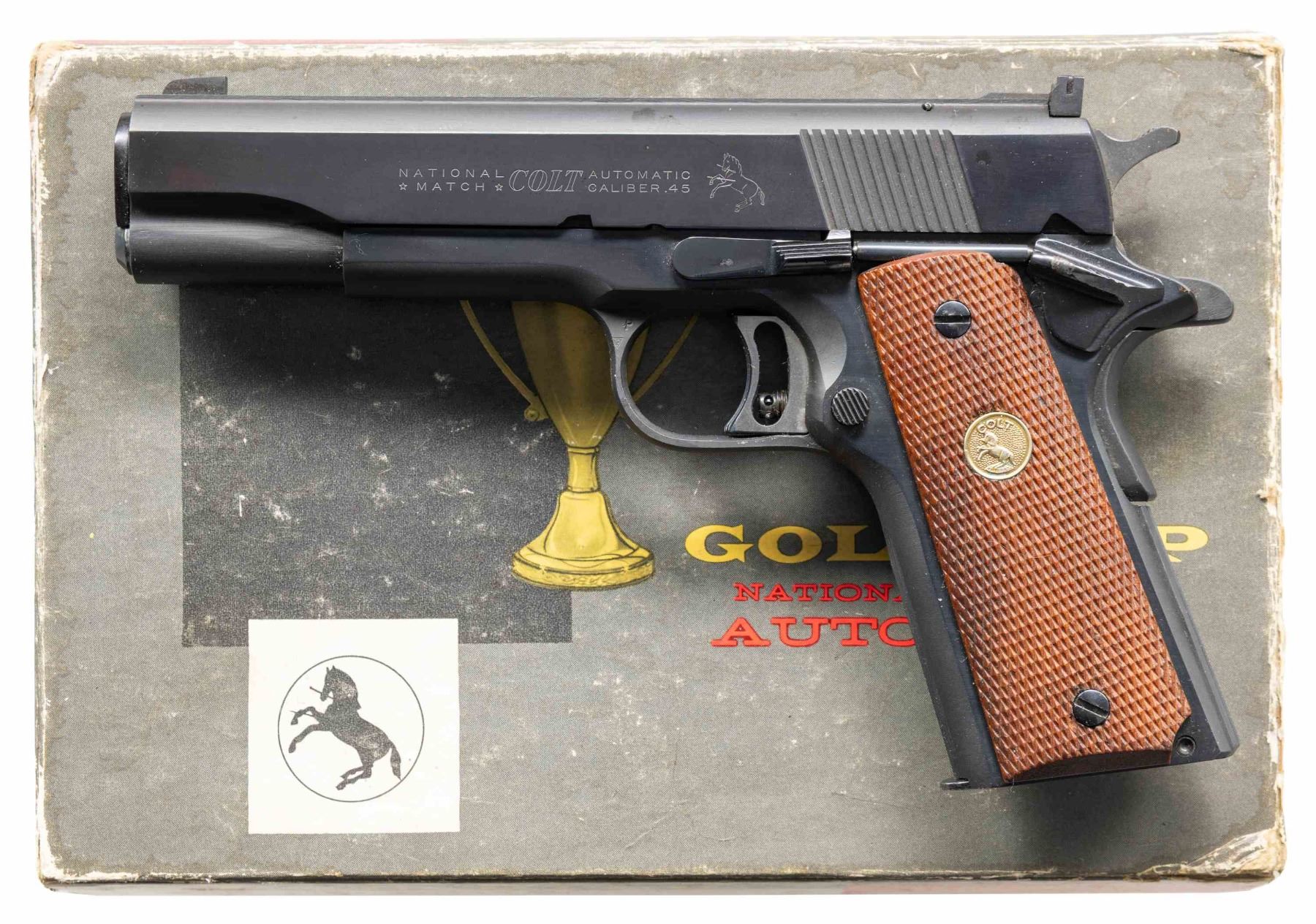 Cal. 45 ACP. S# 13119-NM. Mfg. 1964 w/ Royal blue finish, National Match 5" barrel, target sights, & checkered walnut grips having gold Colt medallions. MAGS: 1 - 7 rd. UNATTACHED ACCESSORIES: Colt Cup National Match box containing test target, Gold Cup National Pamphlet & Handling the Handgun booklet. Box in fair condition to all torn corners of lid along with numerous marks. CONDITION: very good to near excellent original blue with with a couple spots of finish loss & scattered pinprick patina. Near excellent grips. Very good rifling. (25-4692/MD). CURIO. $1,000-1,500.