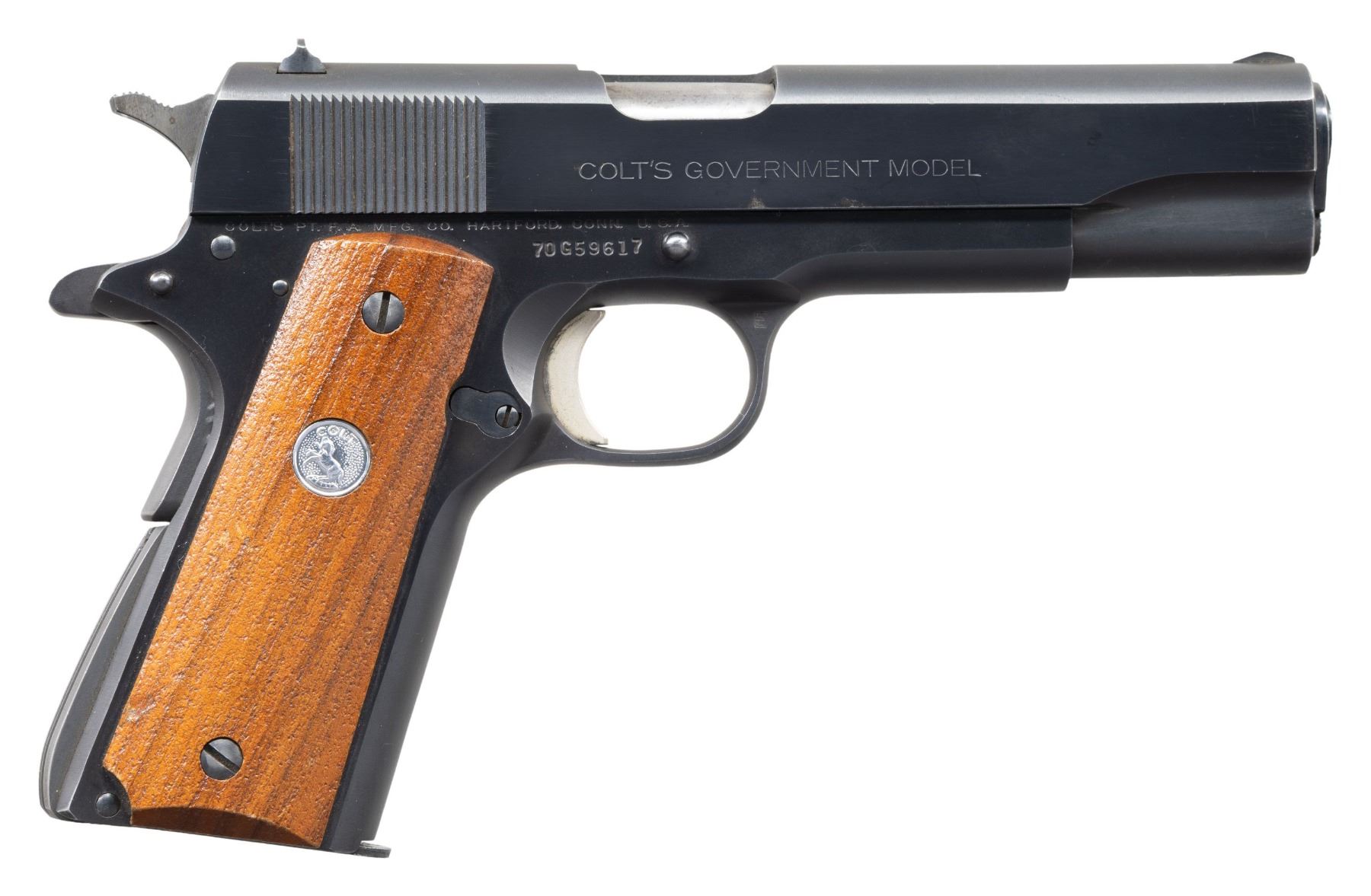 PISTOL. Cal. 45 ACP. S# 70G59617. Bbl. 5". GI style sights. 1973-1974 made Series 70 1911 pistol. Blued finish. Two piece walnut grips with silver Rampant Colt medallions. MAGS: 1-7 rd. "C-S" marked for Scovill mfg.CONDITION: grips have added varnish with some light handling marks & worn finish. Metal retains 95% original blue with a light slide stop reassembly scratch on frame, some edge wear, light fading & handling marks. Action functions properly when hand cycled. Very good plus bright bore. PROVENANCE: Estate of Groves Herrick. (25-5695/MJC). CURIO. $700-1,000.