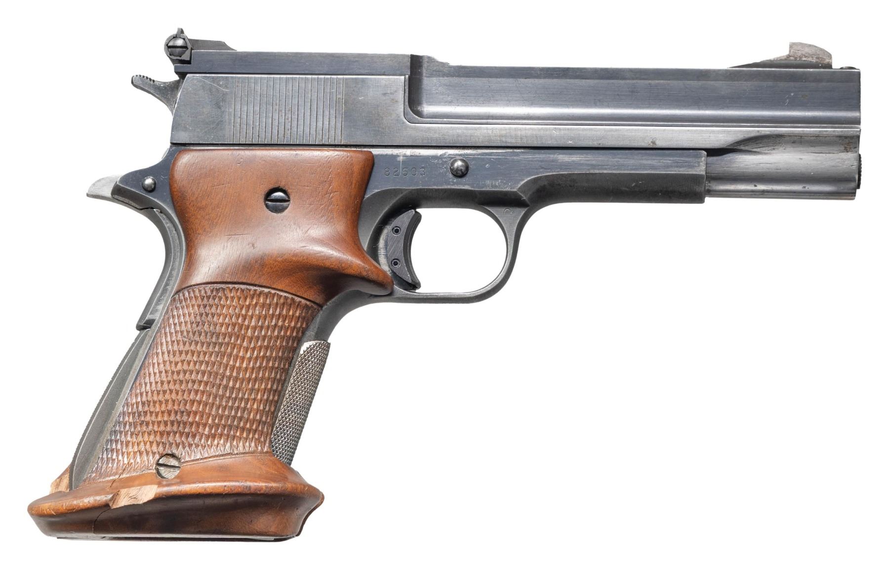 SEMI-AUTO PISTOL. Cal. 22 LR. S# 82503. Bbl. 4 15/16" with square cut crown. Mfg. 1950 as Super 38 being altered to accept this unmarked and unknown conversion unit that my be a one off unit that is very similar to those by Kart, Nelson or Marvel. Alterations to frame include: checkered front strap piece soldered onto original smooth front strap, trigger shoe on trigger, lightly bobbed hammer to speed lock time plus ejector thinned on inside with extension added by brazing to eject spent cartridges earlier in the action cycle. Basic conversion is all steel rather than having an aluminum slide. No makers marks or numbers on any of the conversion unit. Cocking grooves are very shallow. Standard spring plug brazed into front of slide. Overall operation is much like the popular S&W Model 41 and the top of the shaped barrel has a S&W Micrometer rear sight affixed; front is longitudinally dovetailed Patridge design on Allen screw attached solid rib. Extractor is similar to regular Model 1911-A1 rather than external. Grip safety sides are polished to in the white for minimal interference of operation with very light spring pressure. Very light, high quality match trigger pull. Thumb safety is early checkered style and slide stop is later grooved Colt style rather than Marvel style. Grips are full coverage target style of checkered walnut with palm and thumb rests for RH use. Recoil spring is flat wound of the style found on gas trap Garands. MAGS: 1 good Colt 10 rd. with pinned base and early aluminum follower. UNATTACHED ACCESSORIES: photos and paperwork attributable to Air Force Sgt. Tom "Mac" McLennan who served in WW-II and competed in numerous matches, winning many. Paperwork lists some special pistols he competed with, but not this one. He was a pistol shooting coach at MIT and a Boston native. CONDITION: fair to good general appearance with conversion slide in the white appearing cleaned of light pitting. Barrel and rib assemblies are very good to include rear sight; front sight has light patina appearance to its sides. Pistol frame has areas of thinning finish and light marks. Poor grips with chips, cracks and frontal gap due to not being relieved for the added front strap checkering. Attachment screws are altered with slight slot damage. Bore is near excellent. (25-6028/NW). MODERN. $1,000-1,500.