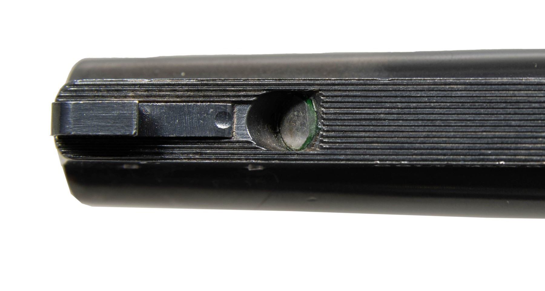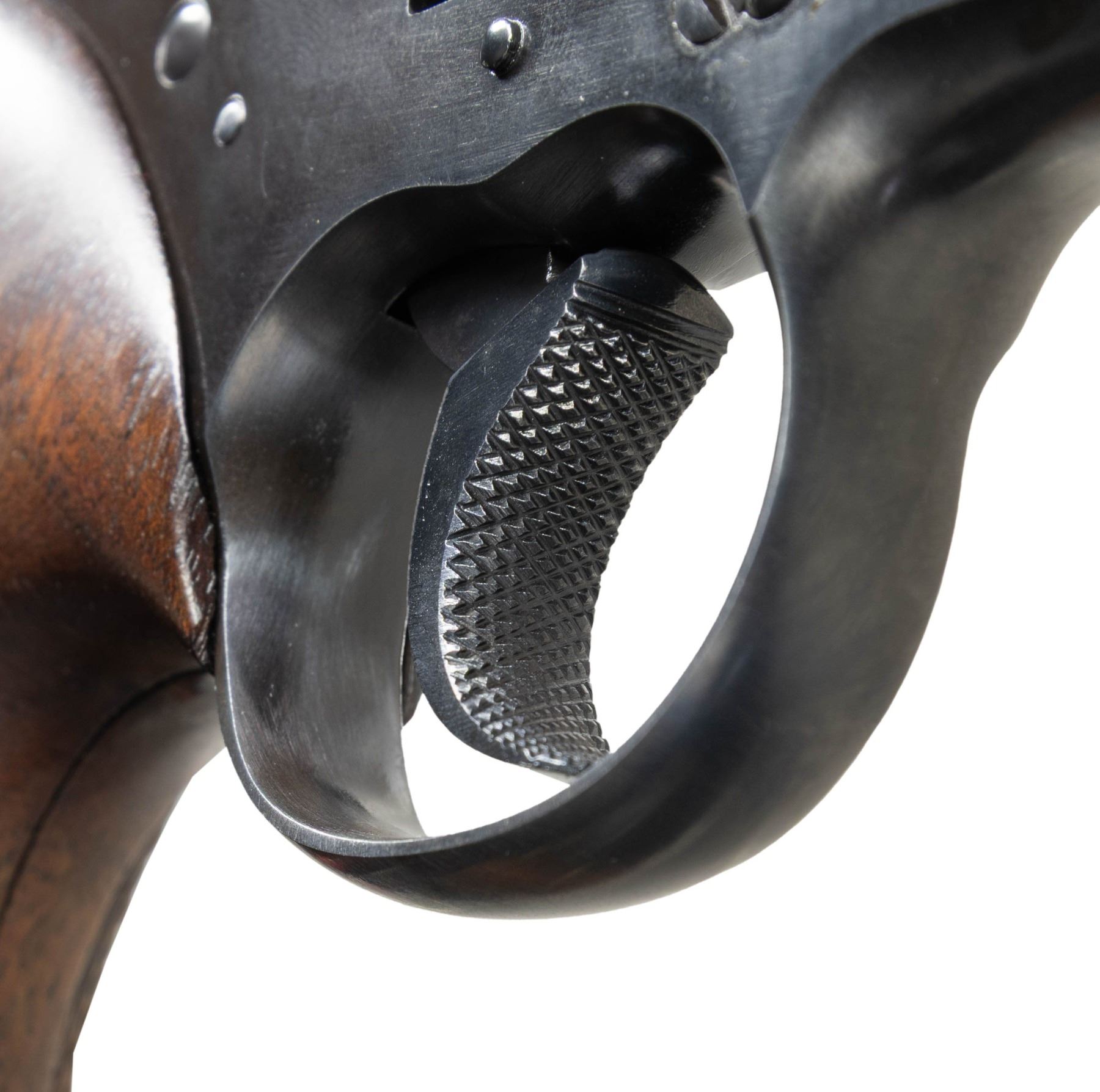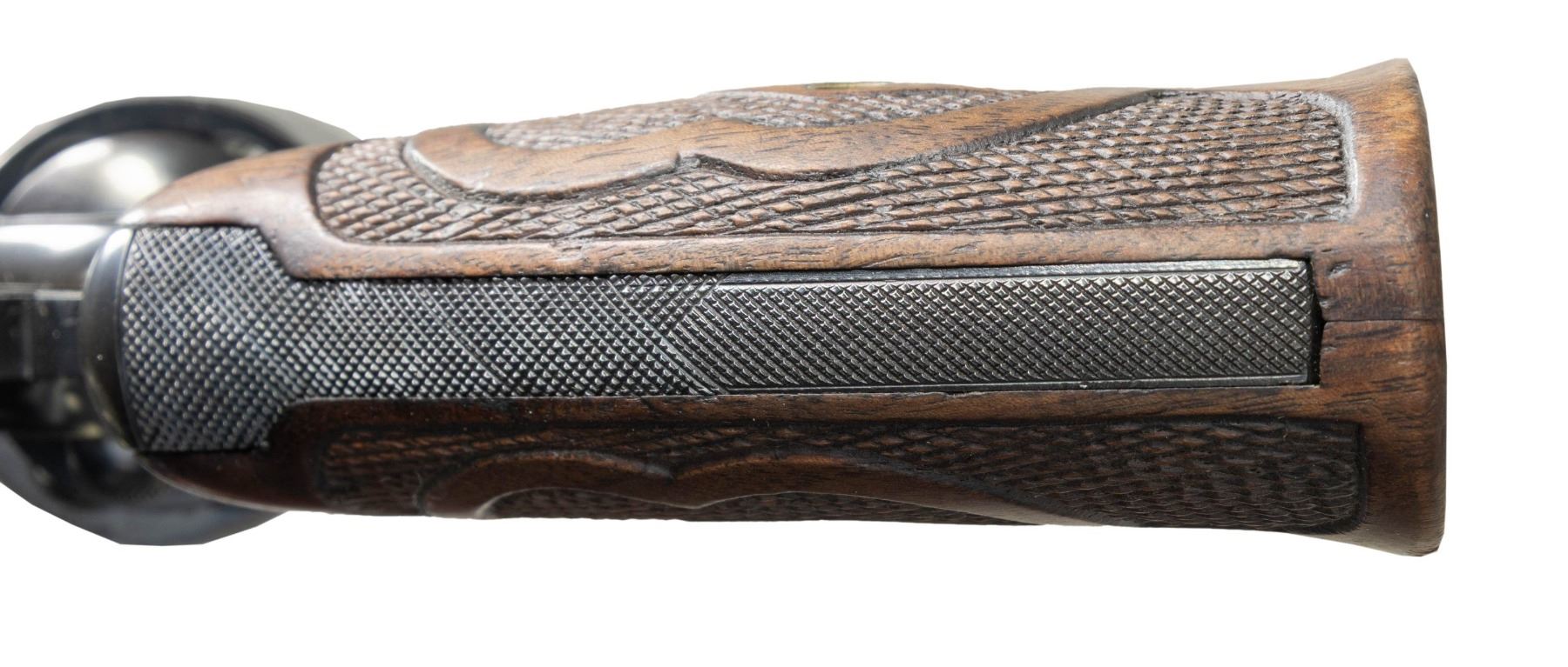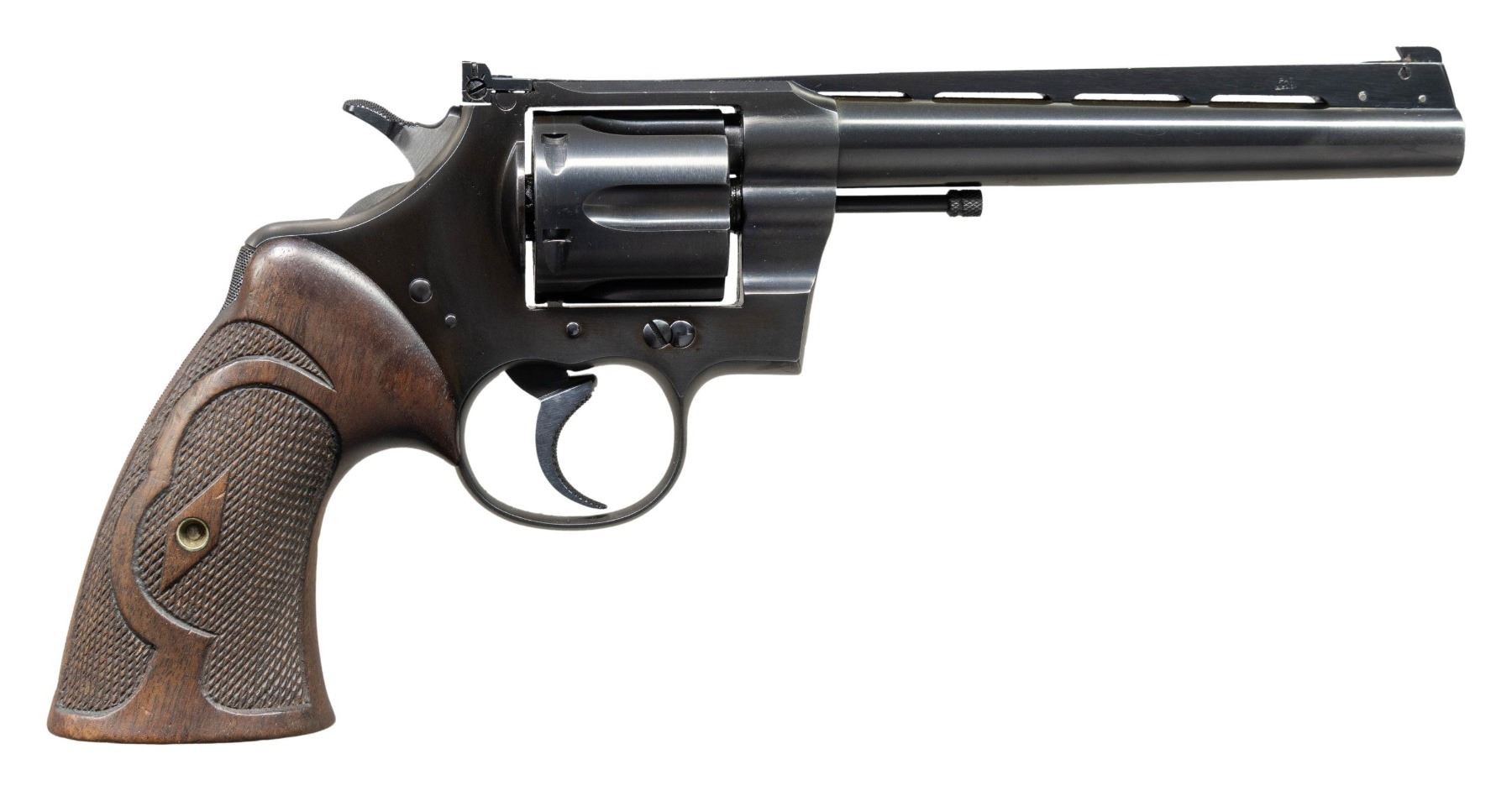 SUPER TARGET REVOLVER WITH ROPER GRIPS. Cal. 38 Spl. S# 585349. Bbl. 6". Officers Model Heavy Barrel double action revolver mfg. by Colt in 1950. Left side of the bbl. is marked with the model and cal. designations above "HEAVY BARREL" between 2 Maltese crosses. Left side of the frame is marked with the Rampant Colt logo. Metal components exhibit a blue finish overall, save for on the sides of the hammer, which are polished in-the-white. Frame is mounted with 2-piece checkered wood Roper grips. Grooved King Super Target V/R is inletted into the top strap of the frame, featuring a patridge blade front sight, reflector, and adj. square notch rear sight. Upper section of rear grip strap is checkered, with the lower section being knurled. Checkered wide spur hammer with knurled wide trigger. CONDITION: metal components retain the majority of their original factory blue finish, showing some areas of fading to brown patina (primarily visible when viewed beneath a light), some light edge wear, as well as some light superficial handling marks overall. Left side of frame shows some light pitting beneath the cyl. area. Rear right side of frame has been cleaned and reblued at one time. Near mirror bore, retaining well defined rifling throughout. Proper manual mechanics in SA and DA modes. Grips show some light to mild smoothing, as well as scattered superficial marks and minor impressions, but otherwise remain sound. (25-5104/MLW). CURIO. $1,500-2,500.