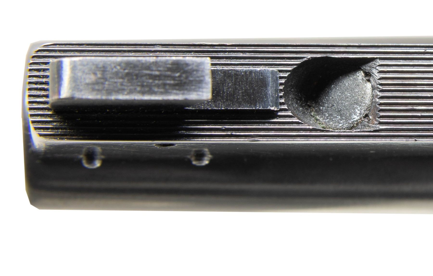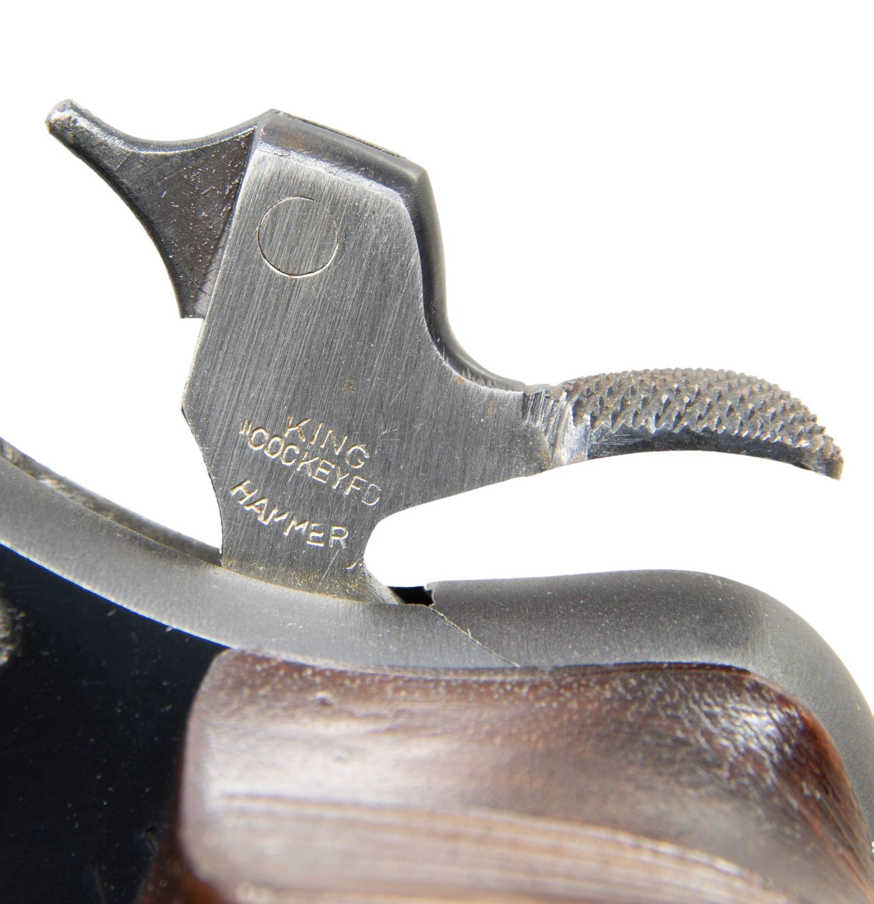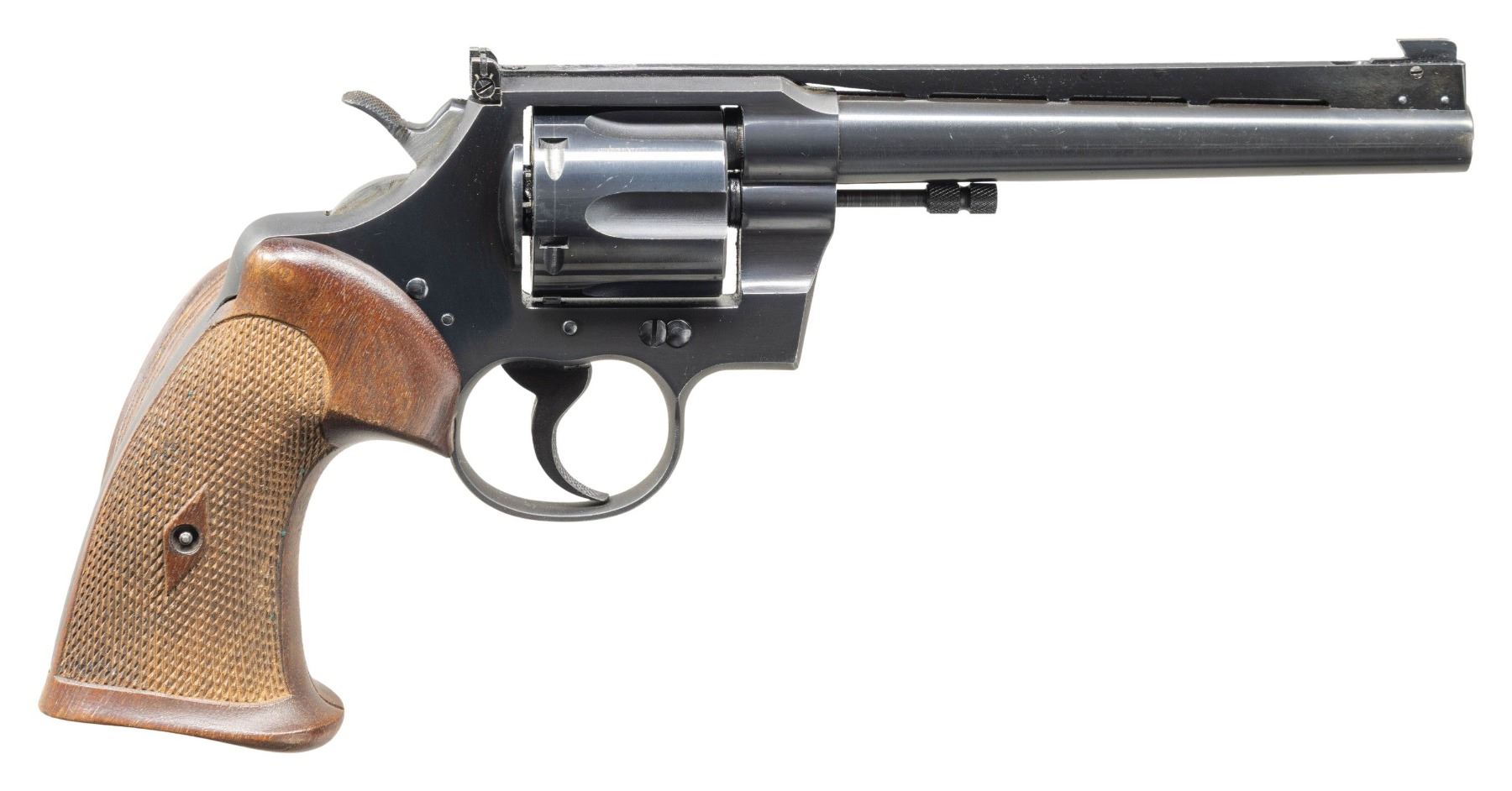 SUPER TARGET DOUBLE ACTION REVOLVER. Cal. 38 Spl. S# 740117. Bbl. 6". Official Police Heavy Barrel double action revolver mfg. by Colt circa. 1937-1938. Left side of the bbl. is marked with the model and cal. designations above "HEAVY BARREL" between 2 Maltese crosses. Left side of the frame is marked with the Rampant Colt logo. Metal components exhibit a blue finish overall, save for on the sides of the hammer, which are polished in-the-white. Frame is mounted with 2-piece aftermarket checkered thumbrest grips. V/R is inletted into the top strap of the frame, featuring a pinned patridge front sight, reflector, and adj. square notch rear sight. Tuned action with checkered King "cockeyed" hammer. Checkered trigger. CONDITION: metal components retain the vast majority of their original factory blue finish, showing a few spots of light to mild edge wear that are fading to gray patina, with some small superficial handling marks present overall. Near mirror bore, exhibiting some scattered spots of very light to light pitting, while retaining well defined rifling throughout. Proper manual mechanics in SA and DA modes. Grips show some light smoothing, as well as some light superficial marks and minor impressions, but otherwise remain sound. (25-5106/MLW). CURIO. $1,500-2,500.