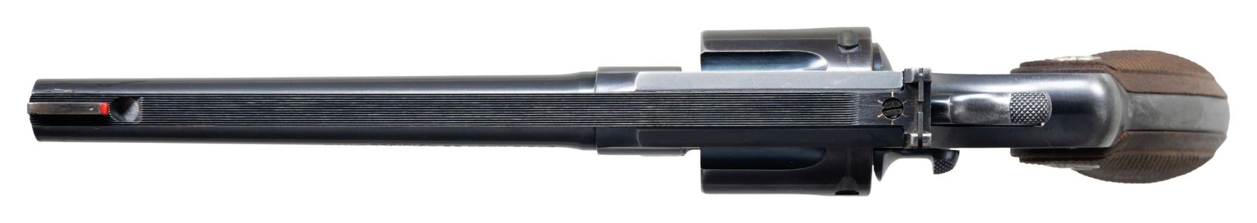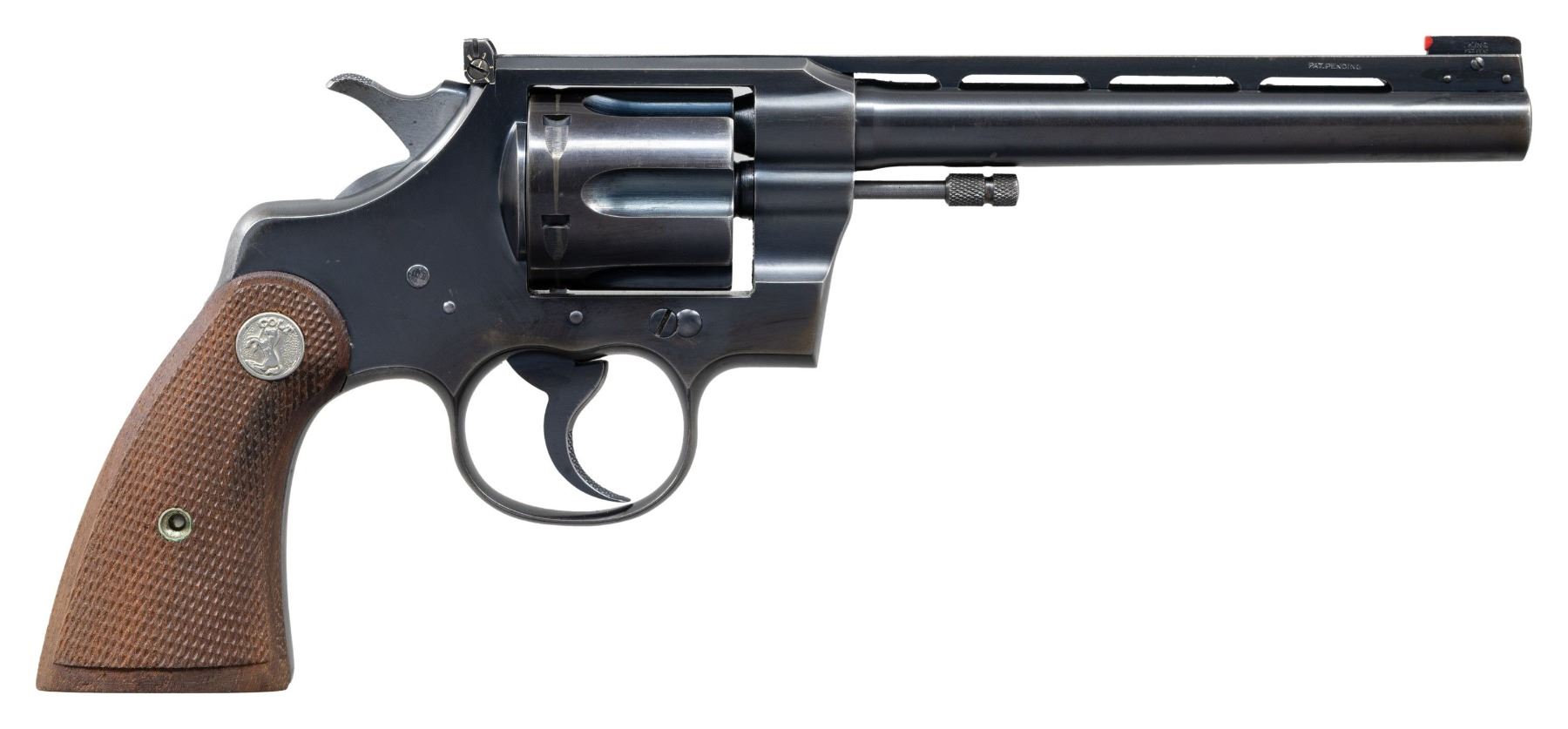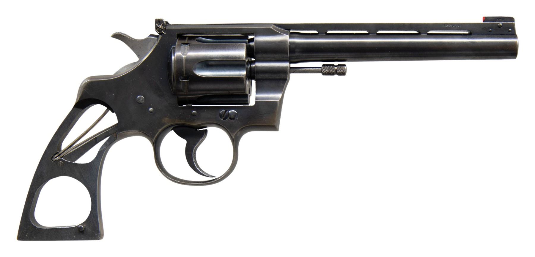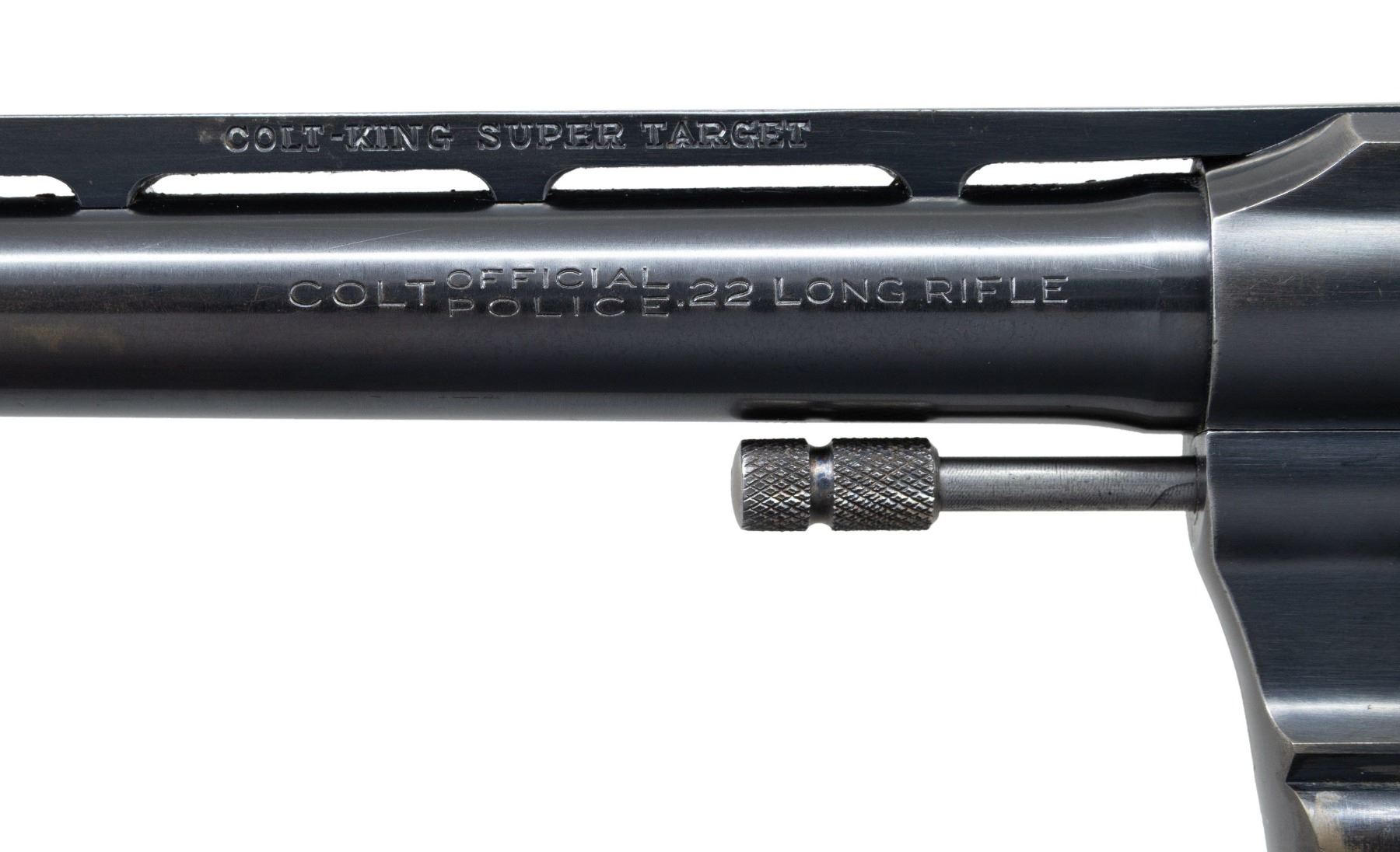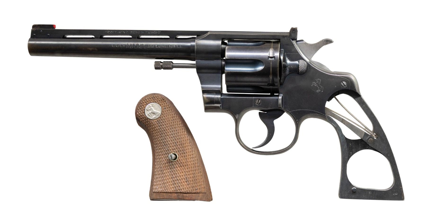 TARGET DOUBLE ACTION REVOLVER. Cal. 22 LR. S# 12317. Bbl. 6". Official Police double action revolver mfg. by Colt in 1937. Left side of the bbl. is marked with the model and cal. designations. Left side of the frame is marked with the Rampant Colt logo. Metal components exhibit a blue finish overall, save for on the sides of the hammer, which are polished in-the-white. Grooved Colt-King Super Target V/R is inletted into the top strap of the frame, featuring a red synthetic beaded blade front sight, reflector, and adj. square notch rear sight. UNATTACHED ACCESSORIES: 2-piece Colt silver medallion checkered wood grips with improper length screw. Grips cannot be mounted to frame with current grip screw. CONDITION: metal components retain the majority of their original factory blue finish, showing some areas of mild wear and thinning, some scattered spots of light surface oxidation, as well as some superficial handling marks overall. Grip straps have faded to a gray patina. Mirror bore, retaining well defined rifling throughout. Proper manual mechanics. Grips are very good, with some minor superficial handling marks. (25-5098/MLW). CURIO. $1,500-2,500.