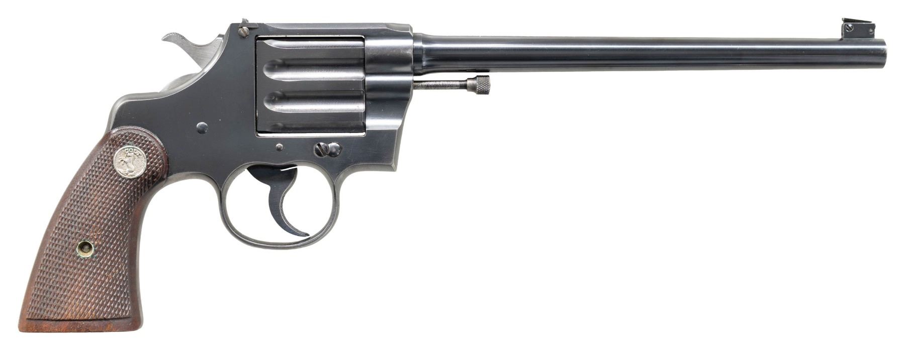 SINGLE SHOT TARGET PISTOL. Cal. 22 LR. S# 1864. Bbl. 8 1/4". Camp Perry single shot target pistol mfg. by Colt in 1931. Left side of the bbl. is marked "CAL.22 LONG RIFLE", with Colt's 2-line mfg. and patent information marked across the top. Left side of the frame is marked with the Rampant Colt logo. Metal components exhibit a blue finish overall, with the top strap of the frame exhibiting a matte blue finish. Sides of hammer are polished in-the-white. Frame is mounted with 2-piece Colt silver medallion checkered wood grips. Patridge blade front sight with adj. square notch rear sight. Distinctive fluted breechblock with knurled rear grip strap and trigger. Single action only action. Matching numbers are present on the frame (beneath left grip panel) and on the cyl. crane. Grips are matching via the full S#, which is stamped on the interior of the panels. CONDITION: metal components retain the vast majority of their original factory blue finish, showing light edge wear, some small spots of light surface oxidation, and some superficial handling marks overall. Grip straps and underside of trigger guard bow show some patches of mild wear and thinning that has faded to gray patina. Near mirror bore, exhibiting some scattered spots of light to mild pitting towards the muzzle, while retaining well defined rifling throughout. Proper manual mechanics. Grips show mild smoothing, as well as some superficial handling marks overall, with the right panel exhibiting a small chip at the butt. (25-5378/MLW). CURIO. $1,500-2,250.