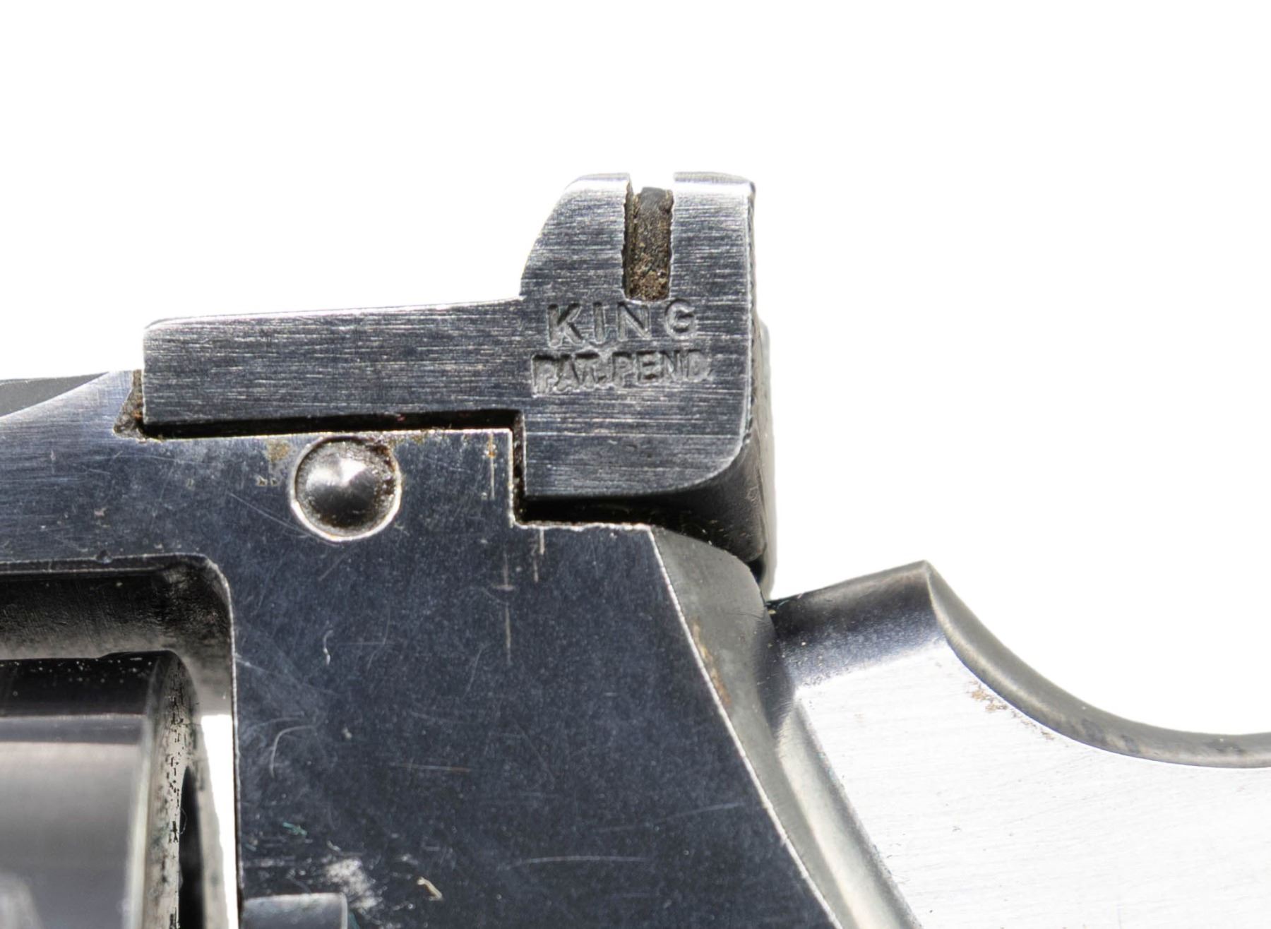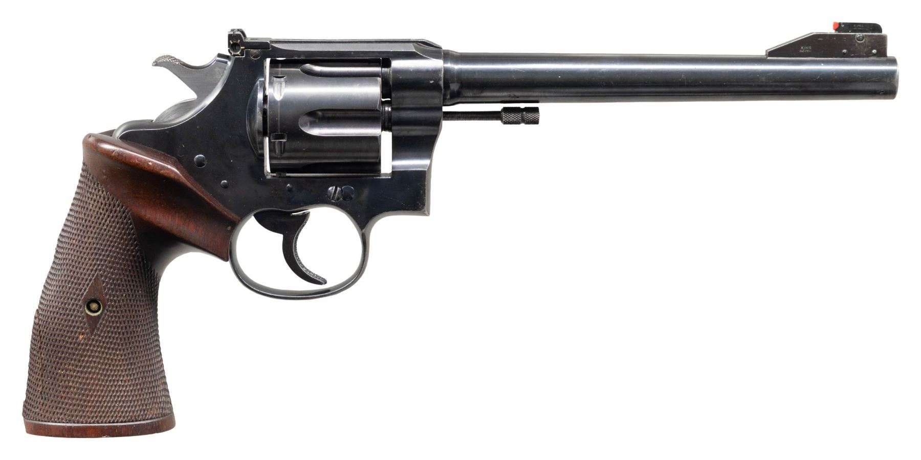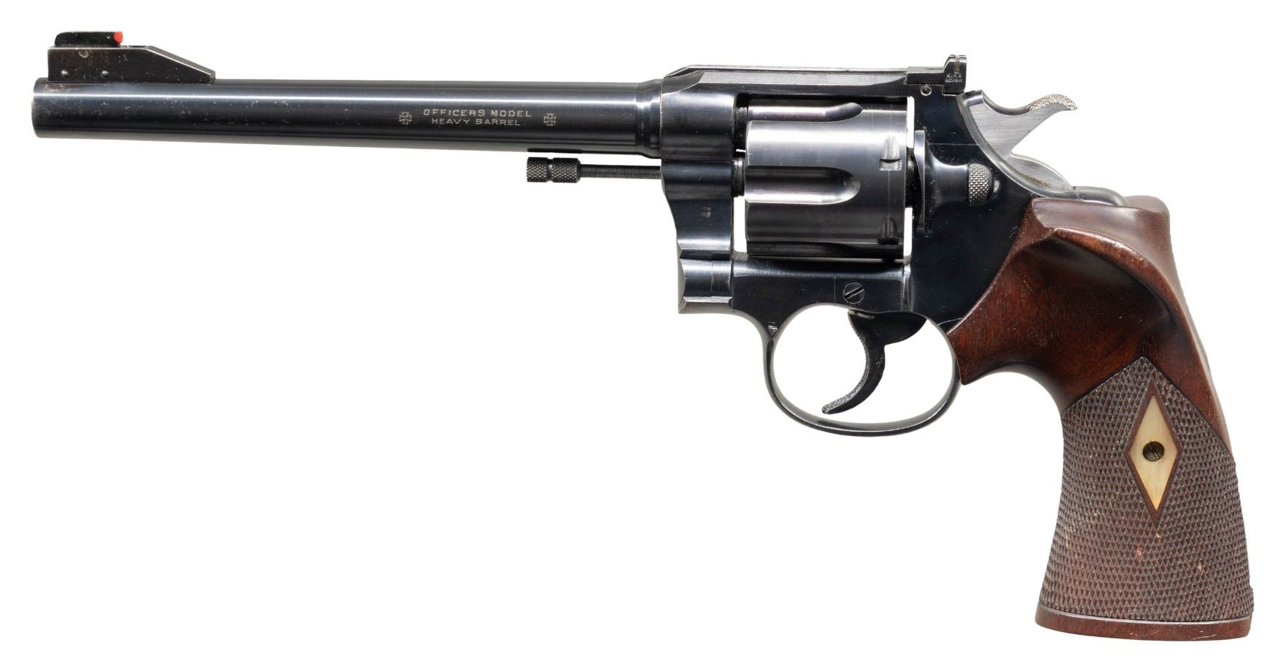 DOUBLE ACTION REVOLVER WITH KING SIGHTS. Cal. 357 Mag. S# 325950. Bbl. 7 1/2". Officer's Model heavy bbl. double action revolver mfg. by Colt in 1910 (serialized in sequence with the Army Special Model). Left side of the custom replacement bbl. is engraved "OFFICERS MODEL/ HEAVY BARREL" between 2 large Maltese crosses. Left side of the frame is marked with the Rampant Colt logo. Metal components exhibit a blue finish overall, save for on the sides of the bbl., which are polished in-the-white. Frame is mounted with 2-piece custom oversized checkered wood thumbrest grips, with the left panel exhibiting an apparent diamond bone inlay at the screw escutcheon. King red synthetic beaded blade front sight with integral reflector and King adj. square notch rear sight. Grip straps and front face of trigger feature custom checkering. Matching S#s are present on the frame and cyl. crane. CONDITION: metal components retain the majority of their original blue finish, showing some light to mild edge wear, some scattered superficial handling marks, as well as some scattered spots of light surface oxidation overall. Mirror bore, retaining well defined rifling throughout. Proper manual mechanics. Grips show some scattered superficial handling marks, with a chip present on the rear edge of the butt of both panels. Right panel exhibits a large chip on the underside at the trigger guard, with a crack present along the edge of the back strap. Left panel exhibits a small crack at the rear grip strap area. A very attractive and well made custom Colt Officers Model revolver. (25-5441/MLW). CURIO. $1,200-1,800.
