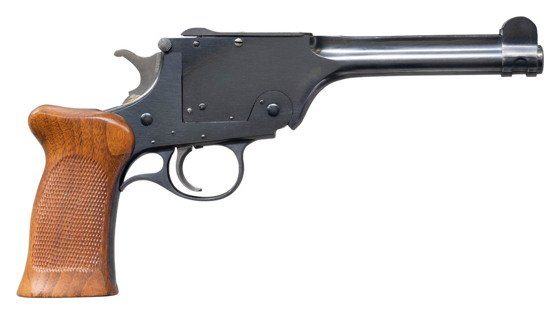 Cal. 22 LR. S# 1843 (Under grip). Bbl. 7". Blade front sight with sight protector. Adjustable rear sight. Grooved trigger & "USRA" on left side. Blued finish. Checkered walnut grips. CONDITION: grips show a few handling marks. Metal retains 97% original blue with some light edge wear, a spot of minor fading to gray on trigger guard & some light freckling on grip strap. Action functions properly when hand cycled. Bright near excellent bore. (25-6727/MJC). CURIO. $900-1,400.