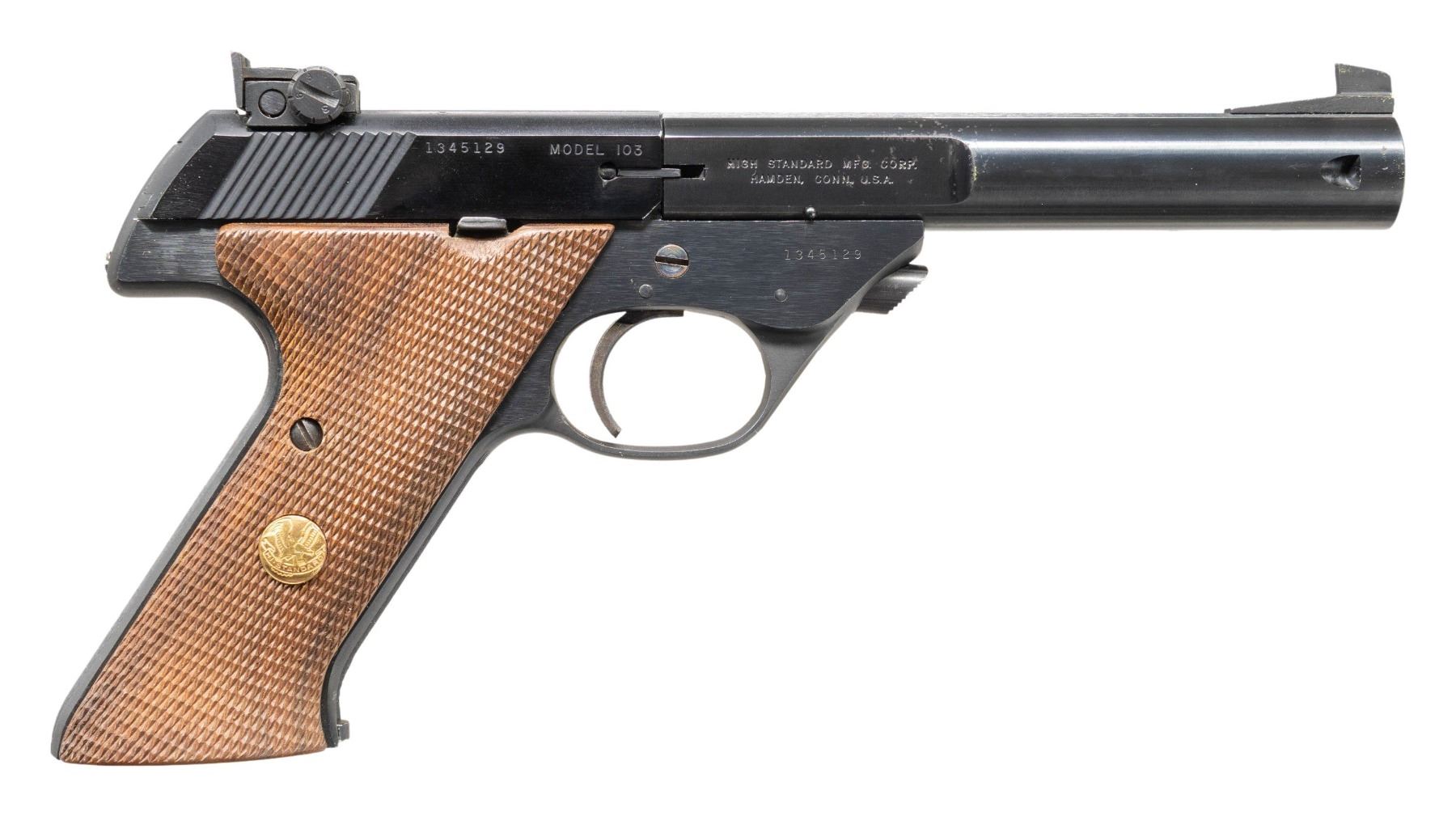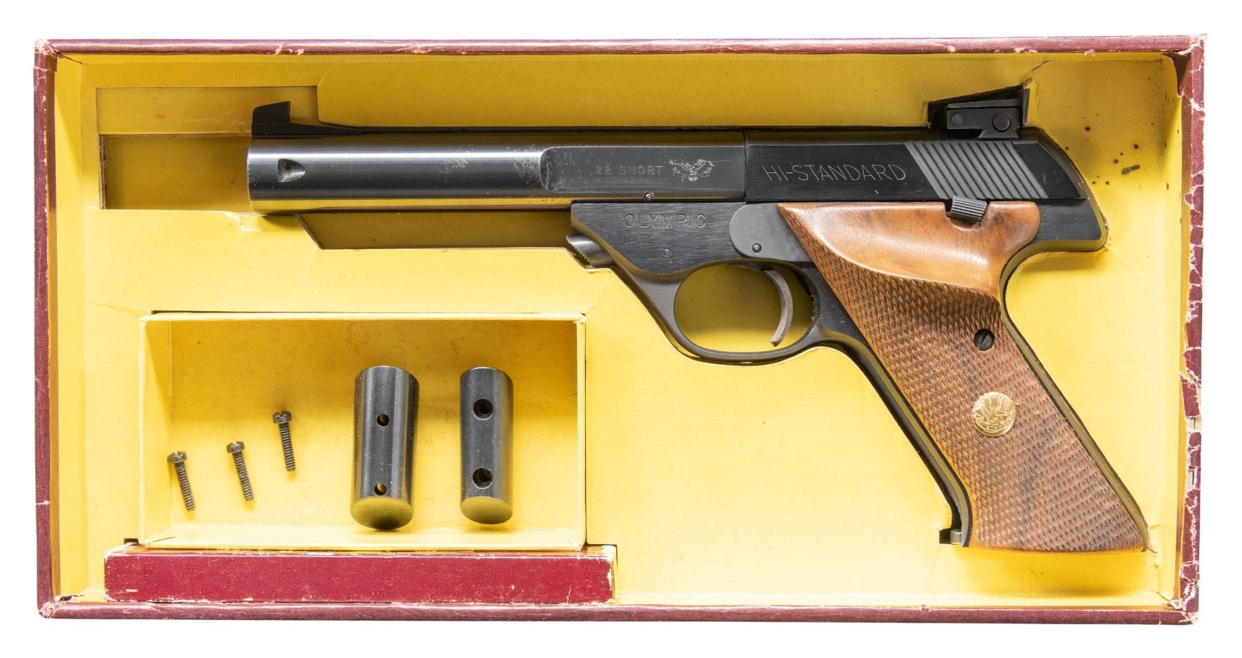 TARGET PISTOL. Cal. 22 Short. S# 1345129. Bbl. 5 1/2" heavy with adjustable ramp front sight & fully adjustable rear. Bbl. is factory drilled & tapped for bbl. weights, filler screws present. 2 Piece checkered walnut thumb rest grips. MAGS: 2-10 rd., one in original box. UNATTACHED ACCESSORIES: 2 Piece maroon Hi Standard box containing instructions and 2 bbl. weights. CONDITION: metal retains 95% original blue with lightly scattered peppery surface oxidation. Very good grips show no noticeable wear. Near excellent bore. PROVENANCE: From the Buckstix Collection. (25-3617/BH). CURIO. $700-1,000.