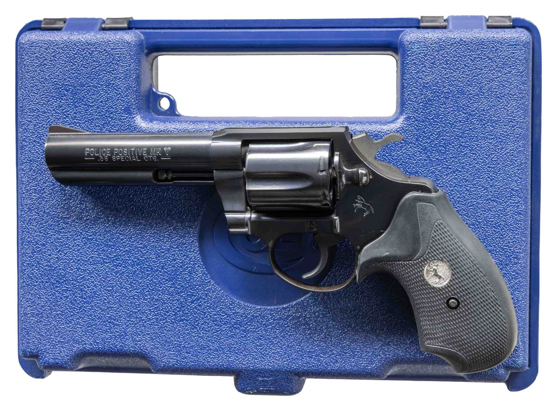 REVOLVER. Cal. 38 Spl. S# RD0544. Bbl. 4". Police Positive MK V double action revolver mfg. by Colt in 1993. Left side of the bbl. is marked with the model and cal. designations, with Colt's single line address marked on the right. Left side of the frame is marked with the Rampant Colt logo. Metal components exhibit a blue finish overall, save for on the sides of the hammer, which are polished in-the-white. Frame is mounted with a 1-piece Colt silver medallion checkered grip. Blade front sight with frame square notch rear sight. UNATTACHED ACCESSORIES: factory blue plastic hard case. CONDITION: fine, with metal components retaining virtually all of their original factory finish overall. Cyl. bears a light dragline. Sides of hammer show some spots of light oxidation. Mirror bore, retaining well defined rifling throughout. Proper manual mechanics. Grip is excellent overall. (25-5103/MLW). MODERN. $1,000-1,500.