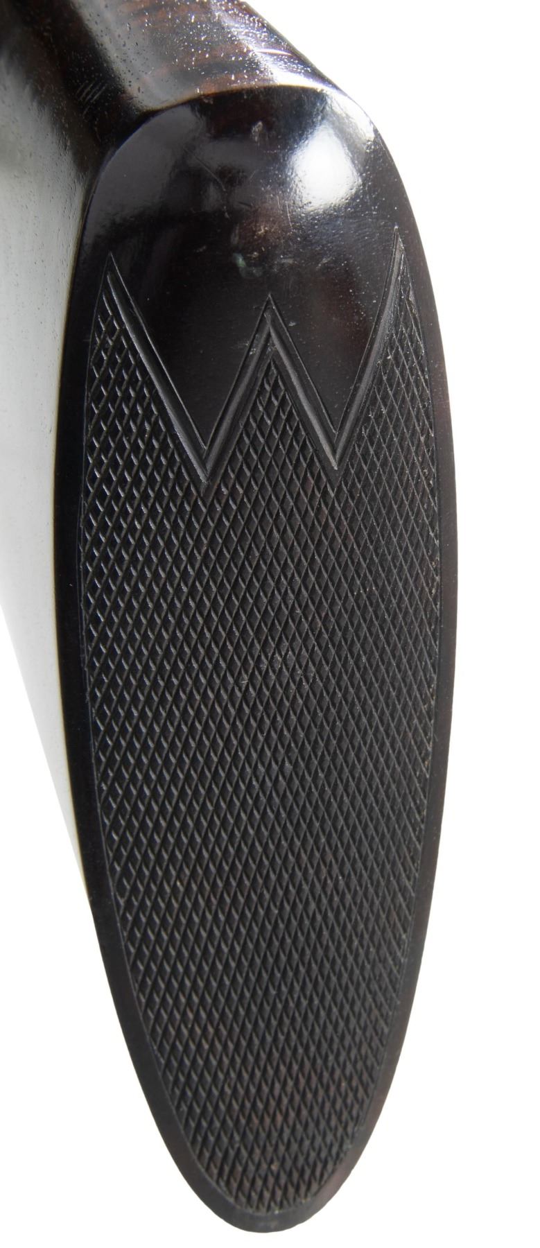 HAMMER GUN WITH SCARCE DAW LEVER ACTION. Cal. 12 Ga. 2-3/4". S# 10321. Many feel that the bar-in-wood hammer gun is the most elegant breechloading shotgun ever produced. Other people believe that the addition of engraving on a fine gun only hides the evidence of fine gunmaking. This best, plain finish gun has 30" three striped Damascus barrels engraved "J. Purdey & Sons 314 1/2 Oxford Street. London." on very narrow swamped game rib. Rear portion of rib is engraved "CHOKE". Barrel flats are stamped with London black powder proofs "NOT FOR BALL" and with chokes "12B 13M" both barrels. Chambers measure 2-3/4" and do not appear to have been lengthened. Bar-in-wood action has fences filed in best quality manner and is fitted with front spring locks having serpentine rebounding hammers. Action has Purdey type underbolts actuated by a lever over guard of a type the factory refers to as "Daw lever" which gives superior hand access compared to either the normal top lever or the, popular at the time, "thumb hole". Action, locks and hammers are unengraved except for maker's name on each lockplate and "Patent" on top. Trigger plate has ball finial and trigger guard is engraved with S# on tang. Bar-in-wood buttstock, so called because wood runs under lockplates almost all the way to the hinge pin covering most of the action bar (structural part connecting hinge and standing breech); made of well marbled and stump figured European walnut measures 14-7/8" over 2-3/4" lengthening piece fitted to the original curve of the stock (consignor states factory records indicate this gun was originally made with approx. 12-1/2" LOP). This lengthening piece is exceptionally well fitted and grain matches very well. Butt is correctly shaped and nicely checkered in correct Purdey fashion. Point pattern checkering is at grip and a silver oval on toeline is monogrammed "CFB" (?). Oval is set at the usual distance of approx. 3" from original toe of stock. Matching splinter forend has Anson release. MEASUREMENTS: BBLS: Bore Diameter: L .730. R .731. Restriction: L .027 (IMod). R .025 IMod). Wall thickness: L .024. R .026. STOCK: DAH: 2-3/16". DAC: 1-1/2". CAST: about 1/2" off. LOP: 14-7/8". WEIGHT: 7 lb. 7 oz. CONDITION: very good to fine. Barrels retaining most of their original brown with scattered light pin prick pitting mostly at carry point. Action and lockplates retain a good amount, perhaps 40% case hardening color, the remainder a smooth mottled brown. Trigger guard retains some original bright blue mostly where protected by lever. Stocks retain their original surfaces having added oil with addition of lengthening piece. Checkering shows considerable wear especially on forend. Bar-in-wood guns are notorious for stock problems especially around action; this example is exceptionally good without any noted cracks or other problems. Forend shows some minor chipping and loss of wood along edges. Bores are mostly bright and smooth with some minor pitting evident in right barrel toward breech end and dent removal also in right barrel about 14" from muzzle. Action is tight. Barrels on face. Locks are crisp. Screw slots show little use. This gun should make a great shooter. (01-27222/MGM). ANTIQUE. $5,000-8,000.