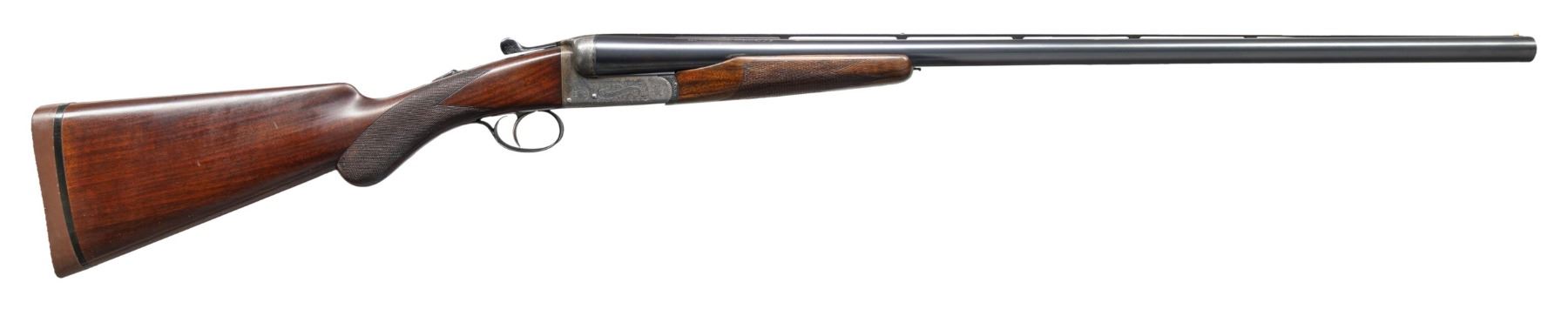 BOXLOCK EJECTOR SINGLE TRIGGER VENT RIB BEAVER TAIL PIGEON OR TRAP GUN WITH CASE. Cal. 12 Ga. 2-3/4". S# 6885 (1962). The 28" dovetailed barrels with matted ventilated rib are engraved "E.J. Churchill (Gunmakers) Ltd" "Orange St. Gunworks Leicester Square. London." on tops. Barrel flats are stamped with London nitro proofs for 2-3/4" chambers. Case hardened boxlock action has automatic safety, sliding third fastener which engages short rib extension and single non- selective trigger. Action is engraved with 70% coverage rose and scroll with "E.J. CHURCHILL" in ribbon on each side. Blued floor plate is engraved "Regal". Double beaded small bow trigger guard has S# on tang. Nicely streaked dense European walnut round knob pistol grip buttstock measures 14-1/8" over solid brown basket weave pad. Point pattern checkering is at grip. Matching short beavertail ejector forend has Anson release. MEASUREMENTS: BBLS: Bore Diameter: L .727. R .727. Restriction: L .020 (mod). R .010 (IC). Wall thickness: L .030. R .034. STOCK: DAH: 2-1/16". DAC: 1-7/16". CAST: neutral. LOP: 14-1/8". WEIGHT: 7 lb. 12 oz. UNATTACHED ACCESSORIES: gun is housed in its original leather "VC" case with stitched leather corners. Interior is lined in burgundy cloth and has burgundy Churchill label in lid. Case contains two piece brass and walnut cleaning rod. CONDITION: very fine as mostly refinished. Barrels retaining nearly all of a professional re-black with subsequent silvering on rib and sides from contact with forend. Action retains most of its original case hardening color with some cleaned stains. Top lever, forend iron, floor plate, trigger plate and trigger guard re-blued and retain nearly all of that blue. Engraving slightly softened. Stocks retain nearly all of an older oil refinish with some scattered subsequent marks. Bores are bright and shiny. Action is tight. Ejectors are in time. Mechanical three pull trigger is good. Case leather has considerably darkened and has many stains. Interior cloth is good with some rubs. Label is very fine. A good solid gun configured for the American market. (25-5636/MGM). CURIO. $3,000-5,000.