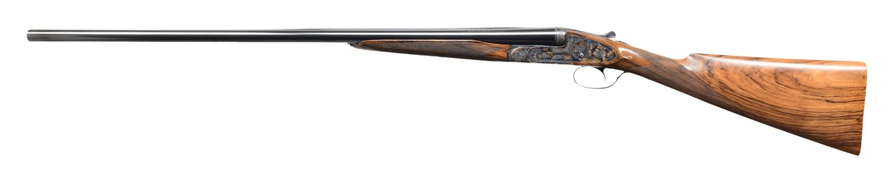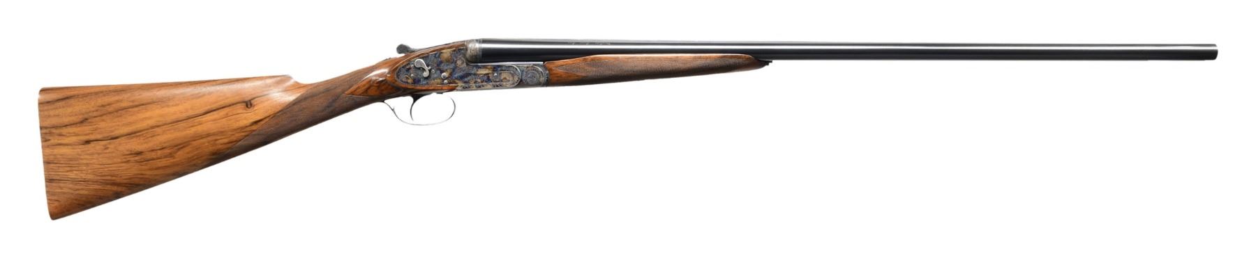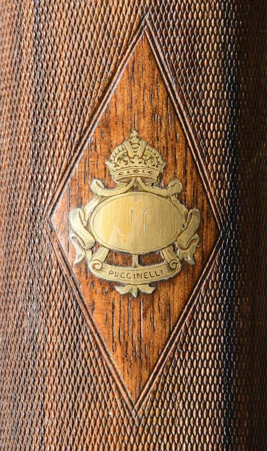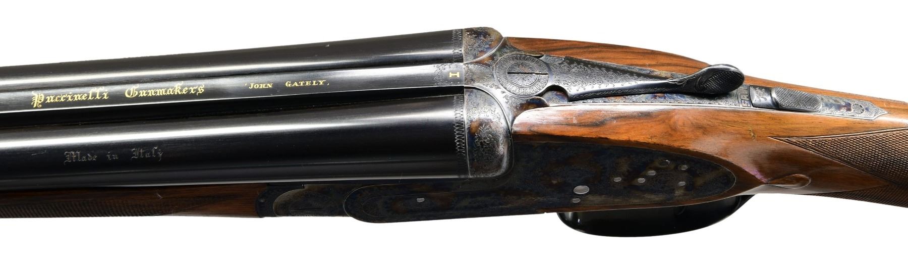 SHOTGUN. Cal. 20 ga. 2 3/4". S# 29304. Barrel I. 28". Barrel II. 26". Both sets of bbls. have concave ribs & steel front beads. Ribs have gold inlaid marking "Puccinelli Gunmakers" & "John Gately.". Right bbls. are marked "Peerless Game Gun". Water table, bbls. & case colored action are marked "Famars". Features include hand detachable locks, selective ejectors & single non-selective triggers. Action has generous coverage of fine English rose & scroll engraving. Breech end of bbls. have scroll highlights. Trim beavertail forearm features ANSON release w/ gold crestplate marked "Puccinelli". Straight hand stock of fine darkly streaked thinshell walnut w/ teardrop points. 24 LPI point pattern hand checkering. LOP: 14 1/4" to checkered butt. DAC: 1 1/2". DAH: 2". Near neutral cast. Barrel I. Bore diameter: R .625 L .625. Choke constriction: R .018 L .024. Minimum wall thickness: R .032 L .034. Barrel II. Bore diameter: R .625 L .625. Choke constriction: R .009 L .009. Minimum wall thickness: R .035 L .035. WEIGHT: 6 lbs, 3 oz. Bbl. flats are marked w/ 1972 Italian nitro proofs. UNATTACHED ACCESSORIES: leather covered 2 bbl. set case w/ green velour fitted interior. Lid interior has Leonard Puccinelli label. Case contains 2 piece cleaning rod & cleaning accessories. CONDITION: both bbls. retain over 98% original blue & near excellent bores. Action has 97% case colors showing slight edge wear. Wood has lightly worn finish showing scattered small marks. Action is tight & on face. (24-2169/DS). CURIO. $7,000-12,000.