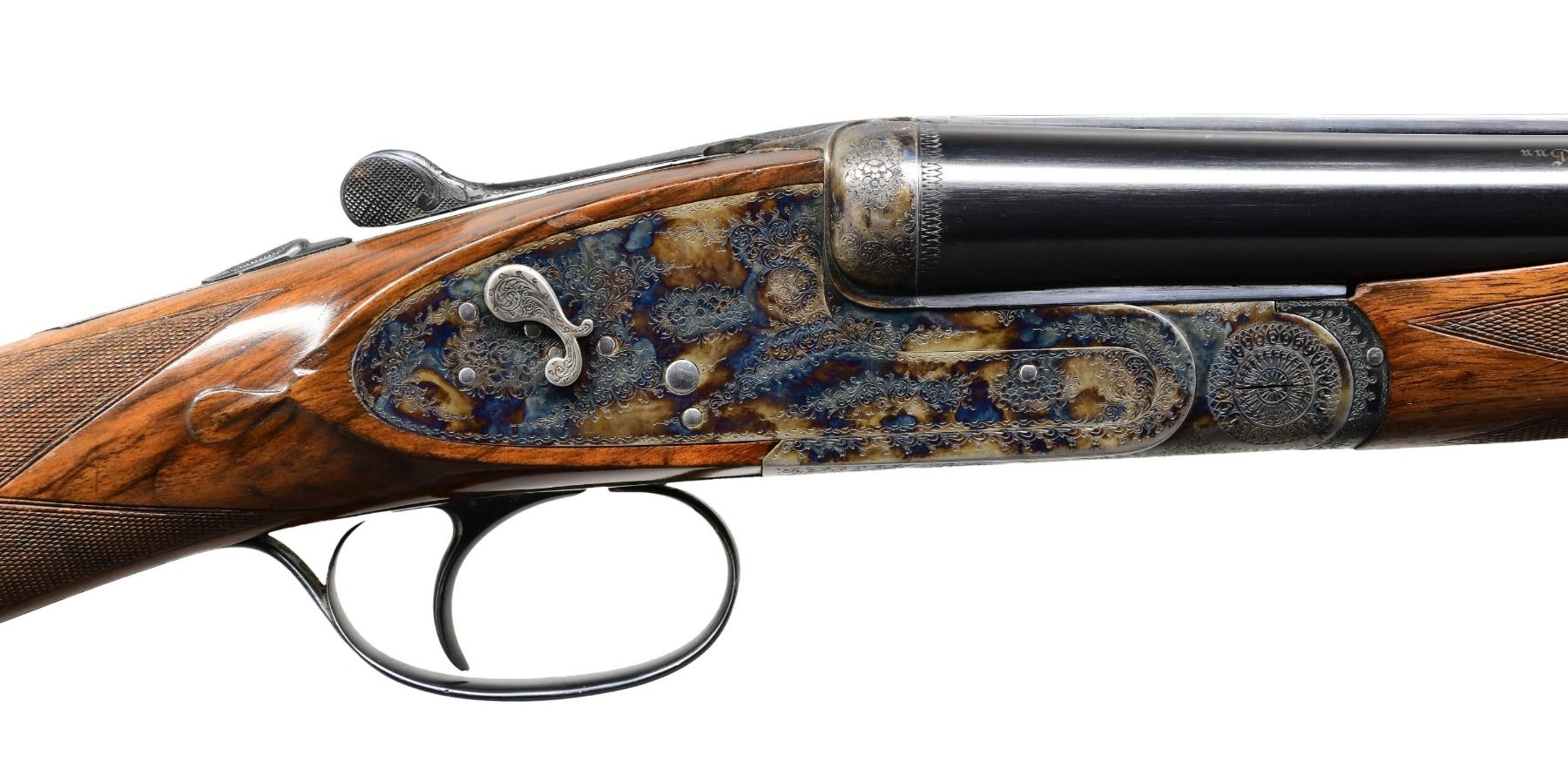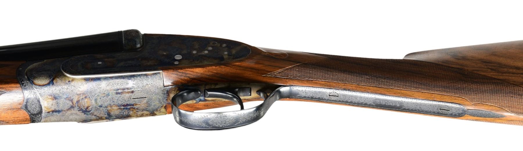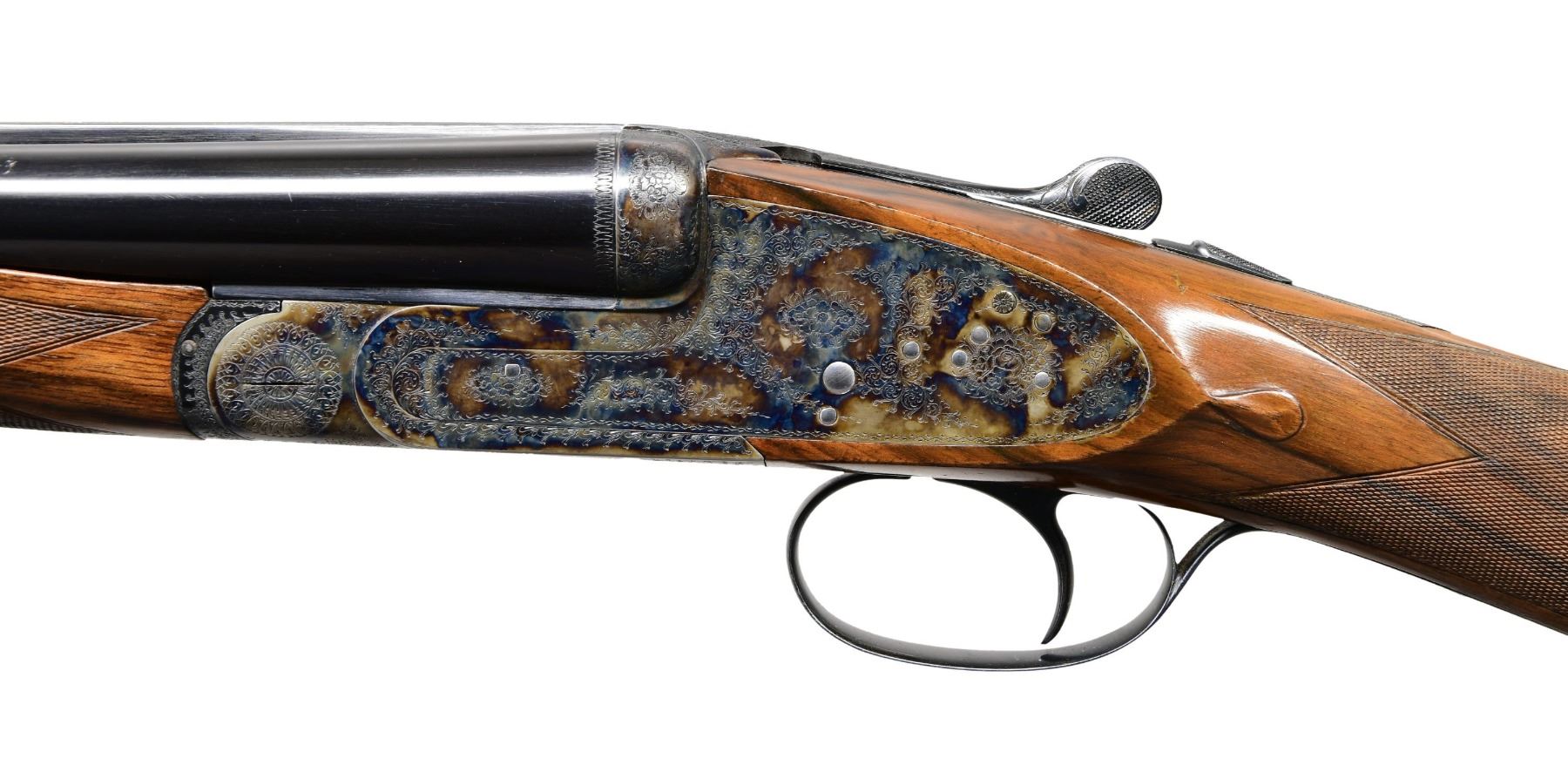 SHOTGUN. Cal. 20 ga. 2 3/4". S# 29304. Barrel I. 28". Barrel II. 26". Both sets of bbls. have concave ribs & steel front beads. Ribs have gold inlaid marking "Puccinelli Gunmakers" & "John Gately.". Right bbls. are marked "Peerless Game Gun". Water table, bbls. & case colored action are marked "Famars". Features include hand detachable locks, selective ejectors & single non-selective triggers. Action has generous coverage of fine English rose & scroll engraving. Breech end of bbls. have scroll highlights. Trim beavertail forearm features ANSON release w/ gold crestplate marked "Puccinelli". Straight hand stock of fine darkly streaked thinshell walnut w/ teardrop points. 24 LPI point pattern hand checkering. LOP: 14 1/4" to checkered butt. DAC: 1 1/2". DAH: 2". Near neutral cast. Barrel I. Bore diameter: R .625 L .625. Choke constriction: R .018 L .024. Minimum wall thickness: R .032 L .034. Barrel II. Bore diameter: R .625 L .625. Choke constriction: R .009 L .009. Minimum wall thickness: R .035 L .035. WEIGHT: 6 lbs, 3 oz. Bbl. flats are marked w/ 1972 Italian nitro proofs. UNATTACHED ACCESSORIES: leather covered 2 bbl. set case w/ green velour fitted interior. Lid interior has Leonard Puccinelli label. Case contains 2 piece cleaning rod & cleaning accessories. CONDITION: both bbls. retain over 98% original blue & near excellent bores. Action has 97% case colors showing slight edge wear. Wood has lightly worn finish showing scattered small marks. Action is tight & on face. (24-2169/DS). CURIO. $7,000-12,000.