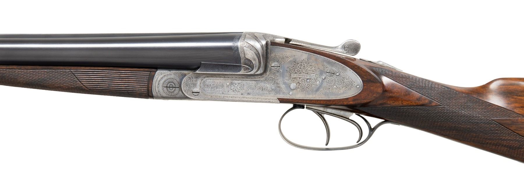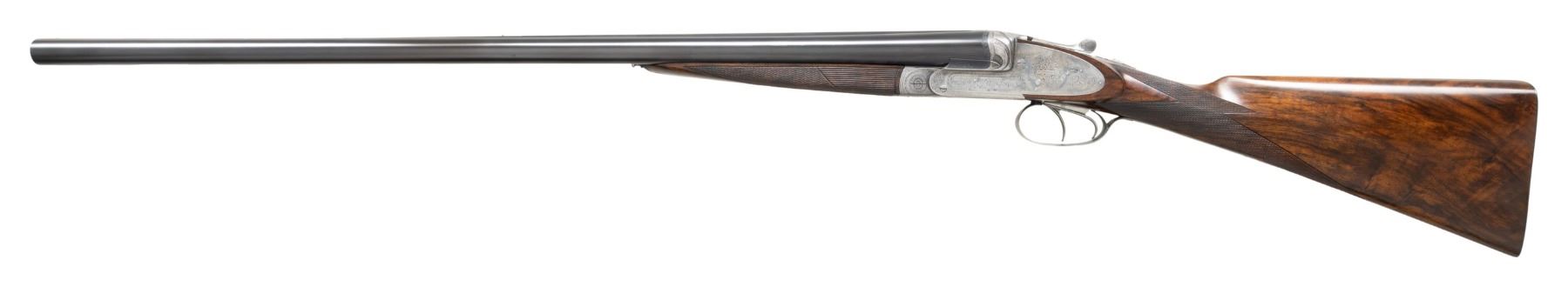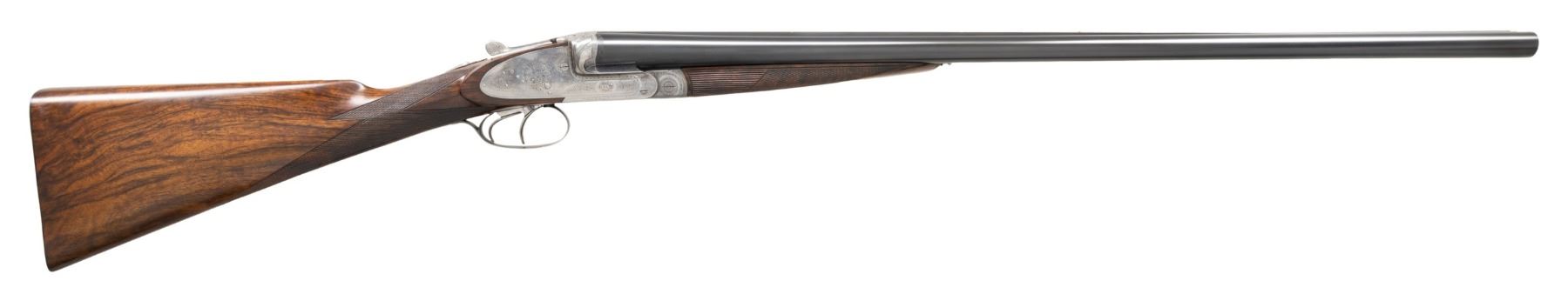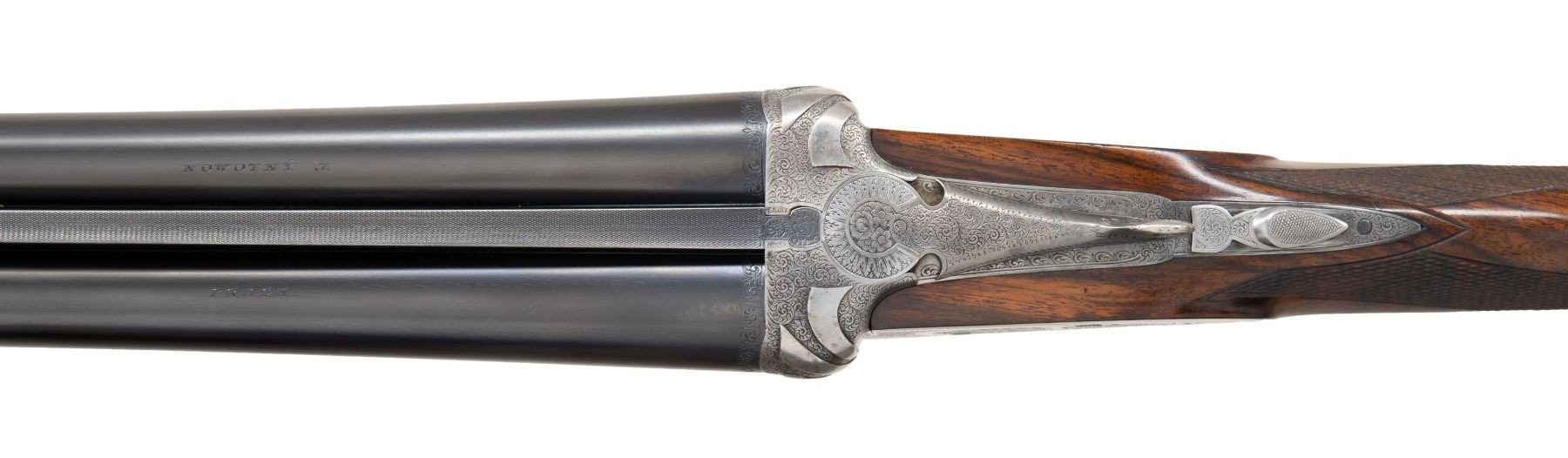 Cal. 12 Ga. 3". S# 15496 (1915). This beautifully made gun has 28-3/8" dovetailed steel barrels with narrow raised matted rib holding two white beads. Tops of barrels are engraved "NOWOTNY J." on right and "PRAGA." on left. Barrel flats are stamped with 1915 Prague nitro proofs and Nowotny crowned initials. Bottoms of barrels are stamped with steel type and S#. Robust coin finished sidelock action features non-automatic safety, pivoting third fastener engaging dolls head rib extension, bushed strikers, side clips and double triggers (front articulated). Action is nicely filed and fences are decorated with three sweeping relief ribbons with small scroll engraving as background. Action and lockplates are engraved with fine Viennese scroll surrounding floral bouquets with "NOWOTNY. J." on ribbon through central bouquet of left lockplate and "PRAGA" on right. Trigger guard with matching scroll has S# on tang. Nicely marbled dense European walnut straight grip buttstock measures 14-3/8" over skeleton steel buttplate. Nicely cut borderless point pattern checkering is on diamond hand. Matching splinter ejector forend with Anson release is checkered with rear side panels having longitudinal grooves. MEASUREMENTS: BBLS: Bore Diameter: L .721. R .721. Restriction: L .040 (full). R .025 (mod). Wall thickness: L .032. R .029. STOCK: DAH: 1-5/8". DAC: 1-3/8"+. CAST: about 1/4" off. LOP: 14-3/8". WEIGHT: 7 lb. 6 oz. CONDITION: very fine as mostly refinished. Barrels with nearly all of a fine re-black. Action lightly cleaned leaving traces of original French gray finish, mostly seen on lockplates. Trigger guard re-blued and has subsquent wear. Stocks with fine oil refinish; checkering nicely re-cut. Bores are bright and shiny without noted problems. Forcing cones have been lengthened. A great gun by this celebrated maker. PROVENANCE: From the Private Collection of Berrien Moore III. (25-6020/MGM). CURIO. $3,000-6,000.