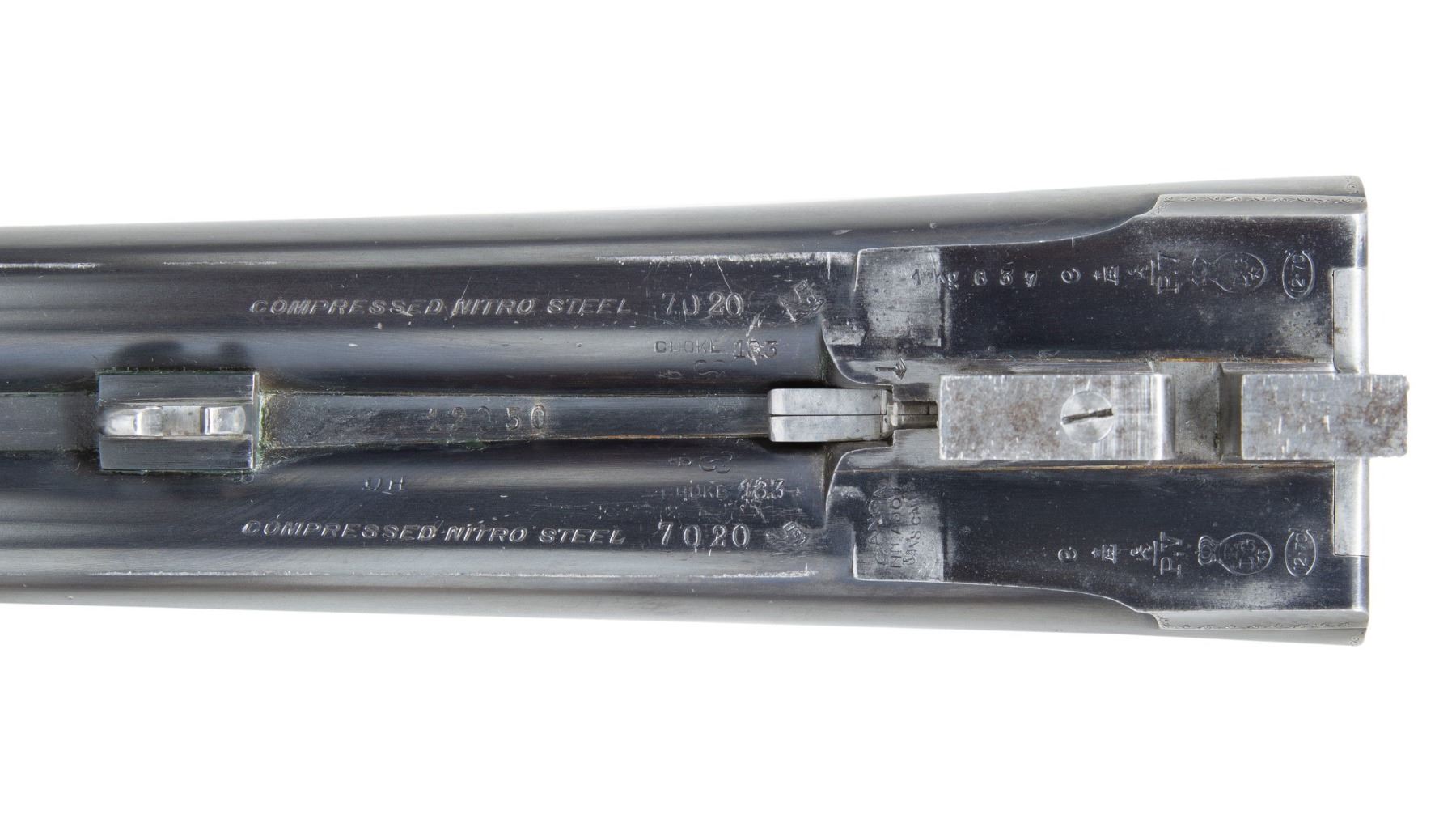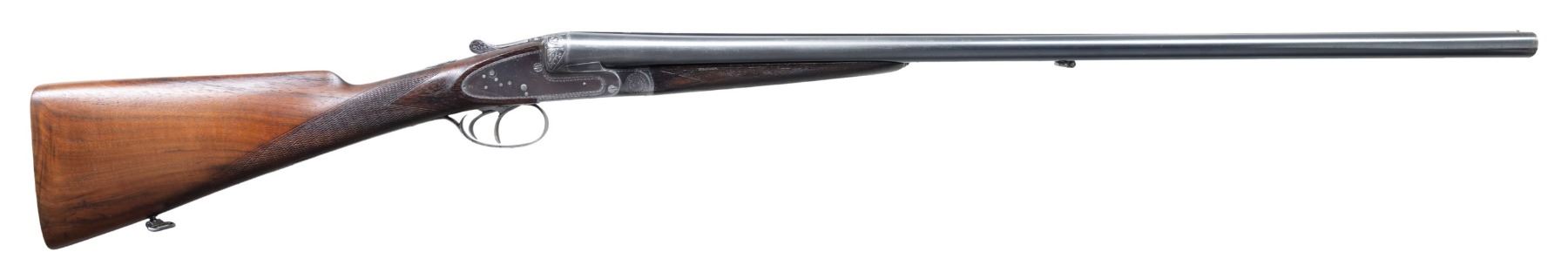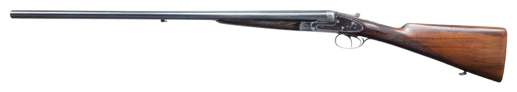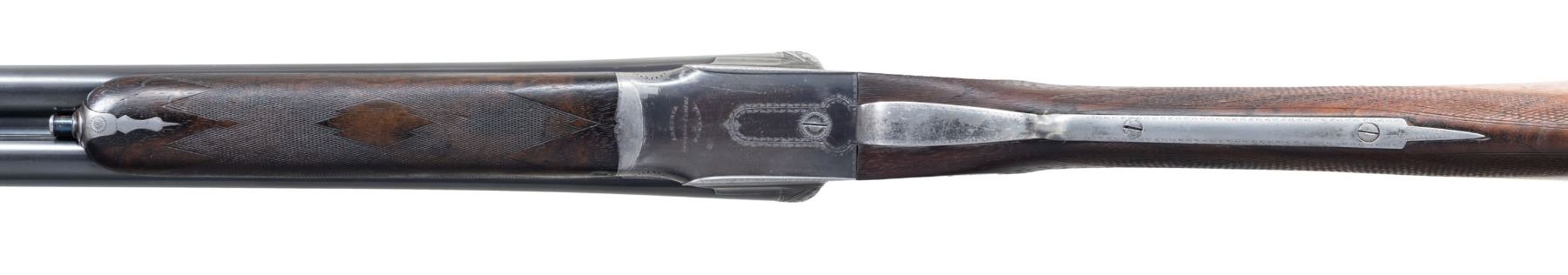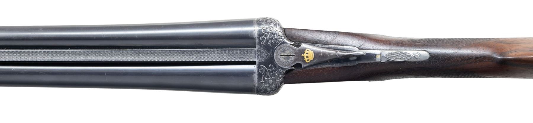 LAJOT WITH SUPERB RELIEF ENGRAVED FENCES. Cal. 12ga. 2-3/4". S# 12050 (1926). Barrels 29-5/8" well struck, dovetailed, with slightly raised matted rib are marked "Fabrication Speciale Pour Tir Aux Pigeons" "N. Lajot & Cie a Liege" on side of left barrel. Barrel flats stamped with 1926 Belgian Nitro proofs for 2-3/4" chambers. Robust blued sidelock action features non-automatic safety, hidden third fastener, bushed strikers, side clips & double triggers (front articulated). Action and lockplates have only line and small scroll border engraving with some small geometric work around hingepin. Bottom of action is engraved "Armeria" "Attilio Cimini" "Ferrara". Fences have very high quality deep relief carving of leaves, blossoms and some ribbons. A gold sovereign's crown is inlaid on top lever. Thumbpiece is also relief engraved with blossom and leaf. Newer straight grip buttstock of lightly streaked European walnut measures 14-1/4" over serrated wood butt. Point pattern checkering is at grip. Matching broad splinter forend with original wood and checkering has Anson release. MEASUREMENTS: BBLS: Bore Diameter: R .729. L .729. Restriction: R .045 (EXTRA FULL). L .044 (EXTRA FULL). Min. Wall Thickness: R .026. L .032. STOCK: DAH: 1-11/16". DAC: 1-1/4". LOP: 14-1/4". CAST: neutral. WEIGHT: 7 lb. 15 oz. CONDITION: good as partially refurbished. Barrels and action retaining most of their original blue with silver highlights from normal hand wear, newer buttstock retains most of its poor quality oil finish. Forend is original, nearly devoid of finish, checkering considerably worn and has worn through on left side. Bores are bright and shiny; no noted problems. Action is tight. Barrels are on face. Ejectors are in time. Crack in buttstock running from top center left lockplate up toward hand pin; crack does not flex. An incredibly well made gun. (25-2478/MGM). CURIO. $1,500-2,500.