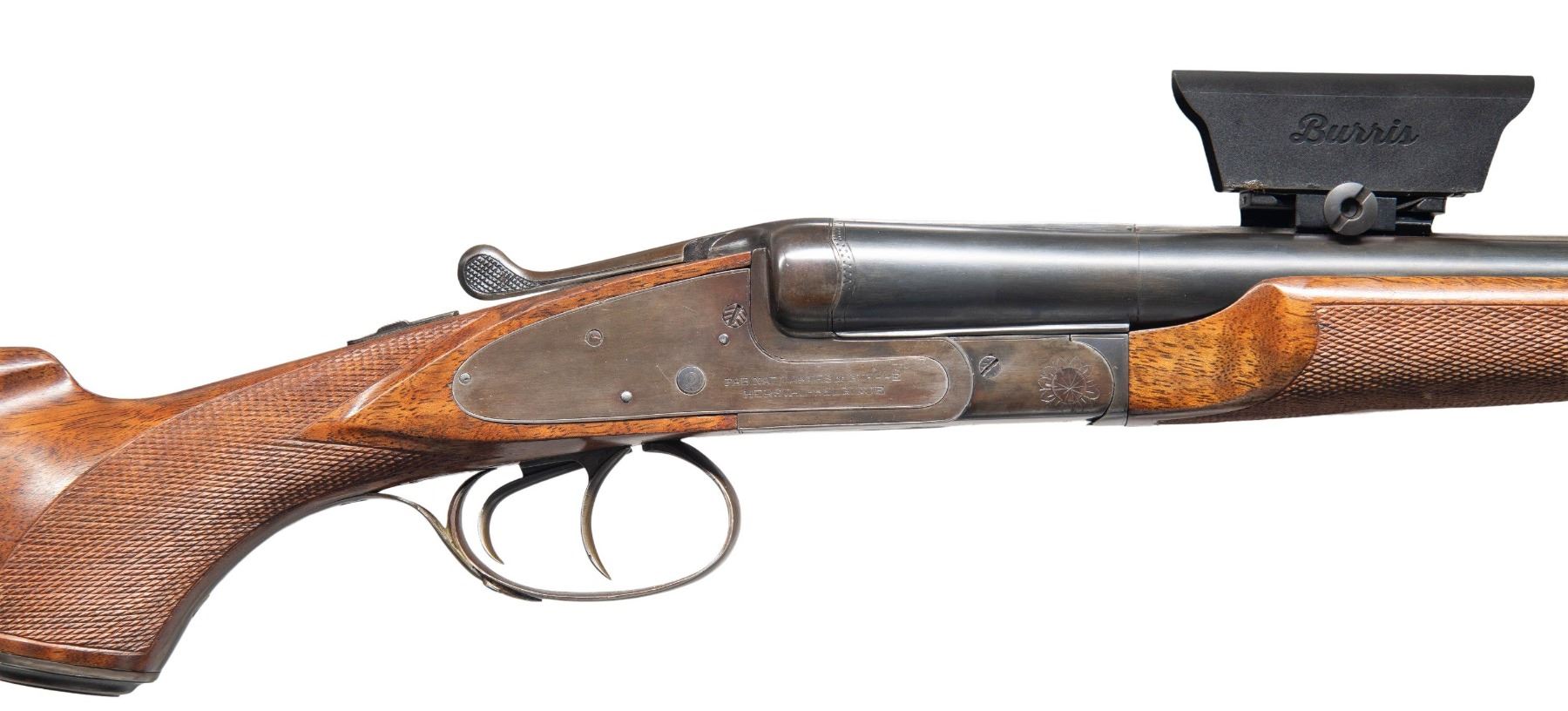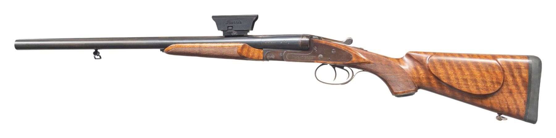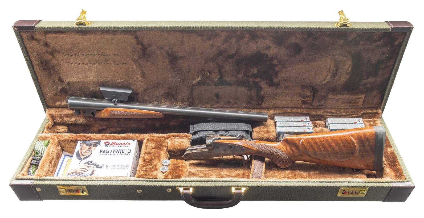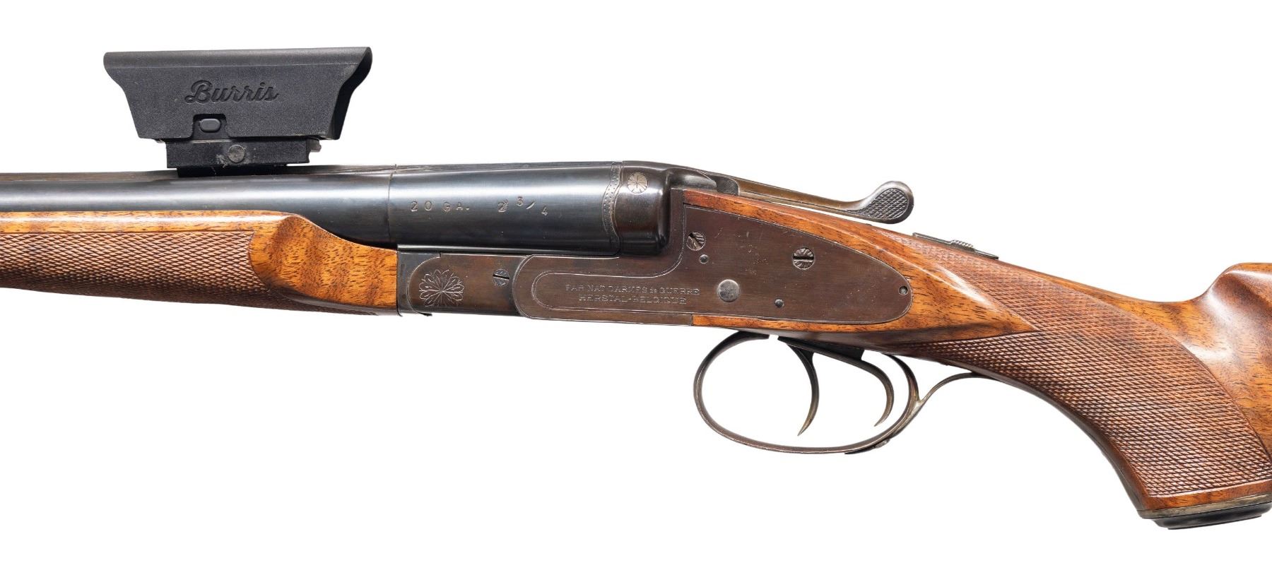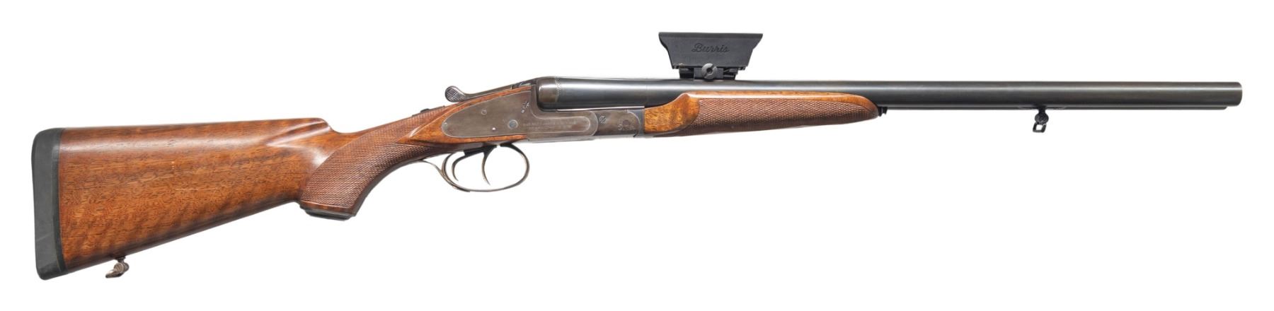 SHOTGUN WITH CASE. Cal. 20 GA Slug, 2 3/4". S# 12253. Bbl. 19 15/16". Originally mfg. as a 16 GA SxS sidelock shotgun in Belgium by Fabrique Nationale, this example was later customized and converted by Bob Hynden to fire 20 GA slug ammunition. Sideplates are marked "FAB. NAT. D'ARMES de GUERRE/ HERSTAL-BELGIQUE". Bbl. rib is marked with FN's mfg. information, with an added "20 GA. 2 3/4" marked on the side of the left bbl. Bbl. flats exhibit various Belgian proofs (as well as a Czech Weipert Proof House bow and arrow proof), with the left bbl. flat exhibiting an added "LYMAN 350 SLUG", and an added "21 GR. UNI. CLAYS" on the right. Receiver and sideplates feature single line border engraving, with floral motifs engraved on and extending from the hinge bolt and vertical bolt. Trigger guard features a raised acorn at the rear of the bow. Metal components exhibit a reapplied cold blue finish overall. Custom checkered wood beavertail forearm (with original iron), with checkered wood pistol grip buttstock featuring a blued steel grip cap, left hand cheekpiece, black synthetic spacer, as well as a Hogue black rubber recoil pad. Upper edges of recoil pad have been ground down for a more rounded contour. Toeline of stock features a lanyard stud and swivel, with the bbl. exhibiting an added stud base and swivel. Bbl. has been shortened, rifled, as well as drilled and tapped with 3 sets of plug screws, the rear most set being mounting with a small picatinny rail featuring a Burris FastFire 3 red dot sight. Double triggers with tang mounted safety. Matching numbers are present on the receiver and forearm iron. Bbls. are unnumbered. UNATTACHED ACCESSORIES: Cabela's leather and green canvas wrapped hard case containing a bore snake, Fastfire 3 box, x2 snap caps, x5 5-rd. boxes of Federal 20 GA, 2 3/4" Sabot Slug ammunition (x4 full boxes, x1 box with 2-rds. remaining, x22-rds. total), as well as an unmarked velcro bandolier belt pouch containing 10-rds. of additional ammunition. CONDITION: metal components retain large amounts of their cold blue finish, exhibiting some scattered superficial handling marks, as well as areas of wear and thinning that are fading to a brown patina. Mirror bores, exhibiting some hardened firing residue towards the muzzles, while retaining strong rifling throughout. Proper manual mechanics. Wood furniture shows a few scratches and superficial marks from handling and storage, but otherwise remains sound. Red dot sight is functional and retains a clear optic. PROVENANCE: From the Buckstix Collection. (25-6364/MLW). MODERN. $1,000-1,500.