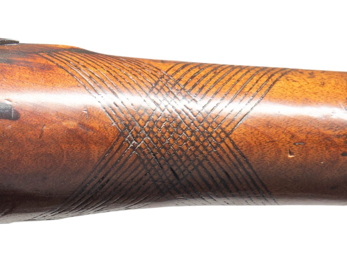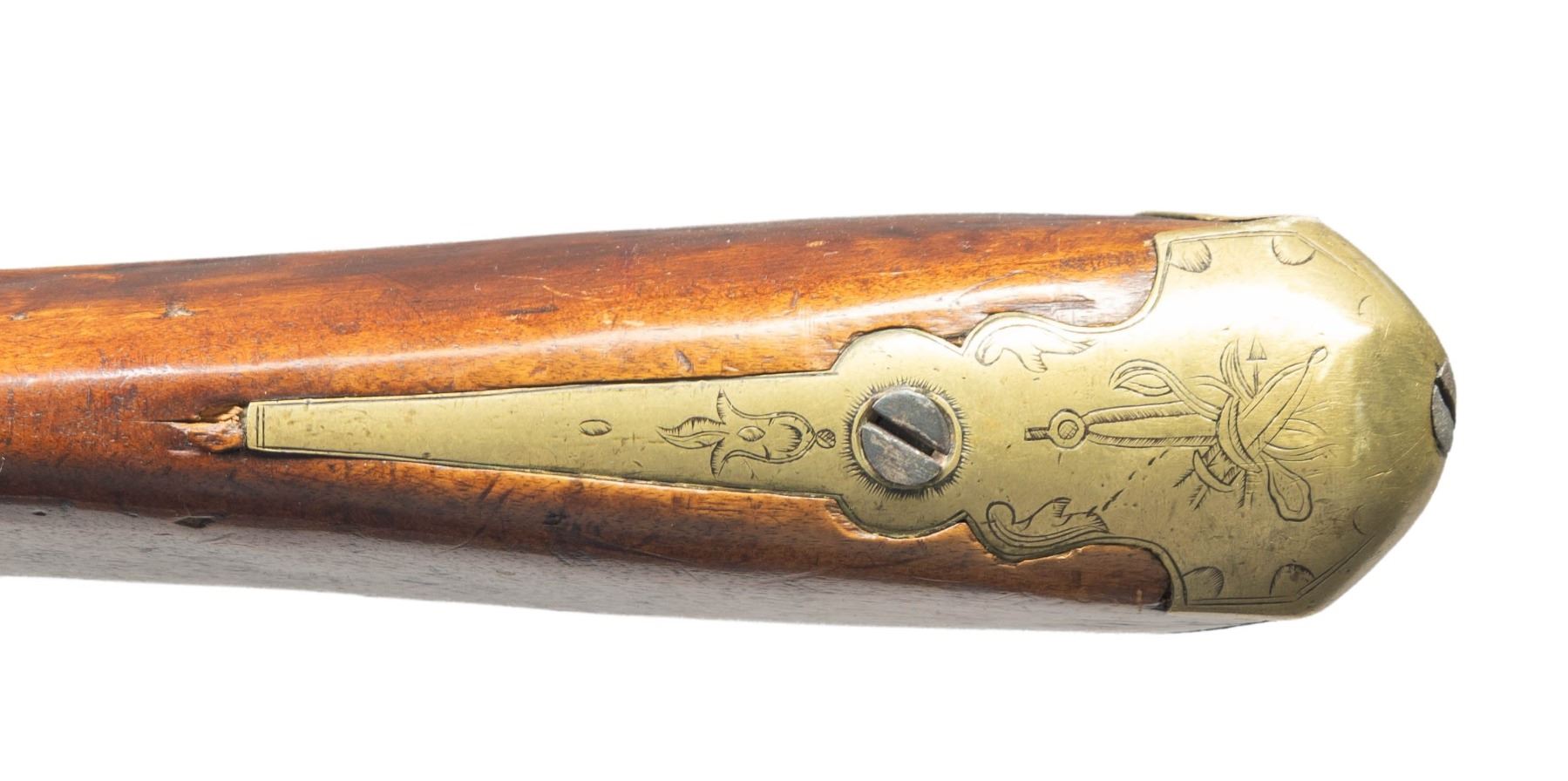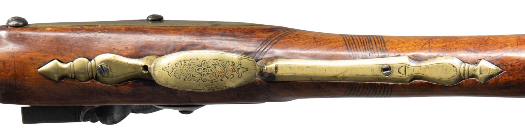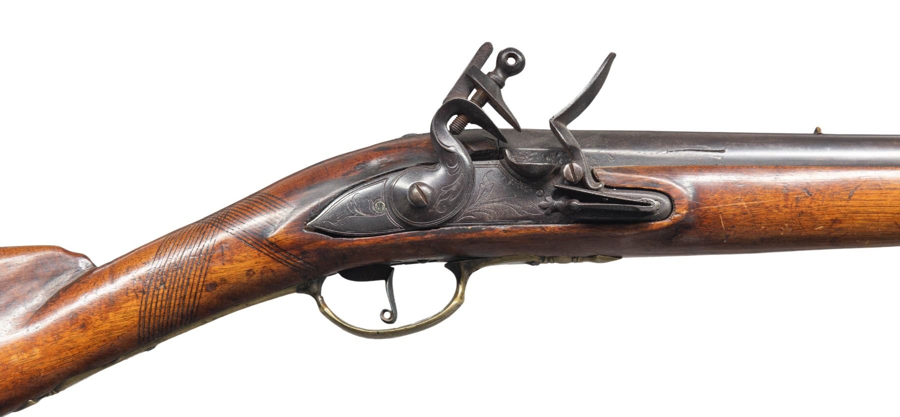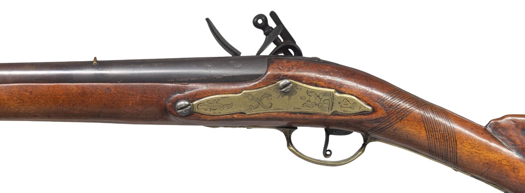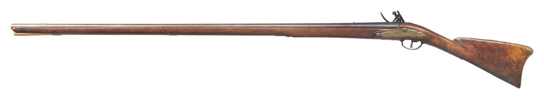 Cal. 65. NSN. 63" overall, 46.5" tapered barrel with London commercial proofs, brass inset sights, engraved brass trigger guard, sideplate and buttplate, early chamfered engraved lock, unsupported engraved serpentine cock, unbridled frizzen, full stock with checkered wrist. CONDITION: very good overall, appears complete and original, smooth iron patina, stock is sound with hand worn patina, brass with light mustard patina, mechanics fine, smooth dirty bore. PROVENANCE: Estate Collection of Nicholas Apergis. (01-27458/JS). ANTIQUE. $3,000-5,000.