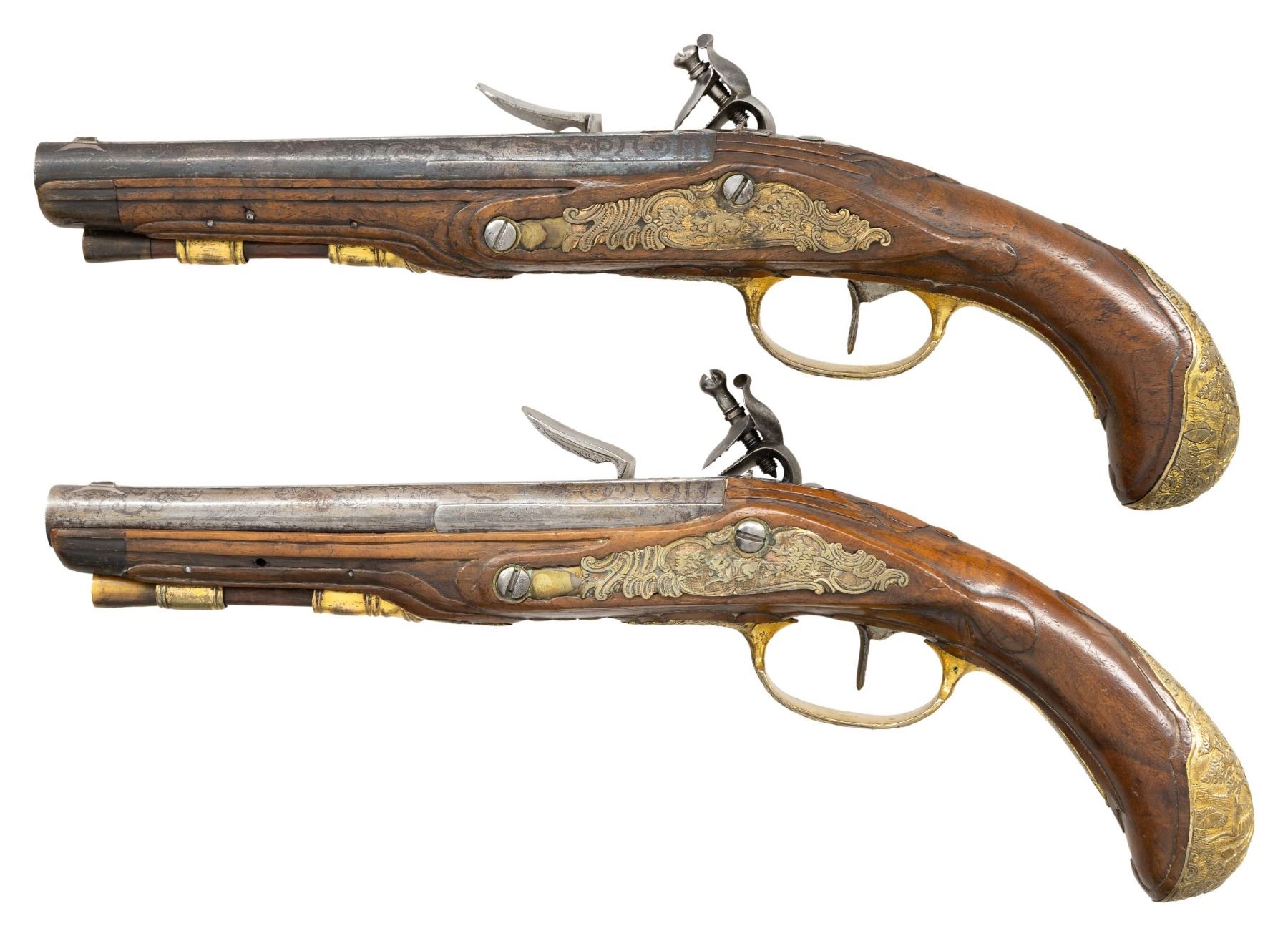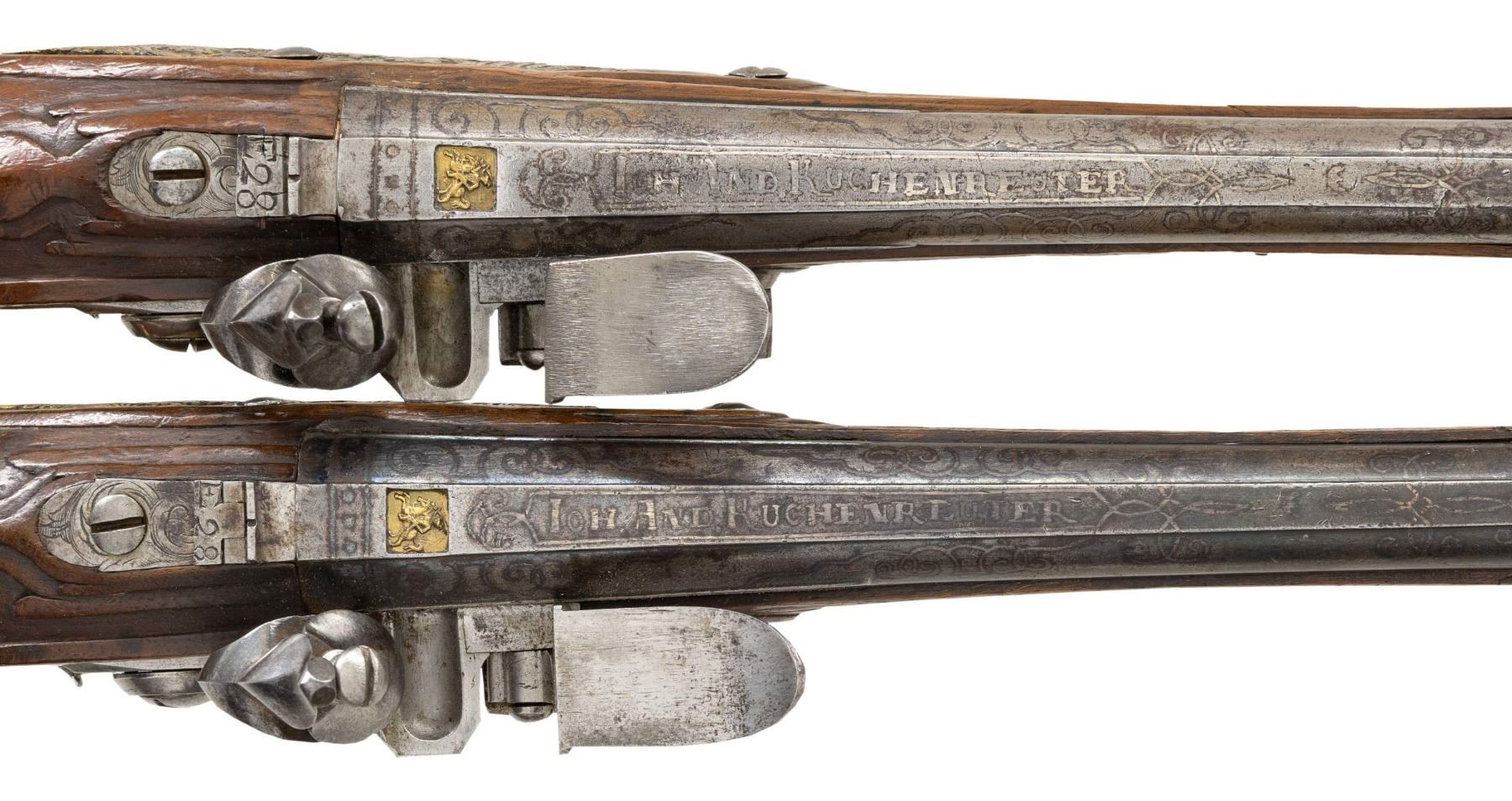 WITH BARRELS BY KUCHENREUTER. Cal. 45 (both). S# NSN (both). The 6-3/8" file decorated swamped and rifled barrels are silver inlaid "Ioh. And. Kuchenreuter" on top flats in front of square gold poincon with horse and rider (definitely the mark of Johann Andreas the elder 1716-95). "V" notch rear sights on barrel tangs have flip-up second leaves marked "E28". Other silver inlays on barrels consist of simple scrolls from breech to flared muzzles with silver beads. Locks with deeply chamfered flat plates having rebated tails are fitted with serpentine cocks with small back sliding safetys, inset faceted pans, unbridled friction frizzens and feather springs with nicely filed bulbous finials. The backs of frizzens are nicely relief engraved. "HESS. A" "ZWEYBRUCKEN" is at the center of each lock (The Hess family of gunsmiths worked in Zweybrucken in the early to late 18th century, an "A" family member is not listed.). Stocks with birds head grips extend to muzzles with horn caps and are gilded bronze mounted. Nicely carved mouldings surround all elements. Mounts are Viennese in style with relief cast decoration of scrolls, trees and some animals. A jaeger is portrayed on trigger guard bows. Walnut ramrods with horn tips mount through gold plated bronze beaded pipes and matching thimbles. CONDITION: very fine. Metal with very old lightly cleaned surfaces with only some very light pin prick pitting. Stocks with most of their original finish with many marks and dings. Furniture retains most of its original gilding. Scratch rifled bores are very fine. Locks are good. Safetys not working. No noted cracks or loses to stocks. A very nice pair of early pistols. PROVENANCE: Estate Collection of Nicholas Apergis. (01-27506/MGM). ANTIQUE. $3,000-4,000.