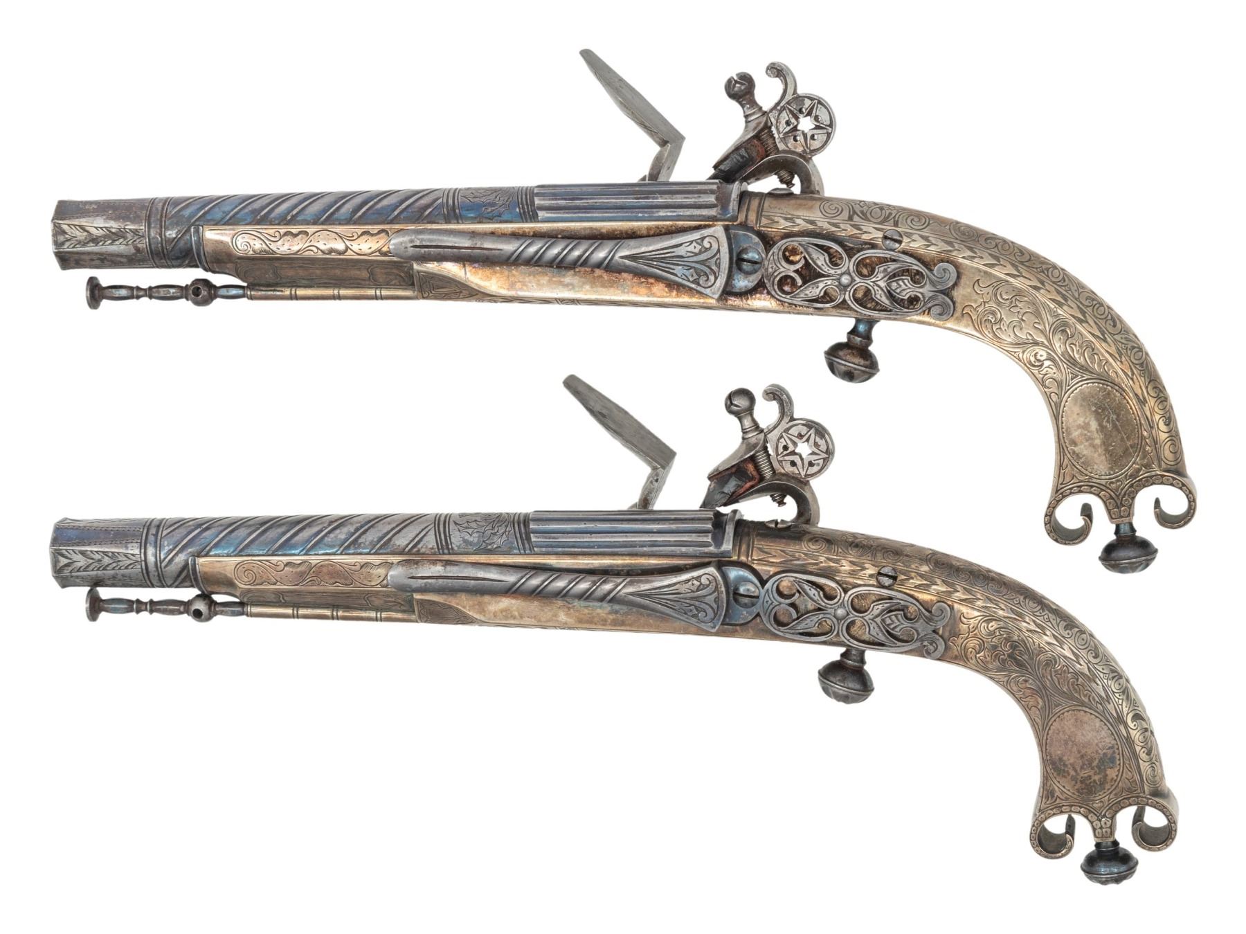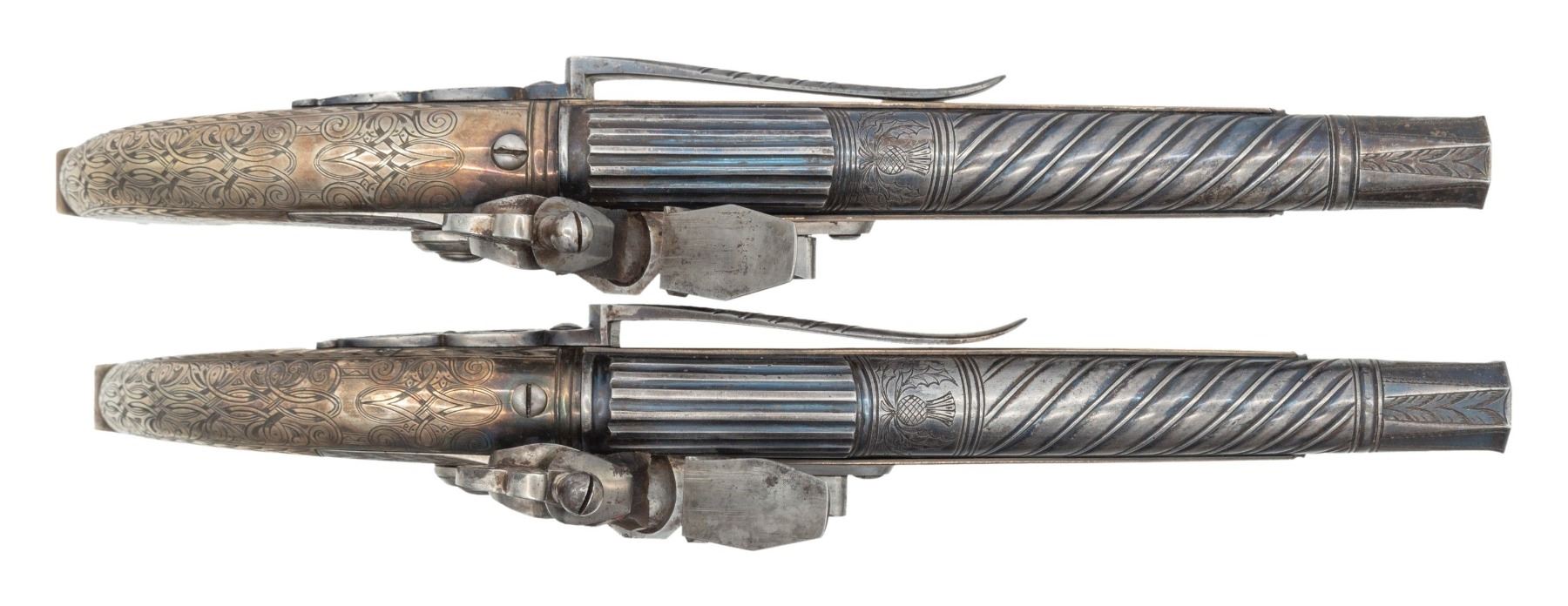 BY PLAYFAIR. Cal. 58 (Both). S# NSN (Both). This high quality and fine condition pair of pistols were made by Playfair & Company of Aberdeen, Scotland between 1876-1955. They specialized in this type of weapon used as part of complete Highland dress as popularized by Queen Victoria and Prince Albert. These pistols have 8" barrels of usual Scottish style. Raised breech portions are fluted and then transition to round with filed in spiral flutes and again transition to octagonal with flared muzzles. Tops of barrels are engraved with thistles. Traditional early type flint locks with Miquelet internal sears are fitted with serpentine cocks with Doune style stars at heads, inset faceted pans, unbridled friction frizzens and feather springs with foliate finials. Locks are engraved with feather borders around some scroll. "Playfair" is under pans. All metal stocks with rams horn butts appear to be made of Tombac a gold hued alloy of copper with a high tin content which resists tarnishing. Stocks are very nicely engraved with flowing scroll and some feather and geometric designs on bottom. Traditional Scottish knot work is on tops of grips. Stocks are fitted with usual ball triggers and matching prickers at centers of butts. Well filed steel belt hooks are on left sides. Traditional fancy turned steel ramrods mount though long pipes as thimbles. UNATTACHED ACCESSORIES: invoice from Greg Martin Auction via Proxibid for these pistols at a cost of over $17,500. CONDITION: very fine. Barrels and other blued parts retain about 30% original blue and show possible artificial aging. Locks retain most of their original bright polish. Stocks are very fine with little wear; nicely toned. Bores are fine. Mechanically fine and complete. (01-26943/MGM). ANTIQUE. $7,000-10,000.