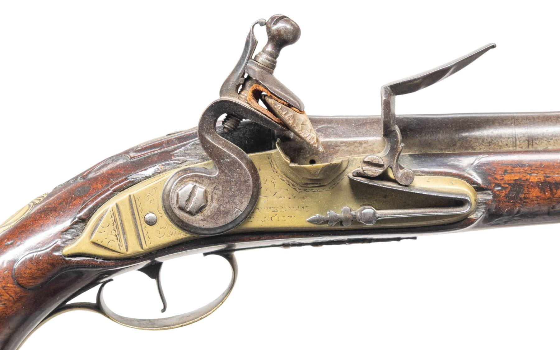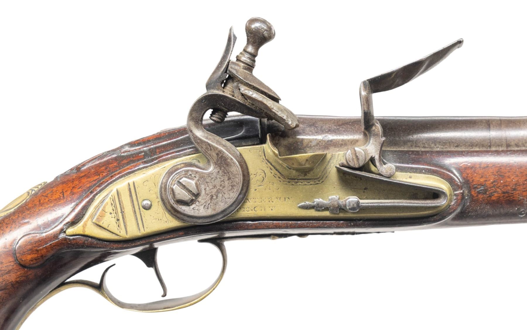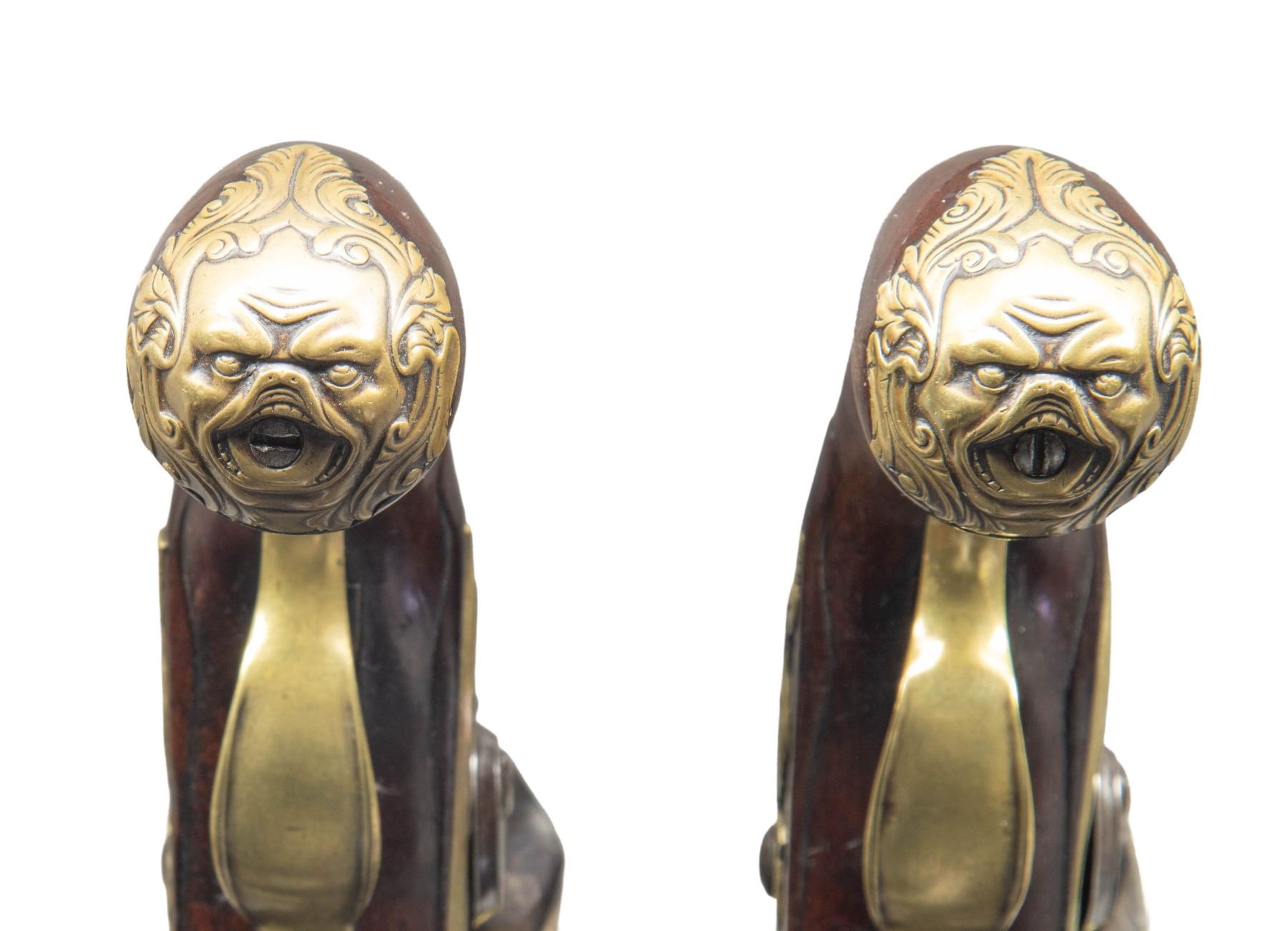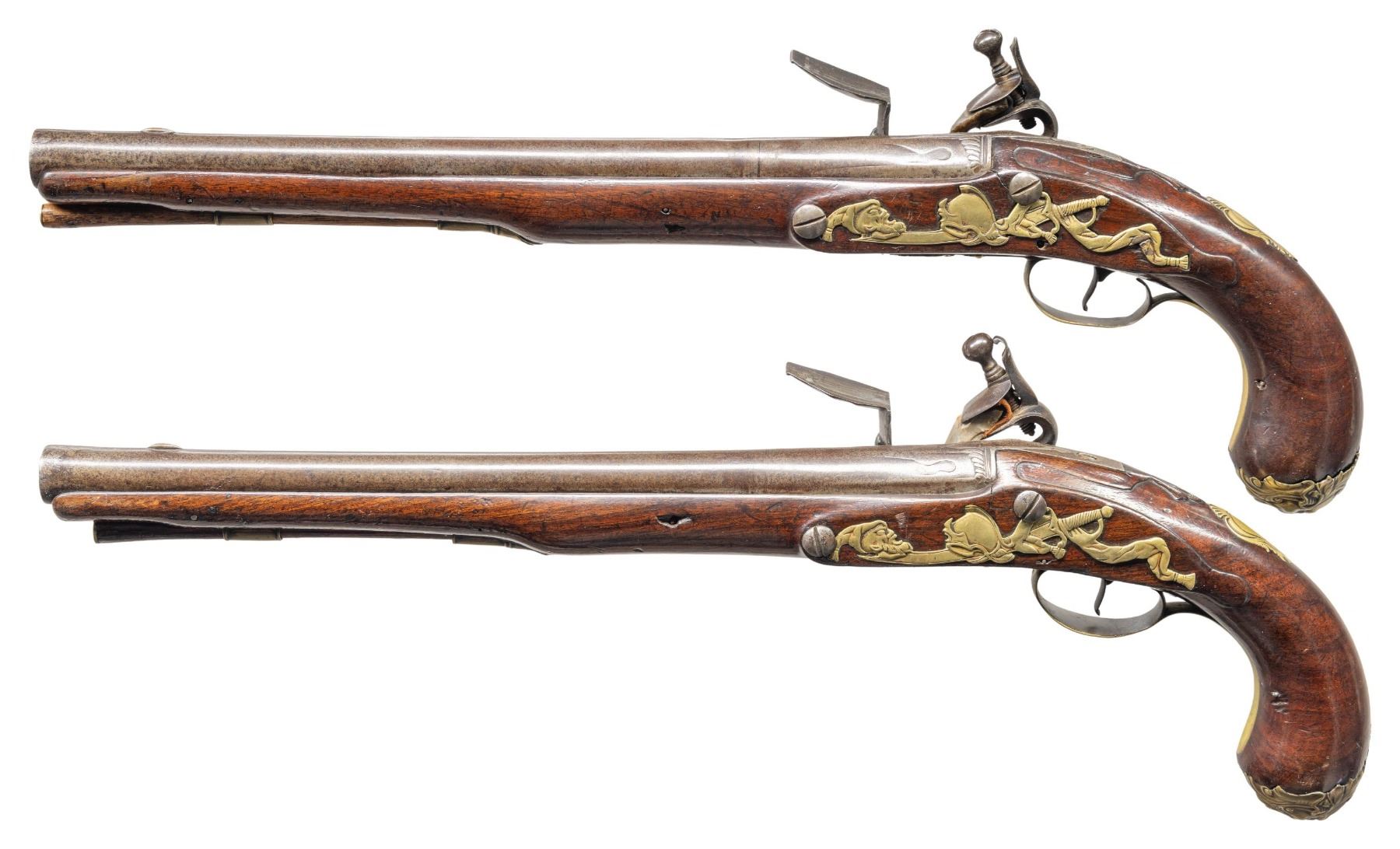 BY PENTERMAN OF UTRECHT WITH BRASS LOCKPLATES. Cal. 60. S# NSN. The 13-1/4" swamped round barrels show fine carving to breech areas, but are unmarked. Locks with chamfered arched brass plates are fitted with serpentine cocks, integral facited pans, unbridled friction frizzens and feather springs with long foliate finials. Locks and cocks have some scroll engraving surrounding "Penterman" "UTRECHT" in front of cocks (most likely Gerrit working 1673-1727). European walnut stocks with bag grips extend to muzzles and are pinned to barrels. Relief cast brass mounts include trigger guards with shell and foliate finials, grip caps with grotesque faces and long sideplates with swords, helmets and grotesque faces. Plain hickory ramrods mount through beaded brass pipes and matching thimbles. CONDITION: good; showing considerable cleaning etc as maintenance through the years. Barrels present mostly brown patina which matches iron and steel parts of locks. All brass shows cleaning with minor loss of detail. Engraving on locks hard to read. Stocks have old finish over marks and dings in original finish with mouldings, etc showing light wear. No repairs or losses are noted except for very small sliver of wood restored at muzzle of one pistol. Dark bores are somewhat pitted. Locks are quite good; fairly crisp. PROVENANCE: Estate Collection of Nicholas Apergis. (01-27548/MGM). ANTIQUE. $2,500-3,500.