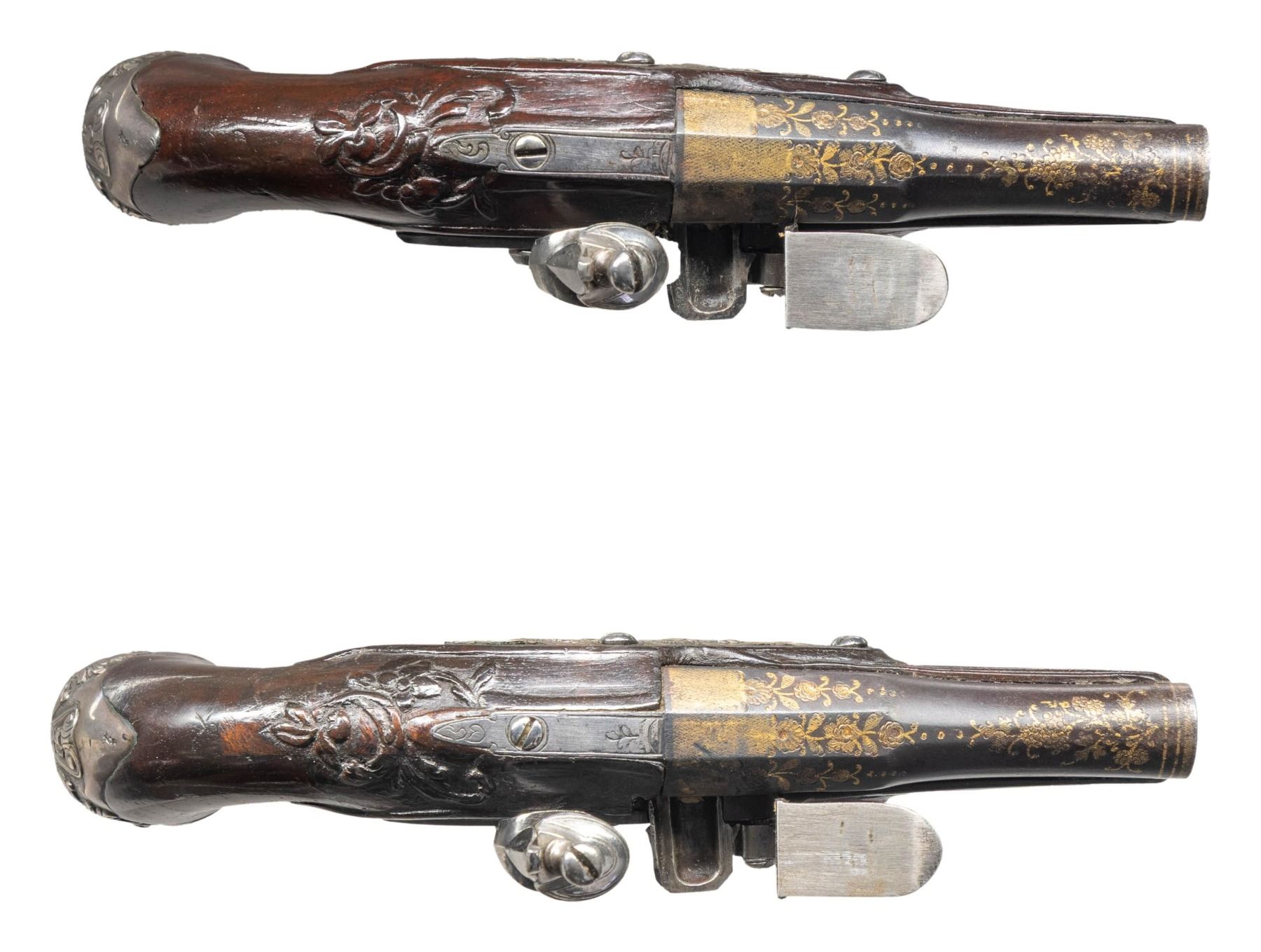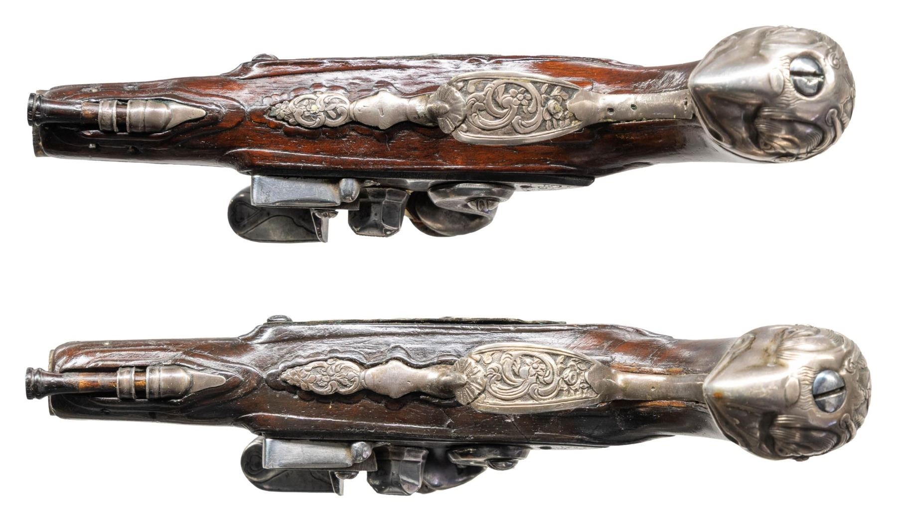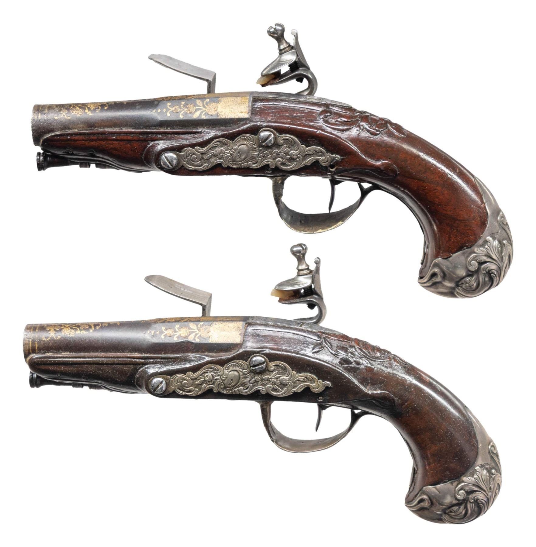 LAROCHE OF PARIS. Cal. 45. S# NSN. Jean Baptiste LaRoche is known to have been working in Paris between 1740-1769. He was gunmaker to the King (Louis XV). Pistols measure 7" overall and have 3-1/2" octagon to round barrels with gold washed foliate engraving. Tiny flint locks with chamfered plates have serpentine cocks, inset facited pans, unbridled friction frizzens and feather springs with bulbous finials. They are engraved with some scroll within line borders. One lockplate is engraved "LaRoche", the other "Paris". Stocks of European walnut have bird's head grips, extend to muzzles and are pinned to barrels. Nicely shaped mouldings are around all elements and relief carved acanthus is behind barrel tangs. Pistols are silver mounted with large relief cast bird's head grip caps, scroll engraved trigger guards with fancy finials and scroll decorated sideplates. French hallmarks are found on sideplates and grip caps. Small horn tipped ramrods mount through slotted thimbles. CONDITION: fine. Barrels are mostly brown and retain a good amount of their original gold. Locks are polished to silver. Stocks have renewed oil finish; one pistol showing extensive repair behind barrel tang and top of grip. Silver is very fine; lightly rubbed. Bores are smooth and shiny. Locks are good and complete. (01-26960/MGM). ANTIQUE. $3,000-5,000.