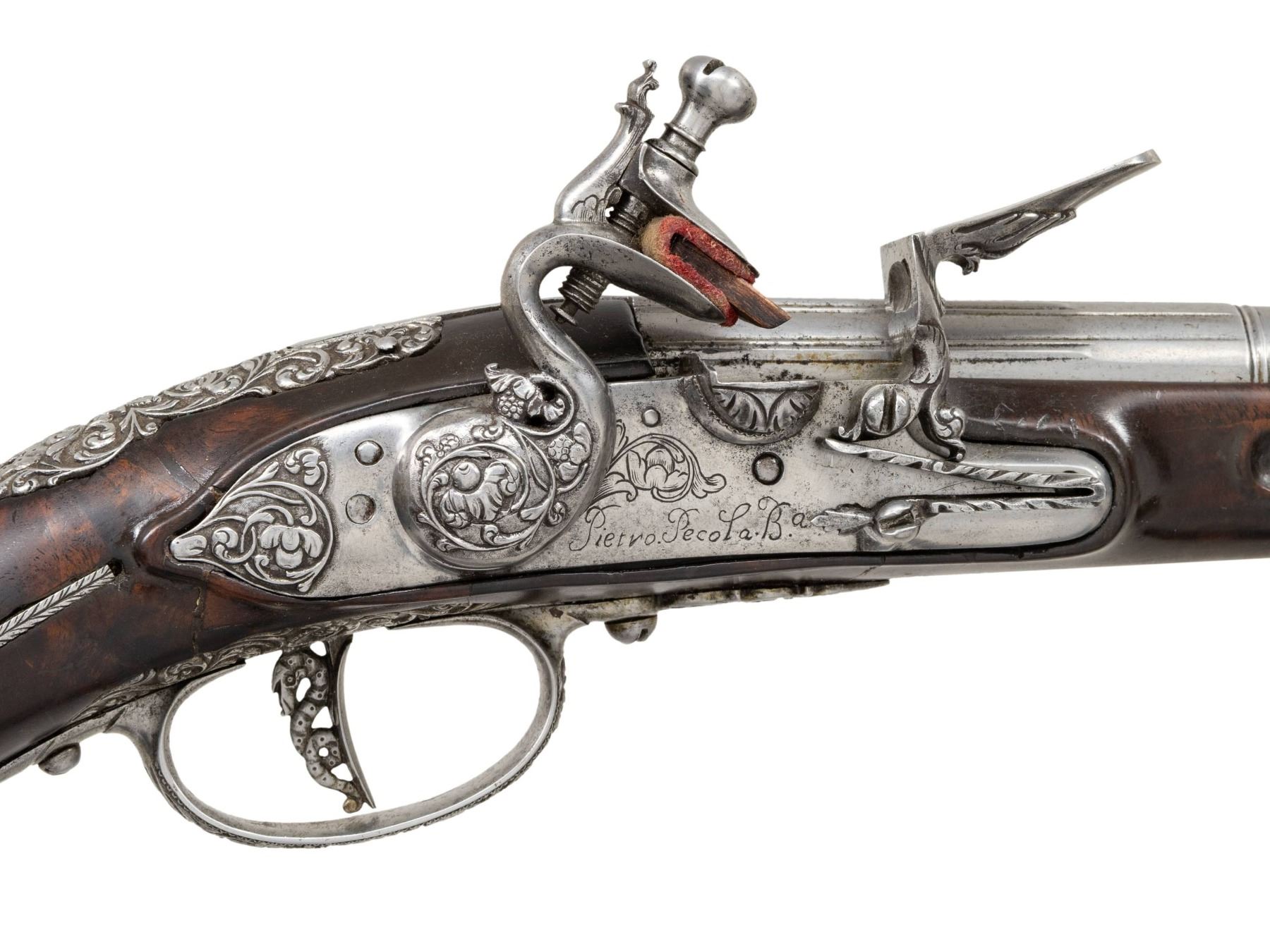 PISTOL BY PIETRO PICOLA OF BRESCIA WITH LAZARINO COMINAZZO BARREL. Cal. 54. S# NSN. Heer lists a Pietro Picola working in Brescia around 1780. This pistol is obviously earlier, probably 1710-20. It has 12-1/2" barrel with fluted breech area engraved "LAZARINO CAMINAZZO" which transitions in two stages to round. Lock with early rounded plate has serpentine cock, small inset rounded pan, unbridled friction frizzen and feather spring with foliate finial. Maker's name is engraved along bottom. Lock is beautifully relief engraved with scrolling floral motifs which continue onto cock and frizzen. Stock of very dark and figured European walnut extends to muzzle with small steel tip and is pinned to barrel. Area around thimble is delicately raised carved. Bright polished steel mounts are also deep relief carved to match lock. Grip cap with long side spurs has superb intertwined scrolls surrounding flowers and dragons on sides. The same theme extends to large unpierced plate at top of grip, trigger guard with pierced finial, trigger plate and large sideplate. Trigger itself is backed by a coiled dragon. Ramrod with turned steel tip mounts through relief carved steel pipe and matching thimble. UNATTACHED ACCESSORIES: copy auction description of this gun and handwritten note that it sold for over 7,000 Euros. CONDITION: very fine as restored. Barrel and mounts show cleaning to pewter gray with all details remaining clear. Stock with old refinish shows many professional repairs at bottom between lock and sideplate as well as at top of grip. Bore is good with some fairly deep pits. Lock is operable. A very showy early pistol. (01-26952/MGM). ANTIQUE. $4,000-6,000.