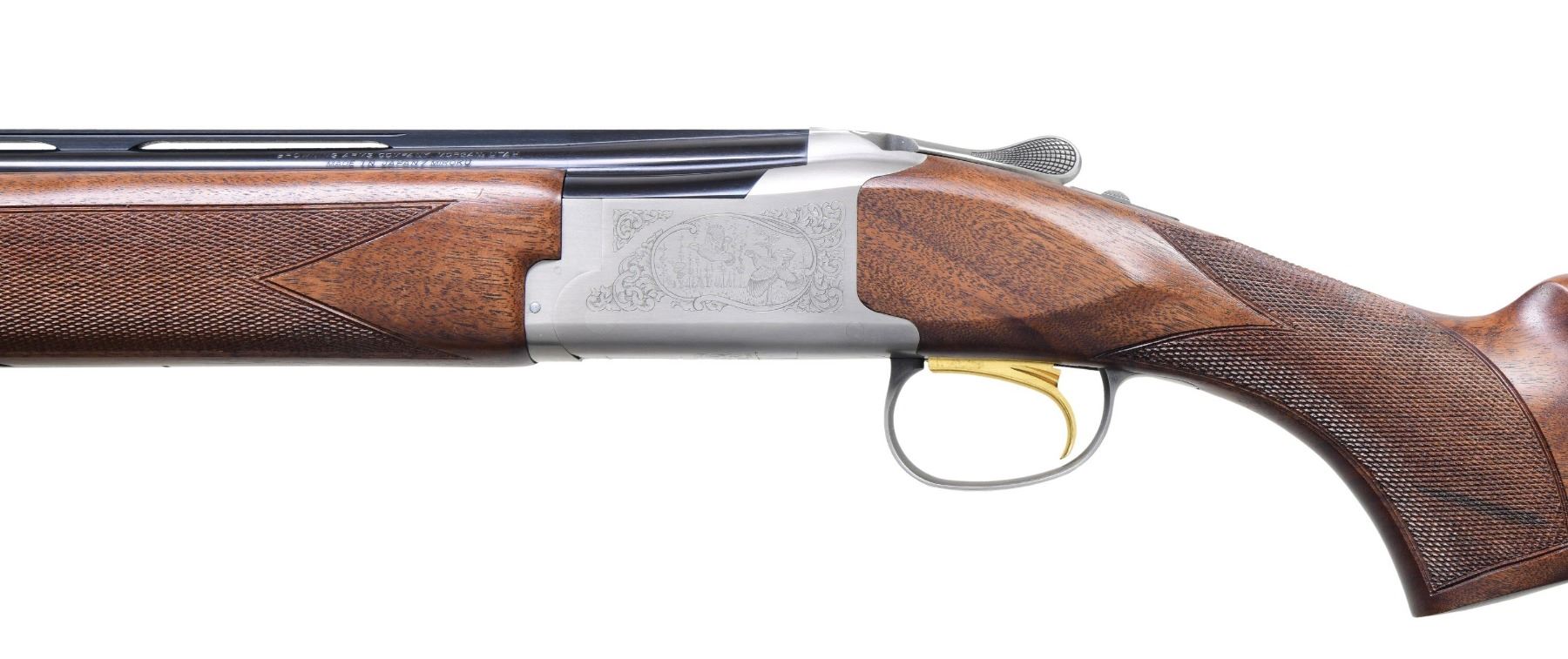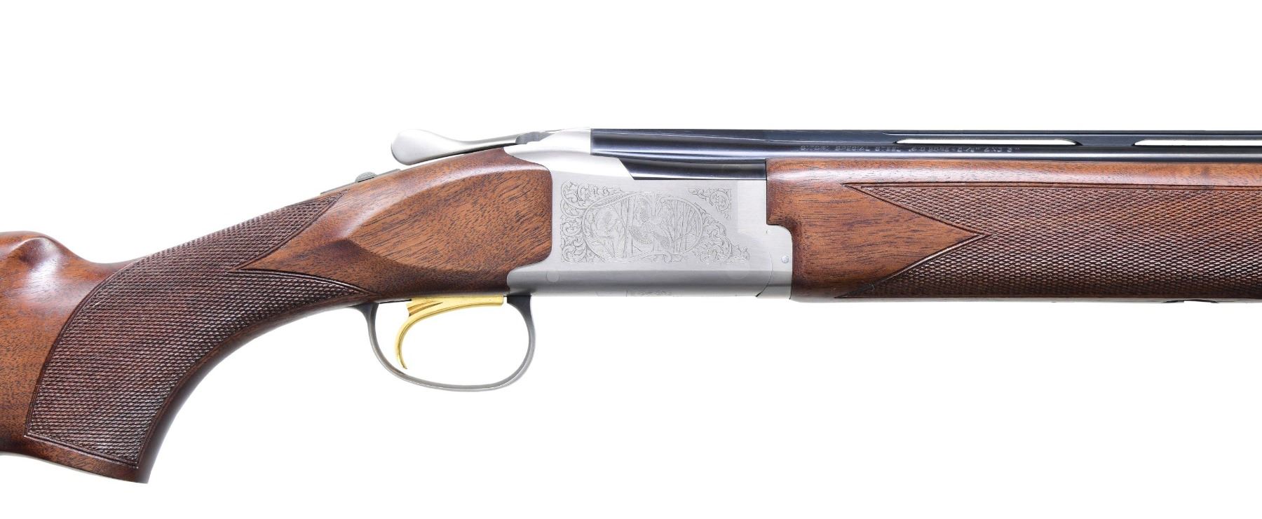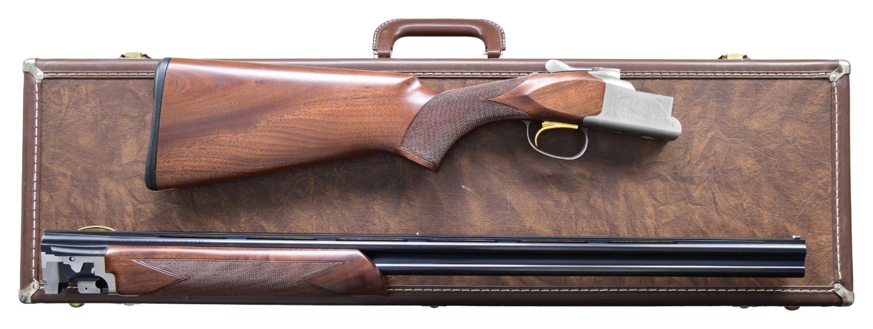 Cal. 410. 3". S# 33362ZV131. Bbls. 28" vent rib w/ Invector chokes, set of seven tubes included. White target front sight w/ white mid bead. Silver nitride finished boxlock action. Scroll ornamentation features flying partridge on right side w/ flying quail on left. Gold plated SST. Ejectors. Schnable tipped forearm & flat knob pistol grip stock of satin finished walnut have cut checkering. LOP: 14 1/4" over Inflex Technology thin black pad. UNATTACHED ACCESSORIES: Browning luggage case containing spare chokes, choke wrench, chamber locks, three piece hardwood cleaning rod w/ accessories, instruction manual, NRA card & case key. Also includes original box. CONDITION: near excellent retaining over 98% original finish. Stocks show a few small marks. Bright near excellent bores. (25-911/DS). MODERN. $1,750-2,500.