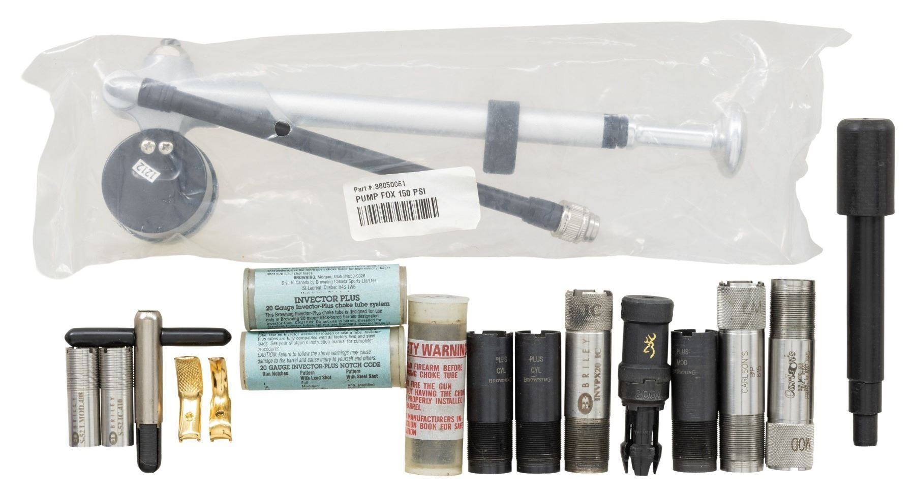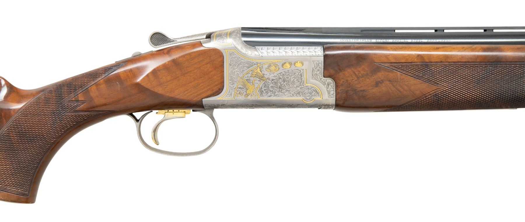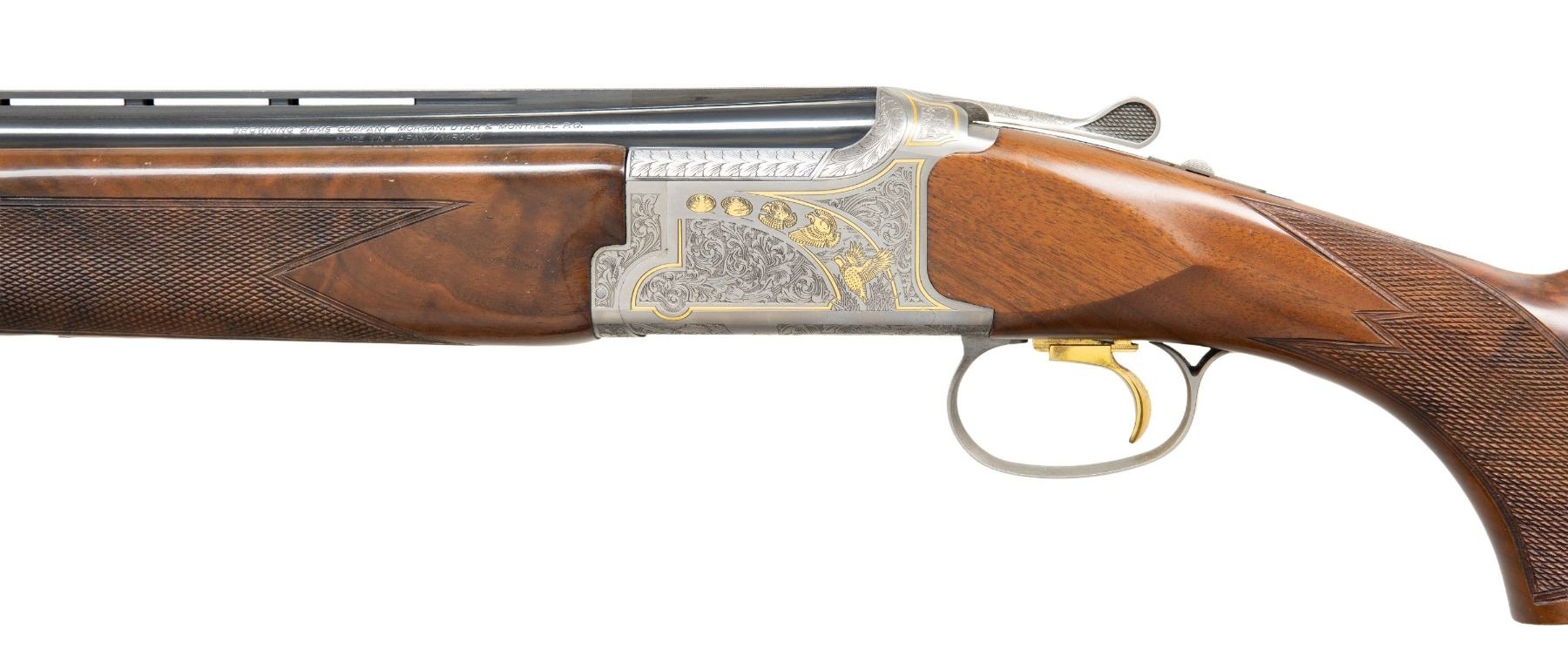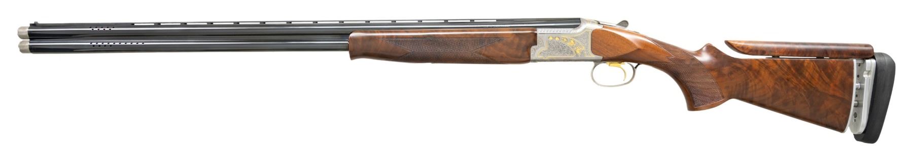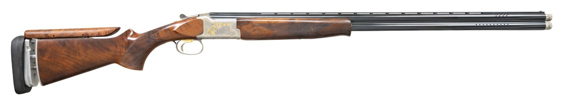 SHOTGUN WITH 410 BRILEY SUB-GAUGE TUBES. Cal. 20 Ga., 2 3/4". S# 17010MZ131. Mfg. 2001 by Miroku of Japan. The ported, VR 30" barrels have White target front bead, extended Briley Invector Plus choke tubes & Briley 410 Ga. insert tubes installed. Satin Grey receiver with scroll engraving along with gold inlays of pigeons & clays. Action has wide SST for right handed shooter & ejectors. Checkered walnut stock set w/ schnabel tipped forearm, & hydraulic (air) recoil system with adjustable comb. LOP: 14 5/8" to Kick-Eez. WEIGHT: 8 lbs., 7 oz. UNATTACHED ACCESSORIES: gun is housed in Verona case with allen wrenches. Accessories include Browning box includes allen wrench, 2 triggers & 2 choke tube cases, Browning paperwork, installation tools for Briley sub-gauge tubes, 20 Gauge choke tubes including: Browning Mod Plus, Imp. Cyl, 2 - Cyl. Carlson's extended Mod, LM, Briley extended IC, Browning Choke wrench, Briley manual. 410 Choke tubes include: Briley Mod, IC, Choke wrench. CONDITION: over 90% original wood & metal finish showing scattered light handling marks on buttstock, notable gouges in forearm checkering & light friction wear on barrels. Shiny bores. (25-6092/MD). MODERN. $1,500-2,250.