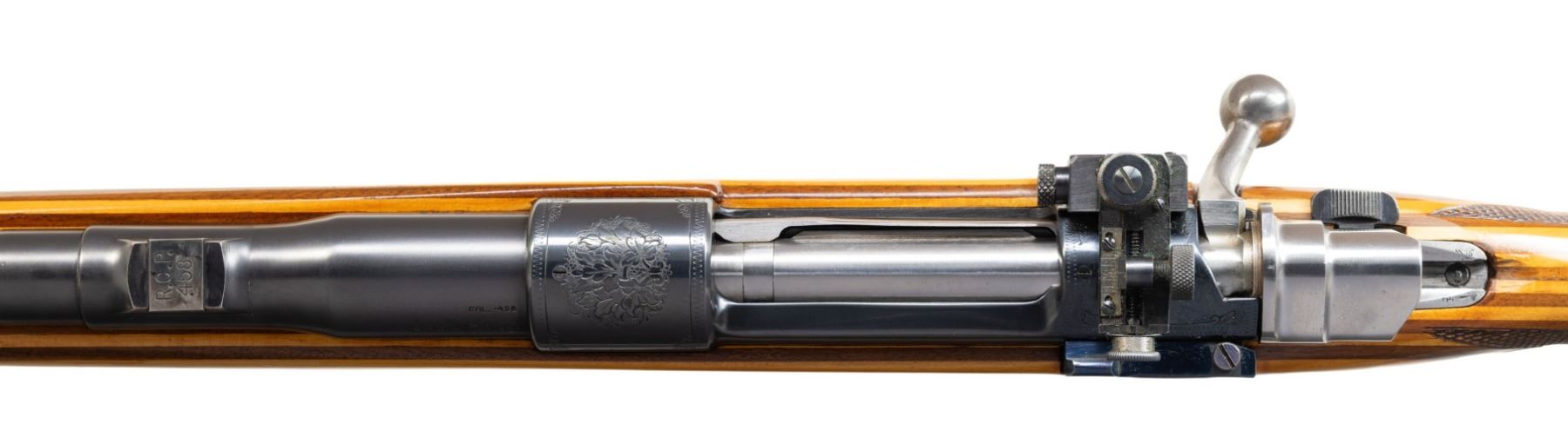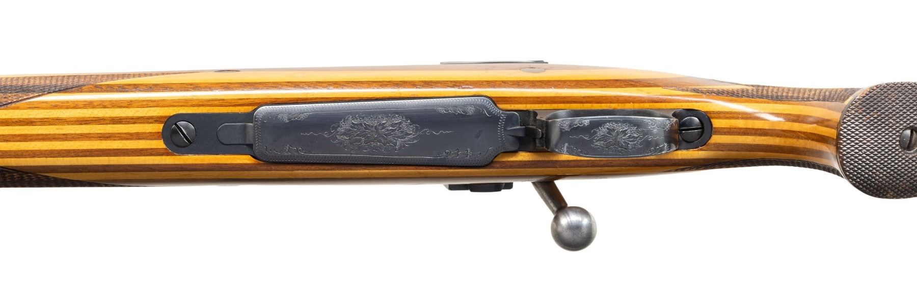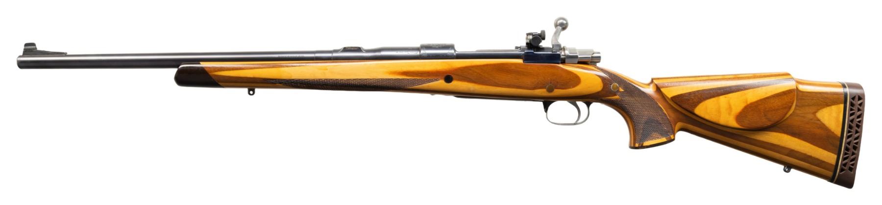 Cal. 458 Win. Mag. S# C963. Bbl. 19 11/16" with dovetailed Sourdough brass bead front sight in 2 screw ramped base plus island base for original rear sight having slot blank marked "R.C.P." over ".458"; Lyman 48M receiver sight with 125 point slide. Custom made with matching number "963" low on right front side of its FN Commercial Model 98 action (below stock line) and on its swept back bolt handle. Belgian proofs on barrel (most pronounced), rear tang of action and bolt handle. Smooth commercial bolt shroud with "Finland" marked slide safety single stage trigger. Action is without maker's markings having fine floral engraving to include hinged trigger guard assembly plus floral vignette on front bridge of receiver. Entire bolt assembly and trigger are in the white plus receiver is drilled and tapped for scope bases; plug screws installed. Laminated stock of maple and walnut has dark slant cut forend tip and matching checkered grip cap. Fitted with triple stock reinforcement bolts but no extra lug on barrel; glass bedded in normal recoil lug area. Stock has 3 walnut stained checkered panels; each side of pistol grip plus wraparound section on forend. Fitted with detachable sling stud bases and Mershon Whiteline ventilated brown recoil pad; 13 1/2" LOP. CONDITION: very good plus overall appearance with some slight thinning of bluing near muzzle. Minimal, very faint stock handling marks plus 3 hair line cracks; at each end of triggerguard assembly plus behind action tang. Front stock reinforcement bolt appears original whereas the other two appear added later. A few very light spots of peppery like oxidation on very front flat of triggerguard assembly. Near excellent bore. PROVENANCE: From the Buckstix Collection. (25-6379/NW). MODERN. $1,000-1,500.