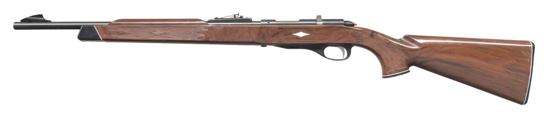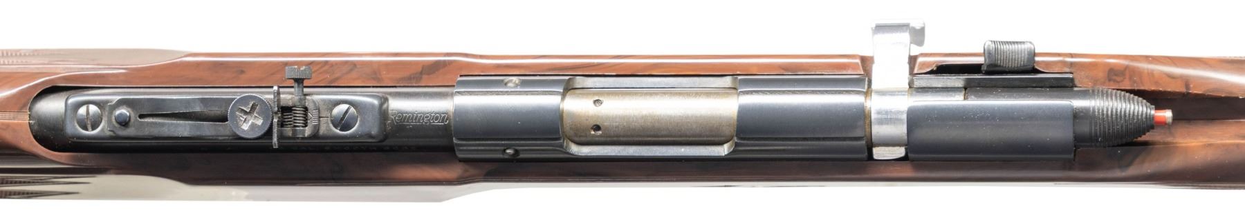 RIFLE. Cal. 22 Smoothbore. NSN. Bbl. 19 5/8". 1 of only approx. 10,700 Nylon 10 single shot bolt action rifles mfg. by Remington between 1962-1964. Left side of the bbl. is marked "22 CAL. SMOOTH BORE", with the Remington trademark logo marked over the top towards the chamber. Receiver, bbl., and bolt shroud exhibit a blue finish, with grooved Mannlicher style bolt handle and trigger exhibiting a chrome finish. Bolt body is polished in-the-white. 1-piece mottled brown synthetic pistol grip stock with checkered panels on either side of the forearm and wrist, as well as a black synthetic trigger guard and grooved buttplate. Black synthetic grip cap is marked "Remington/ NYLON/ 10". Fixed black enamel finished alloy blade front sight, with grooved receiver, and blued adj. square notch rear sight. CONDITION: metal components retain the vast majority of their original factory blue finish, showing few spots of light wear, a few scattered superficial handling marks, and a few spots of light surface oxidation overall. Chromed parts are excellent overall. Mirror bore, exhibiting what appears to be a small unidentified indentation. Proper manual mechanics. Stock shows some scattered scratches and light superficial handling marks, but otherwise remains sound. A very nice example of a rare Remington Nylon 10 single shot rifle. PROVENANCE: From the PMRB Collection. (25-5945/MLW). CURIO. $800-1,200.