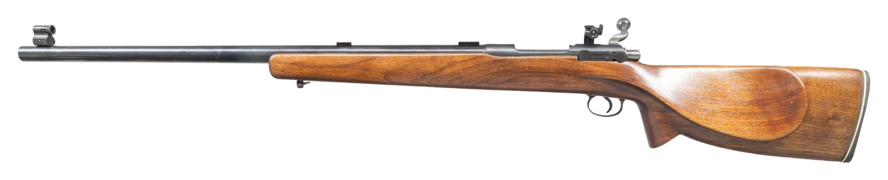 MAGNUM SINGLE SHOT BOLT ACTION RIFLE. Cal. 308 Norma Mag. S# 29454. Bbl. 29". Model 30S Express bolt action rifle mfg. by Remington and later converted into a custom sporting configuration with a .308 Norma Magnum bbl. Left side of the bbl. is marked "W.W. OLSON", with the cal. designation "308 MAG" marked towards the breech. Left side of the receiver is marked with the model designation and S#, with the Remington trademark logo marked on the right. Receiver exhibits a standard blue finish, with the bolt assembly having been cleaned and polished in-the-white. Custom bbl. exhibits a polished blue finish. Trigger guard exhibits a reapplied blue finish. 1-piece custom wood pistol grip stock features a steel hand stop rail on the underside of the forearm, with an elongated cheek piece on the left side of the buttstock, a thumb rest on the right side of the buttstock, and a textured black rubber Pachmayr White Line recoil pad. Interior of mag. well is filled with a plain wood block. Lyman 77H globe front sight and Lyman adj. aperture rear sight. Rear half of bbl. features 2 sight mount bases (x1 case colored, x1 blued). CONDITION: metal components retain the vast majority of their blue finishes, exhibiting some superficial handling marks and some small scattered spots of light surface oxidation overall. Bolt exhibits scattered spots of light pitting and age related discoloration. Mirror bore, exhibiting some scattered spots of light pitting, while retaining well defined rifling throughout. Proper manual mechanics. Stock shows some superficial marks from handling and storage, with a crack on the right side of the butt stemming from the recoil pad, and a chip to the rear of the upper receiver tang, but otherwise remains sound. PROVENANCE: From the Buckstix Collection. (25-6443/MLW). MODERN. $800-1,200.