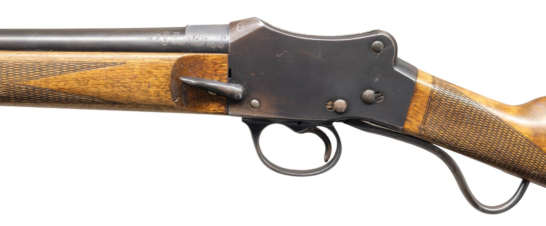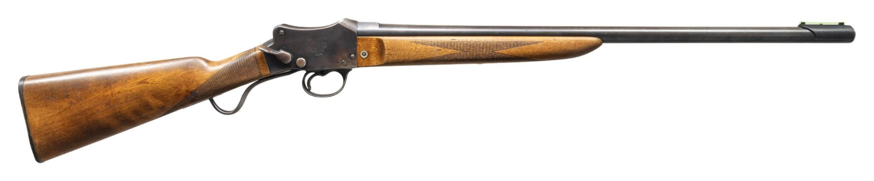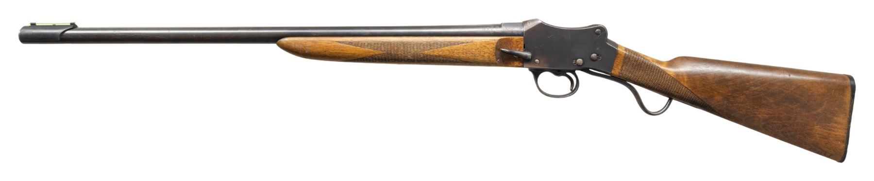 Cal. 12 Ga., 2 3/4". S# 4888. Bbl. 26" w/ steel bead & added green fiber optic sight. Takedown martini action. Checkered walnut stock set. LOP: 14 3/4" to hard rubber buttplate. CONDITION: fair blue mixed with brown patina showing scratches. Fair worn wood finish with sm. gouges in checkering. Shiny bore with light fouling. PROVENANCE: From the Buckstix Collection. (25-6397/MD). CURIO. $700-1,000.