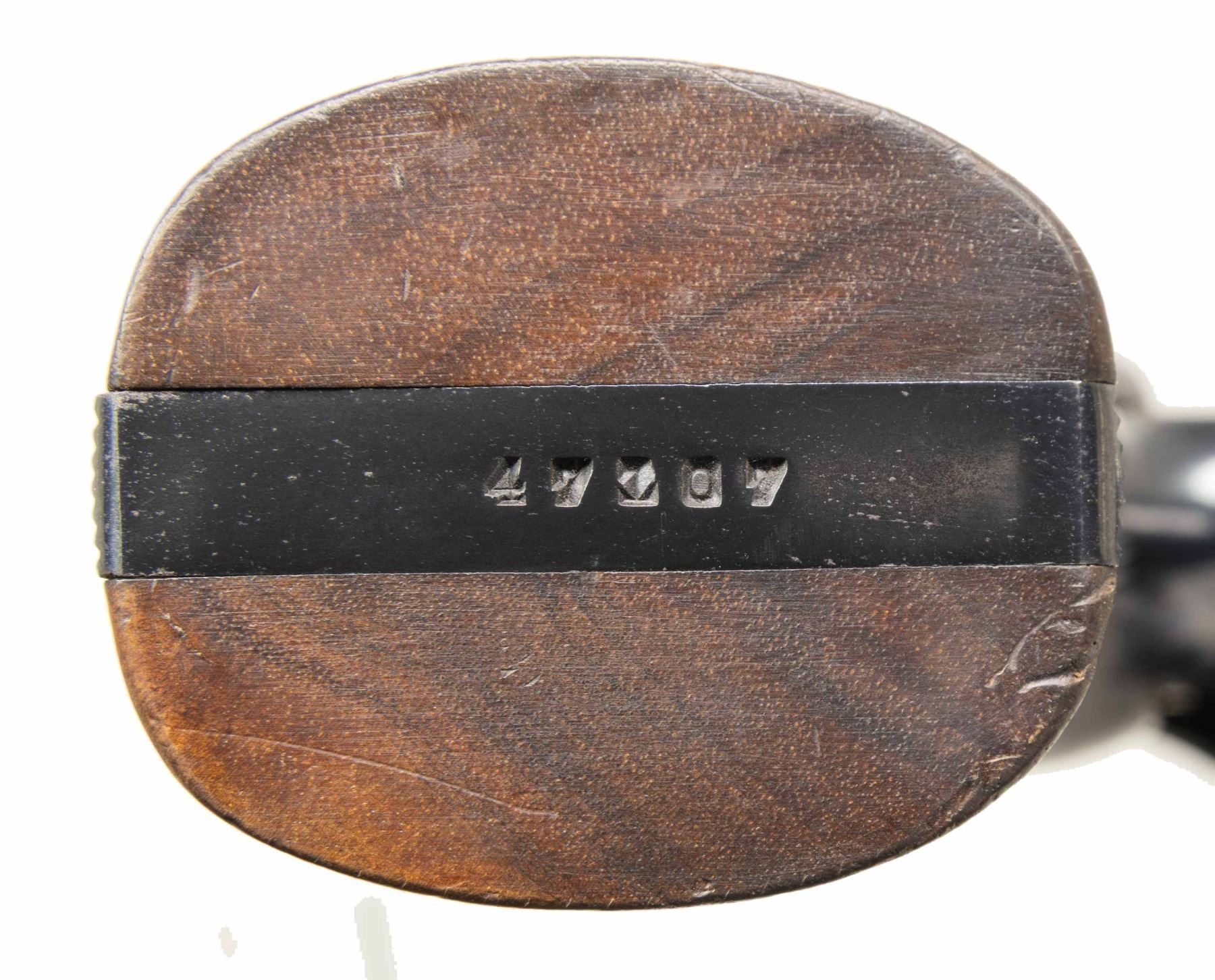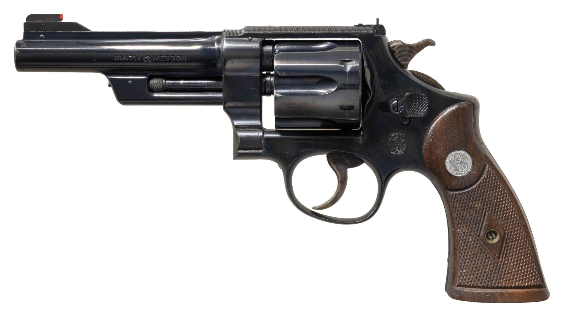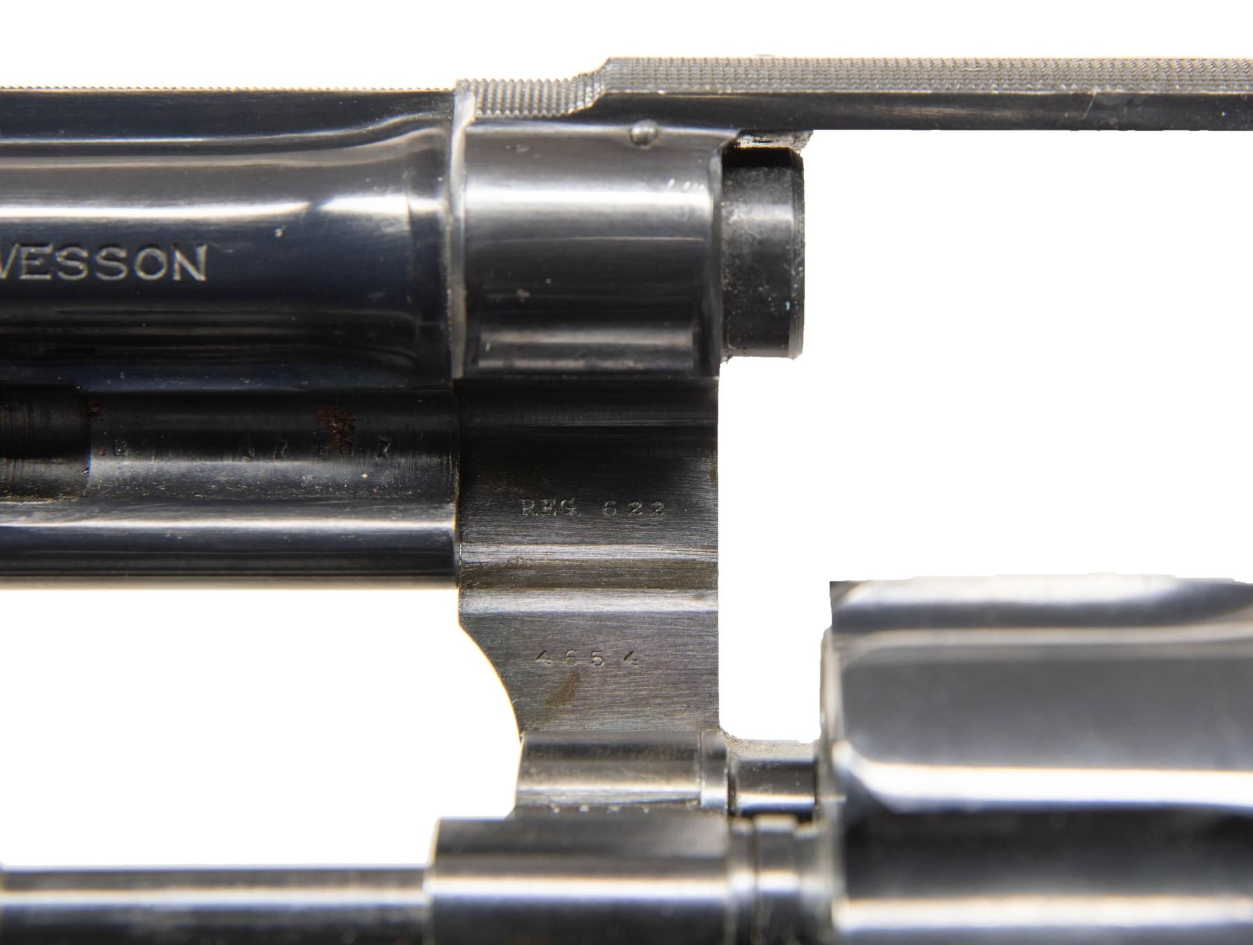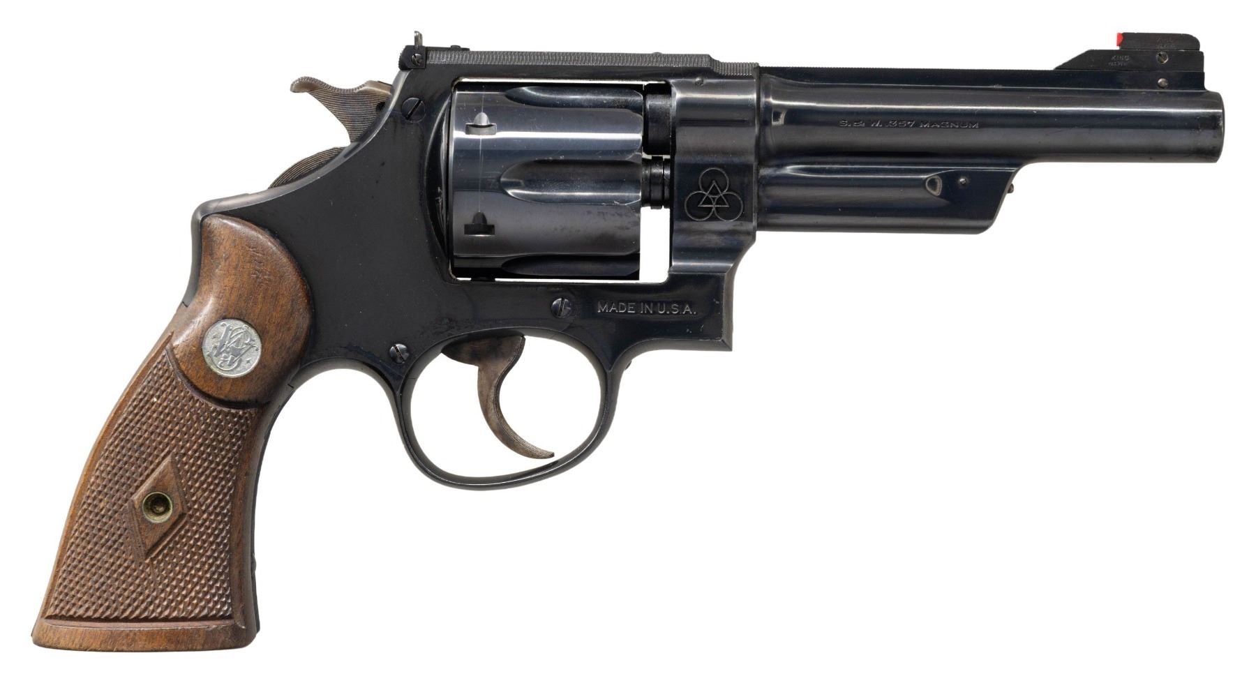 Cal. 357 Mag. S# 47107 (Reg. # 622). Bbl. 5". Ramped King's front sight with red plastic bead. Adjustable square notch rear sight with white outline. Matching numbers on frame, bbl., cyl. & extractor. This model is the first of the Magnum revolvers that was influenced by Elmer Keith; the first example was given to J. Edgar Hoover (Reg. # 1) and was popular with other famous persons, such as General Patton (Reg. # 506). Offered in many barrel lengths and with various features, each almost a custom build from S&W. Only 5224 Magnums were "registered" between 1935–1939, evolving into the Model 27 of the present. Right front of frame has triangle with three interlocking circles. Blued finish with case colored trigger & grooved hammer with patent marking. Checkered walnut diamond center grips with silver S&W medallions. Grips have no visible number present. CONDITION: bottom of rear grip panel shows a small glue repair, grips otherwise some checkering wear, handling marks & light scratches. Hammer & trigger retain most of their case colors with some light oxidation & operational wear. Balance of metal retains 92% factory quality reblue with some edge wear, handling marks & oxidation mostly under grips. Action functions properly when hand cycled. Good bright bore with some oxidation that may clean up better. (25-1210/MJC). CURIO. $2,000-3,000.