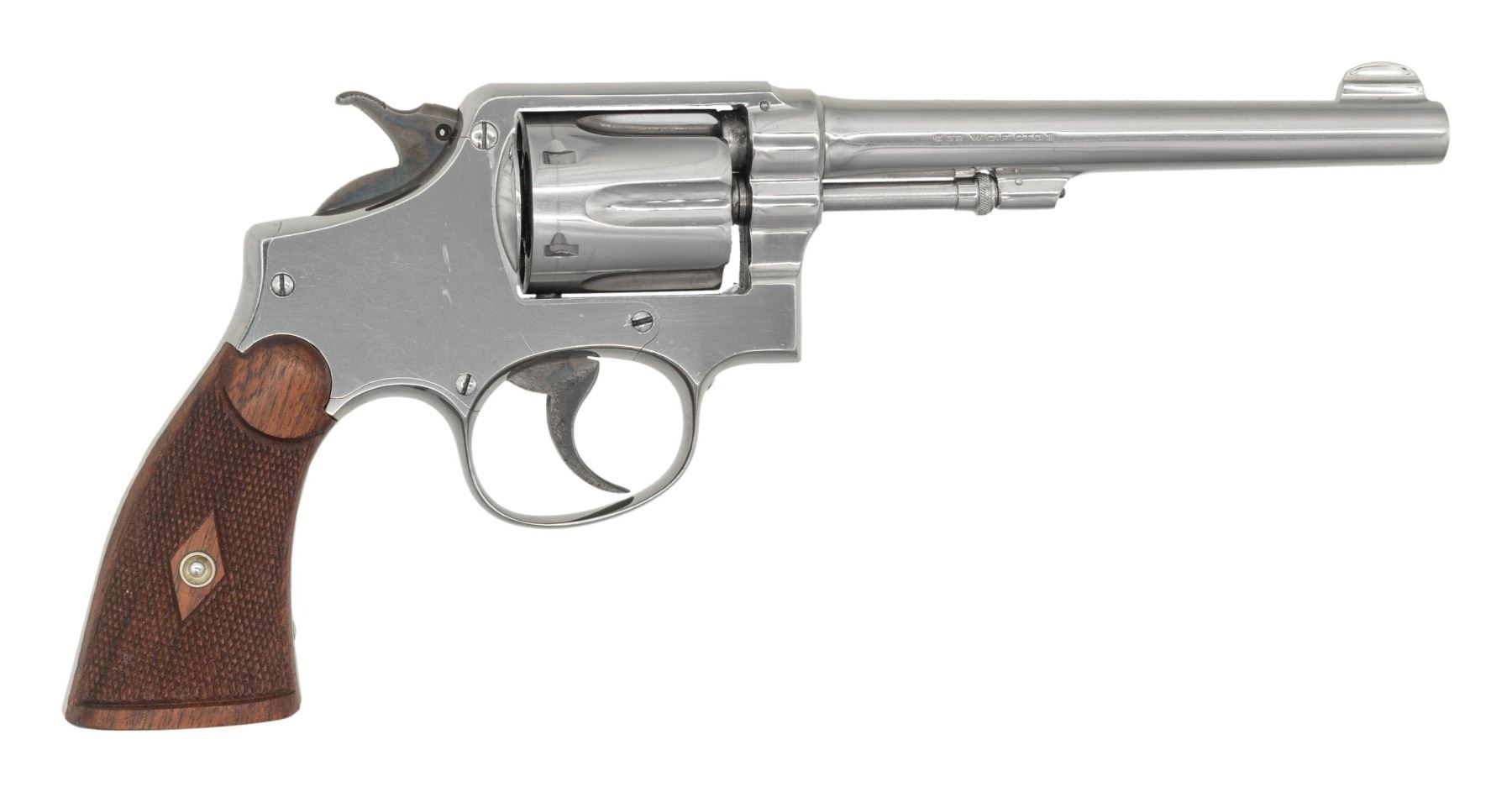 4TH CHANGE DA REVOLVER. Cal. 32 WCF (32-20). S# 107241. Star after S# & "9 .46" stamped on left side grip frame indicates Sept. 1946 factory refinish. Matching numbered 6" bbl., 6 shot cyl., extractor & 2 piece checkered walnut grips. Nickel finished, 5 screw, square butt frame; "91" stamped on left side grip frame. CONDITION: very good factory re-nickeled finish showing light handling marks. Very good grip finish with a notable chip on left panel. Service hammer & trigger has good case colors with patina on sides of trigger. Fair worn bore with light pitting throughout. PROVENANCE: From the Buckstix Collection. (25-6329/MD). CURIO. $1,000-1,500.