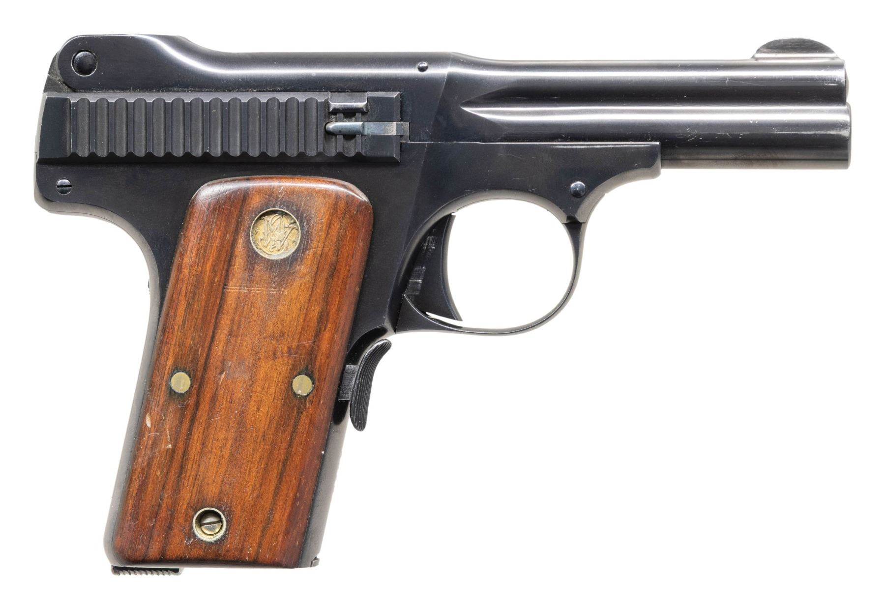 Cal. 35 S&W. S# 5392. Bbl. 3 1/2". Round blade front sight. U-notch rear sight. Mfg. 1913-21. Mag release on bottom of grip frame. Blue finish. Smooth walnut grips with gold S&W medallions. MAGS: 2-7 rd. UNATTACHED ACCESSORIES: correct but unnumbered factory box with cleaning rod. CONDITION: grips show some flaking varnish & handling marks. Metal retains 98% original blue with some light handling & edge wear. Action functions properly when hand cycled. Very good bright bore with strong rifling. (25-5395/MJC). CURIO. $800-1,200.