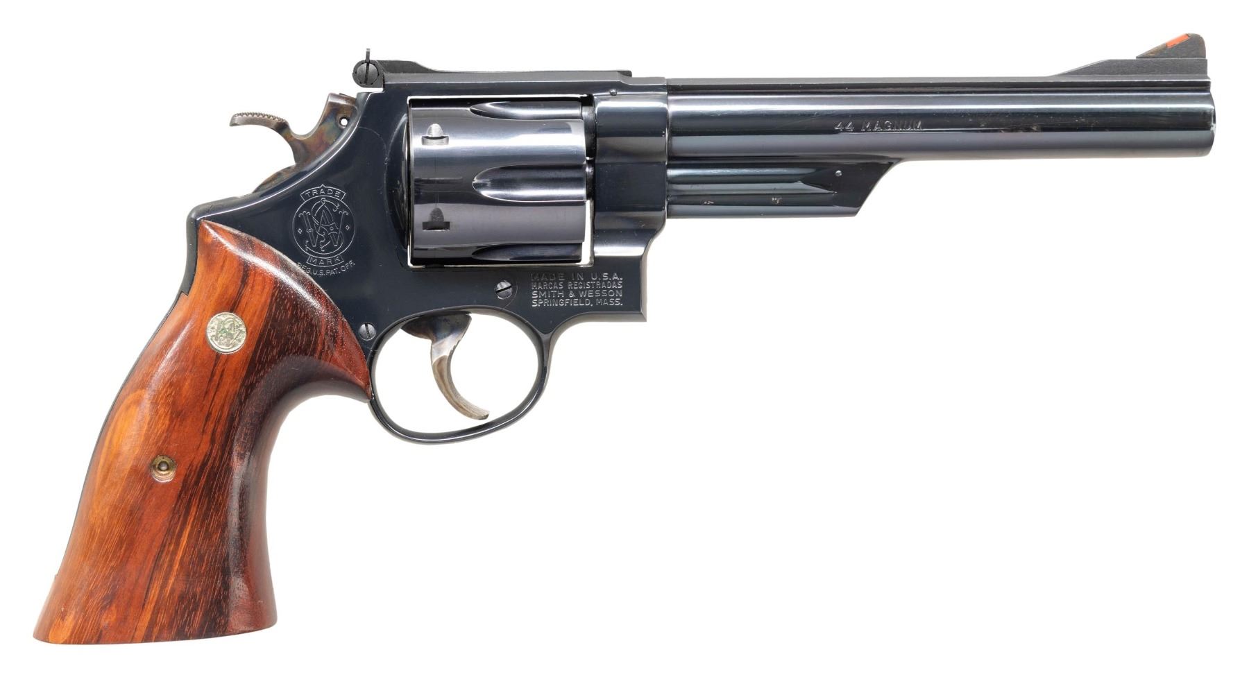 Cal. 44 Mag. S# N23719. Bbl. 6 1/2" pinned. Ramped serrated blade front sight with orange insert. Adjustable square notch rear sight with white outline. Mfr. 1969-1972. 6-shot recessed cyl. Blued finish with case colored target hammer & trigger. Goncalo Alves target grips with silver S&W medallions. CONDITION: grips show a tiny light chip at rear, light flaking & handling marks. Hammer & trigger retain most of their case colors with some light operational wear. Balance of metal retains 97% original blue with a couple spots of light oxidation, some edge, handling & operational wear. Action functions properly when hand cycled. Bright near excellent bore. (25-6009/MJC). CURIO. $1,000-1,500.