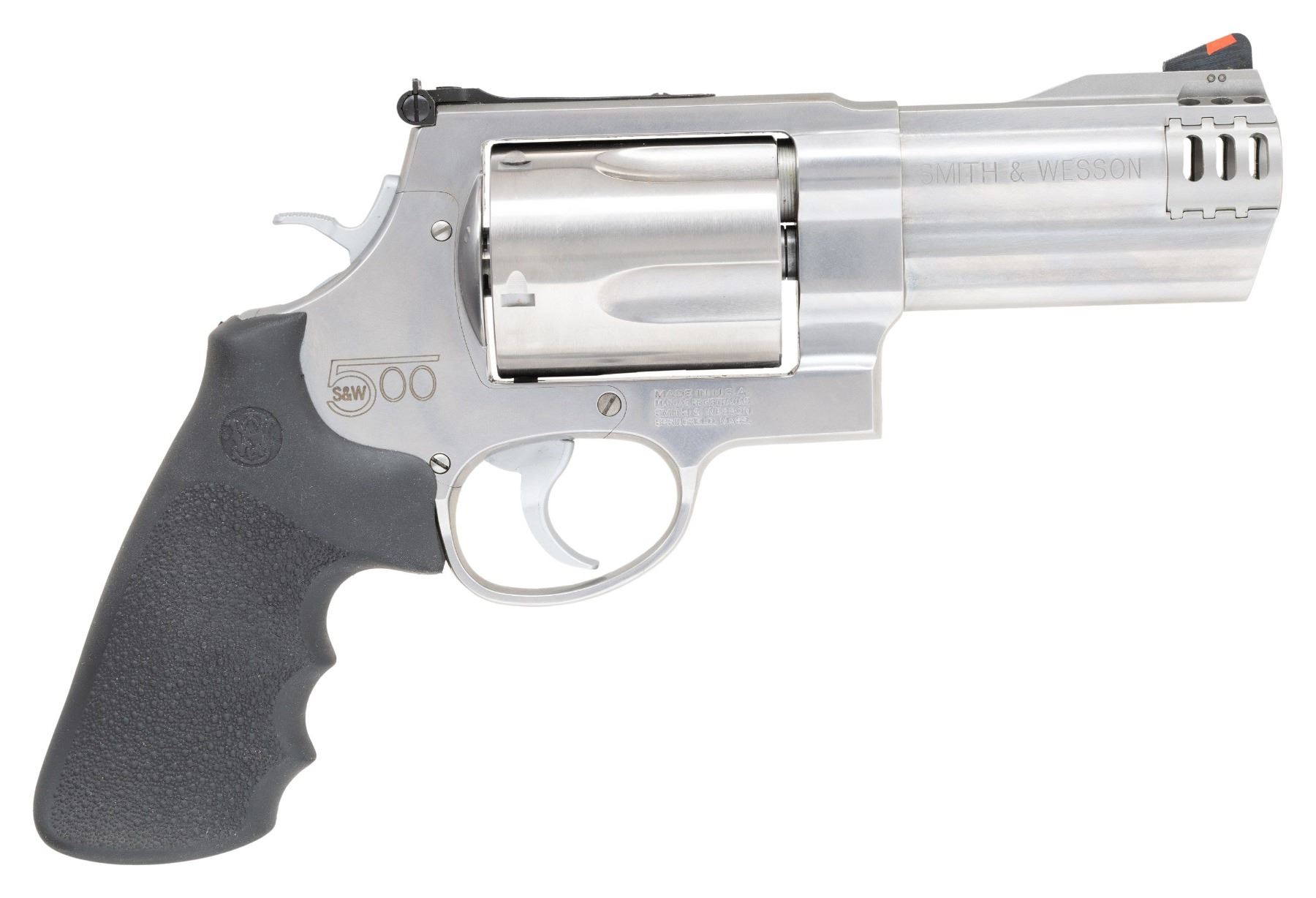 Cal. 500 S&W Mag. S# CJA9233. Bbl. 4" with compensator. Ramped serrated blade front sight with orange insert. Adjustable square notch rear sight with white outline. 5-shot cyl. Stainless finish with hard chrome trigger & hammer. Black rubber finger groove grips with S&W monograms. CONDITION: grips show light handling wear. Metal shows some light handling marks & operational wear. Action functions properly when hand cycled. Bright very good plus bore. PROVENANCE: Estate Collection of John "Jack" Dhooghe. (25-5534/MJC). MODERN. $800-1,200.