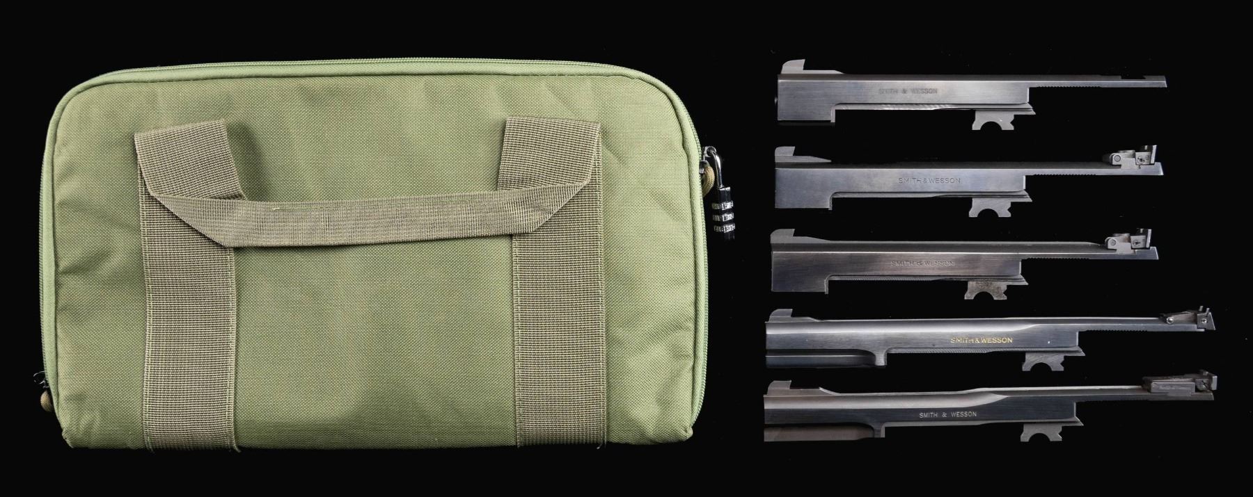 This lot consists of three 5 1/2" S&W Model 41 bbl. assemblies. All three of these assemblies have front sights & two have rear sights. Also present are two 7" bbl. assemblies with both front & rear sights. All bbl. assemblies have blued finish & are in housed in a green softcase. CONDITION: bbl. assemblies retain most of their bluing with minor edge & operational wear. All have bright bores with strong rifling. (02-24231/MJC). NON-GUN. $800-1,200 for lot.
