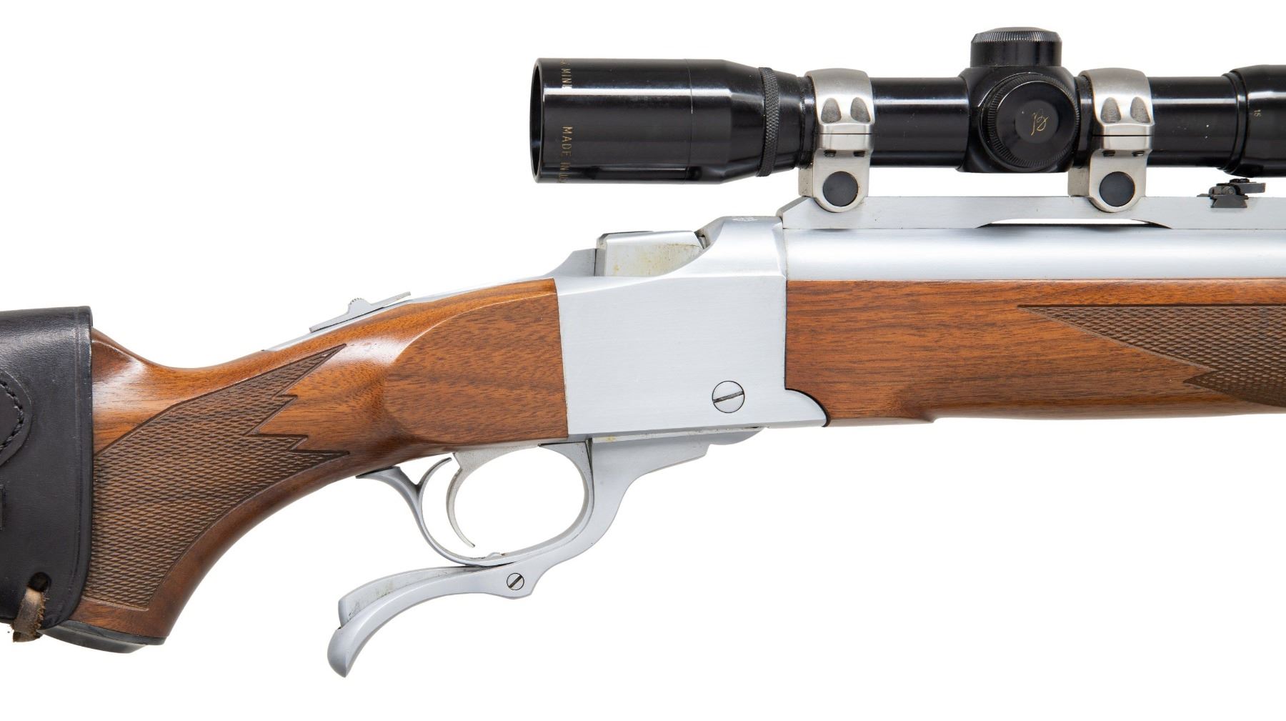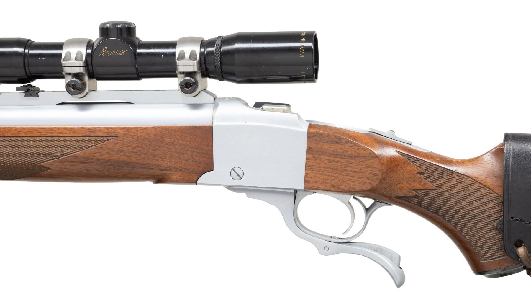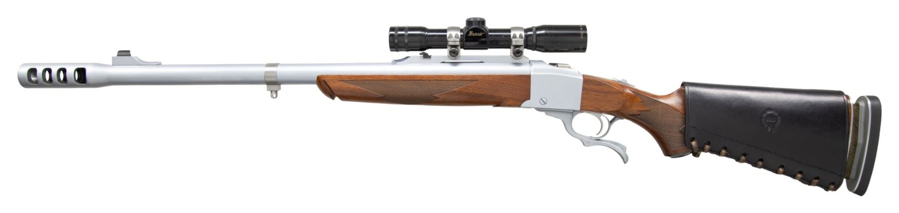 Cal. 600 JDJ. S# 133-73510. Bbl. 26" including 3 1/2" muzzle brake of 8 ports. Front sight is standard Ruger No. 1 (user changeable blued brass bead) ramped base without band. Ruger quarter rib at rear with folding leaf sight and factory 1" rings holding Burris gloss black finished Mini-4X having adjustable objective; duplex reticle. Ruger action made 2000 which is the time period that the cartridge was first introduced by J. D. Jones' company, SSK Industries. SSK and Jones were well known for the many Thompson Center Contender customs they pioneered along with a number of powerful wildcat cartridges. This chambering was created to duplicate the power of the 600 Nitro Express but with a smaller case that could be used in a Ruger No. 1 action rather than the expensive large custom double rifles of the 600 NE which had a cases too big for the Ruger. The 600JDJ cartridge is based on the smaller 577NE case necked up to 60 caliber that is compatible with the Ruger action. The muzzle velocity of the 600JDJ with its 900 grain bullets is about 2,000 FPS with a muzzle energy of about 8,000 foot pounds which is 50% more energy than a 458 Win. Mag. with a 510 grain bullet. The barrel is SSK and caliber marked plus it has a detachable sling swivel banded base (rear swivel base in buttstock). Action, barrel and brake are hard chrome plated as is often featured on many SSK customs. Standard Ruger stock set with an Alex Henry forend. Buttstock is fitted with a CounterCoil adjustable hydraulic recoil absorber and pad; 13 3/4" LOP. Buttstock is wrapped with a laced on South African made Ross cartridge holder. An extremely powerful dangerous game rifle at only a fraction of the cost for a comparably powered double rifle. CONDITION: scope tube has some very light marks. Stock set has minimal very faint handling marks. Balance of rifle is near excellent including metal finish, bore and optics. PROVENANCE: From the Buckstix Collection. (25-6431/NW). MODERN. $3,000-4,500.