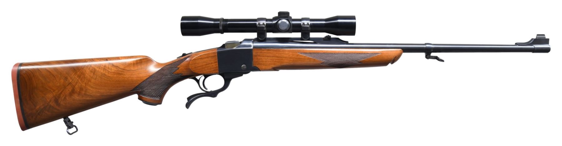 SPORTER SINGLE SHOT RIFLE. Cal. 7x57. S# 130-28350. Mfg. 1976. According to "Reference of Ruger Firearms, Volume 2" (Third Revision), this variation has approx 304 made in known S# range 130-26398 to 130-28086. Bbl. 22" w/ Liberty marking on left side. Barrel band mounted gold bead front sight & Lyman style folding adj. rear sight on quarter rib. Lyman All American 4x, PermaCenter scope on Ruger rings. Sling swivels on barrel band mounted stud & toeline stud. Alex Henry checkered walnut forearm. Checkered walnut pistol grip buttstock with Ruger steel grip cap & red factory pad. CONDITION: near excellent wood & metal finish with scattered minute handling marks & scuffs on pad. Near excellent bore. Scope has very good plus finish with serviceable optics. PROVENANCE: Estate of Russell Dickerman. (25-1932/MD). MODERN. $1,000-1,500.