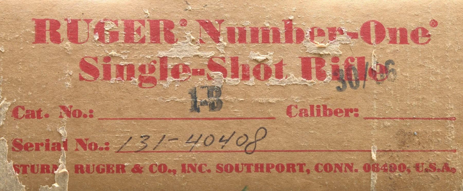 SCOPE & MATCHING FACTORY BOX. Cal. 30-06. S# 131-40480. Mfg. 1978. Medium weight 26" barrel w/ Warning marks. Lyman All-American 2 1/2x scope on Ruger rings & quarter rib; the scope's reticle is a horizontal crosshair with tapered vertical post. Checkered walnut stock set w/ sling studs & swivels. Beavertail forearm; pistol grip buttstock w/ Ruger steel grip cap & red pad. UNATTACHED ACCESSORIES: matching box w/ paperwork. Box in good overall condition w/ peeling from previous tape removal & one stain. CONDITION: all aspects near excellent; including bore. Near excellent scope finish w/ serviceable optics. PROVENANCE: Estate of Russell Dickerman. (25-1765/MD). MODERN. $800-1,200.