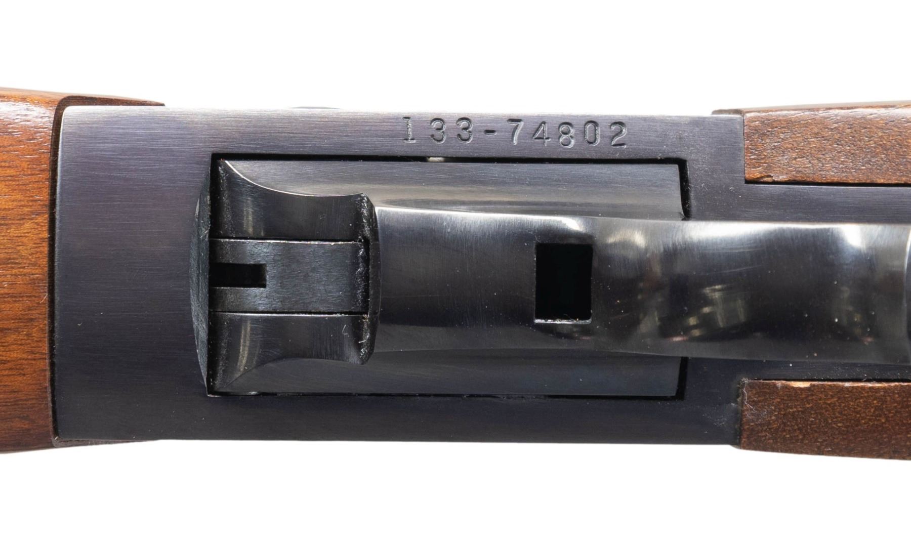 Cal. 7X57MM (7MM Mauser). S# 133-74802. Bbl. 20" with ramped banded user changeable brass bead front sight plus quarter rib with factory folding leaf rear sight and NECG receiver sight installed in rear Ruger scope ring position. Mfg. 2000 (1967 to date) as Model 01364 with "warning marks" on barrel (initiated 1977). Mannlicher checkered walnut stock set with black rubber factory pad plus front swivel and base for detachable rear swivel. CONDITION: all aspects near excellent including bore. PROVENANCE: Estate of Groves Herrick. (25-5659/NW). MODERN. $800-1,200.