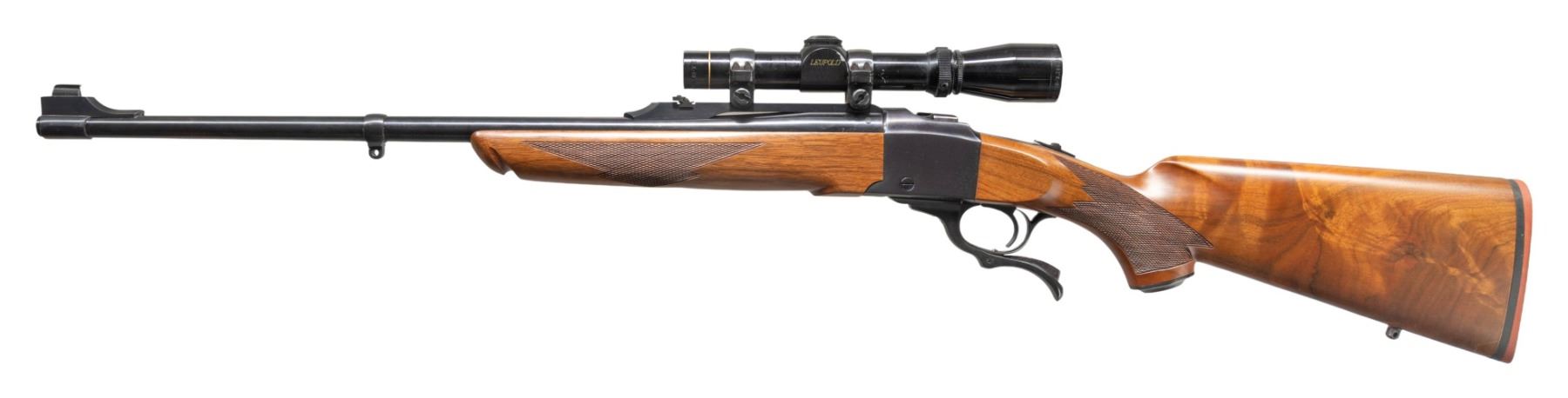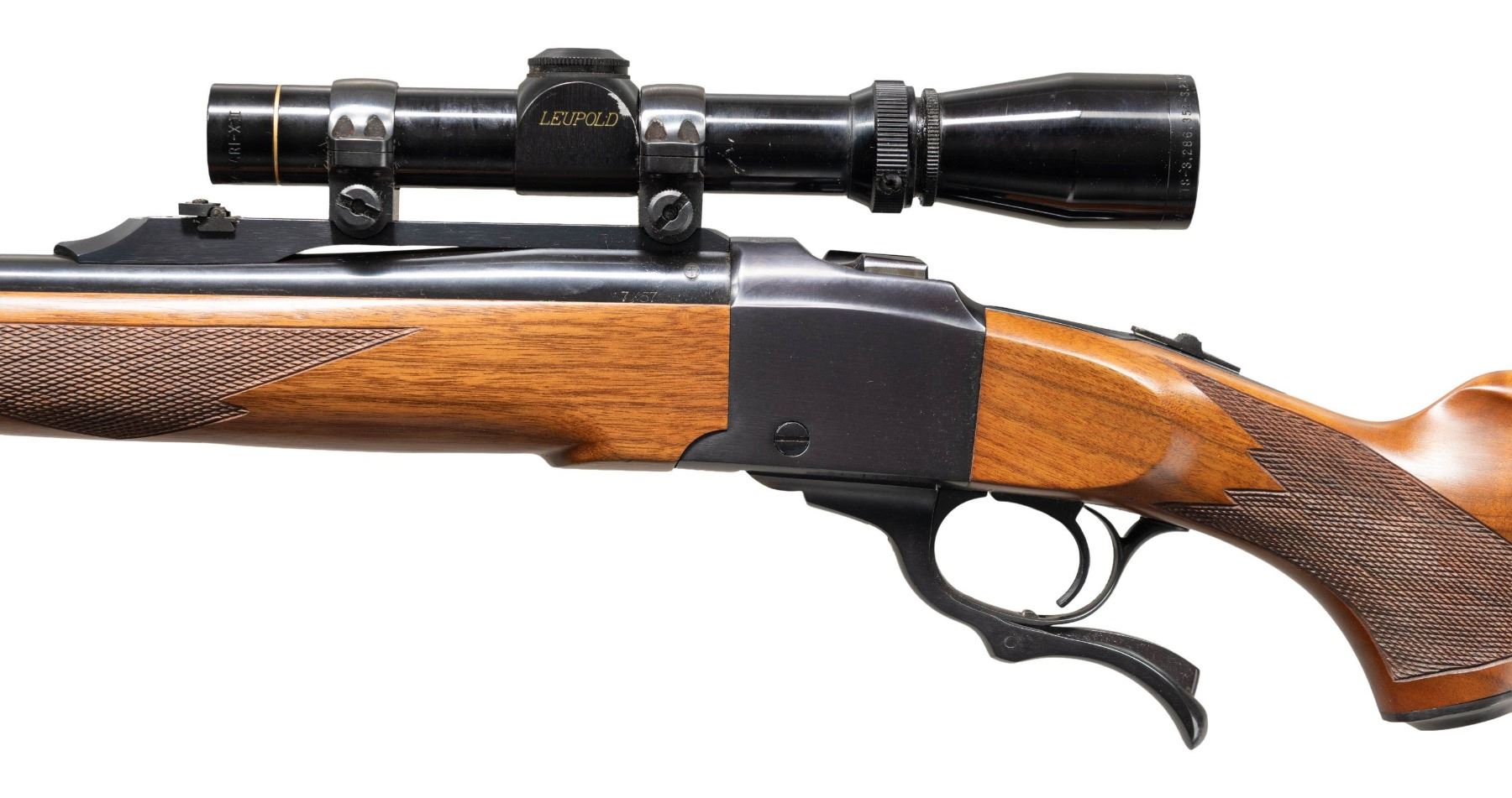 Cal. 7X57MM (7MM Mauser). S# 131-14323. Bbl. 22" sporter with banded user changeable brass bead front sight plus folding leaf rear on factory quarter rib that is machined for its Ruger 1" scope rings; without "warning marks" (initiated 1978) showing just Southport address. Gloss finished Leupold Vari-X II 1-4 power scope with Duplex reticle. Mfg. 1977 (1967 to date) with checkered walnut stock having Alex Henry forend, wonderful buttstock figure, red pad (early rounded edges), steel grip cap and detachable sling swivel bases (front is barrel band style). UNATTACHED ACCESSORIES: poor (water damaged) original matching numbered 1 piece white cardboard box with paperwork; bright yellow end label. Original 11-29-77 bill of sale from Ron Shirk's of Lebanon, PA listing rifle at $279.95 and scope at $69.95. CONDITION: generally near excellent with very slight thinning of bluing on front edge of lever. Light stock marks; mostly on buttstock concentrated at toe line between swivel base and pad. Near excellent optics and bore; scope exterior has prior ring marks at rear. PPROVENANCE: Estate of Groves Herrick. (25-5662/NW). MODERN. $800-1,200.