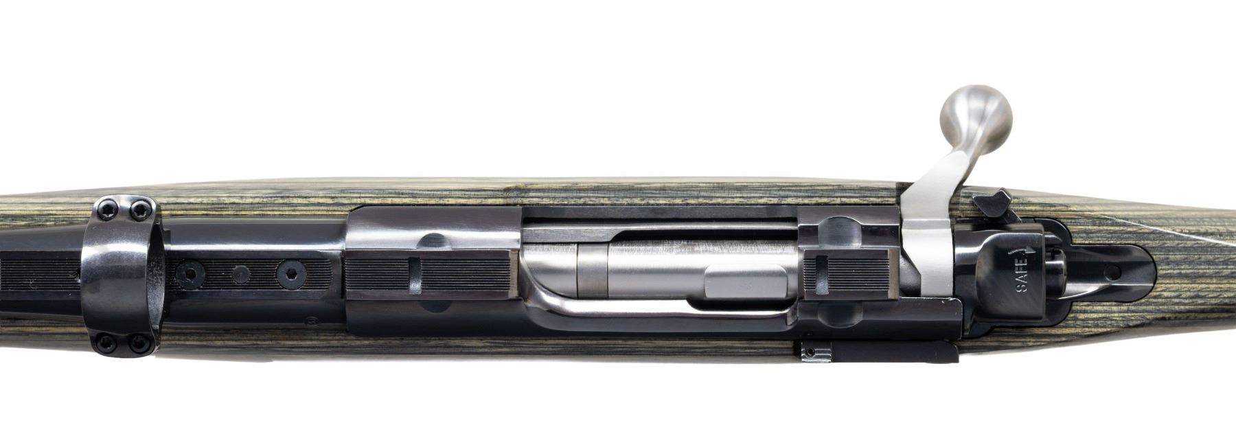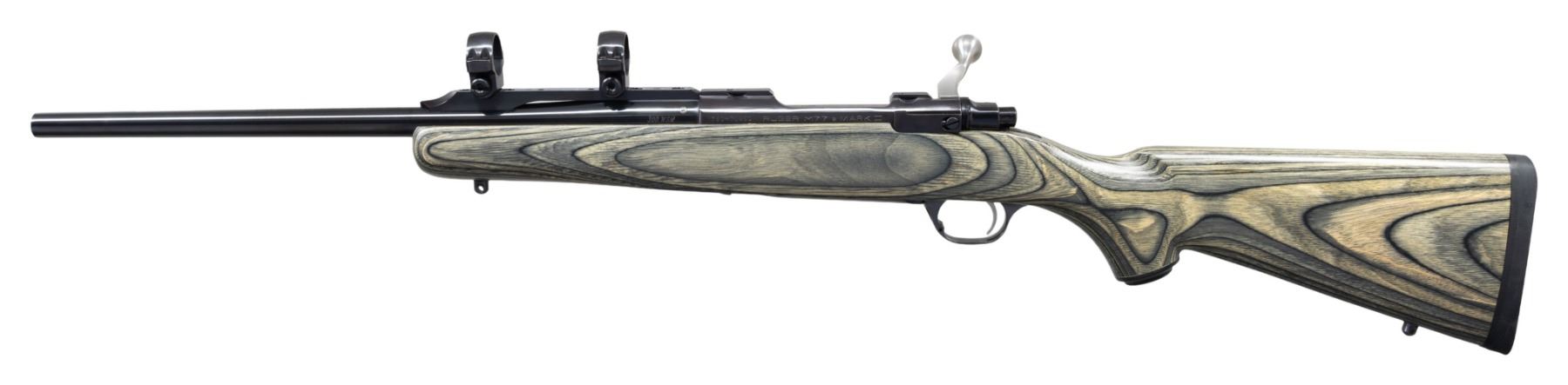 BOLT ACTION RIFLE WITH MATCHING FACTORY BOX. Cal. 300 WSM. S# 791-71950. Mfg. 2006 (discontinued same year) as Catalog # M77FRBBZ MK2; Model 17884. Compact 16.5" bbl. w/ Ruger rings on quarter rib. Short action w/ integral ring grooves, claw extractor & matching numbered bolt. Gray laminate smooth stock w/ Ruger grip cap, sling studs & pad. UNATTACHED ACCESSORIES: matching factory box containing Ruger paperwork & Model 77 Mark II Frontier cardboard advertising tube. CONDITION: all aspects of rifle near excellent; cardboard tube cracks & bent slightly downwards. (24-3717/MD). MODERN. $600-800.