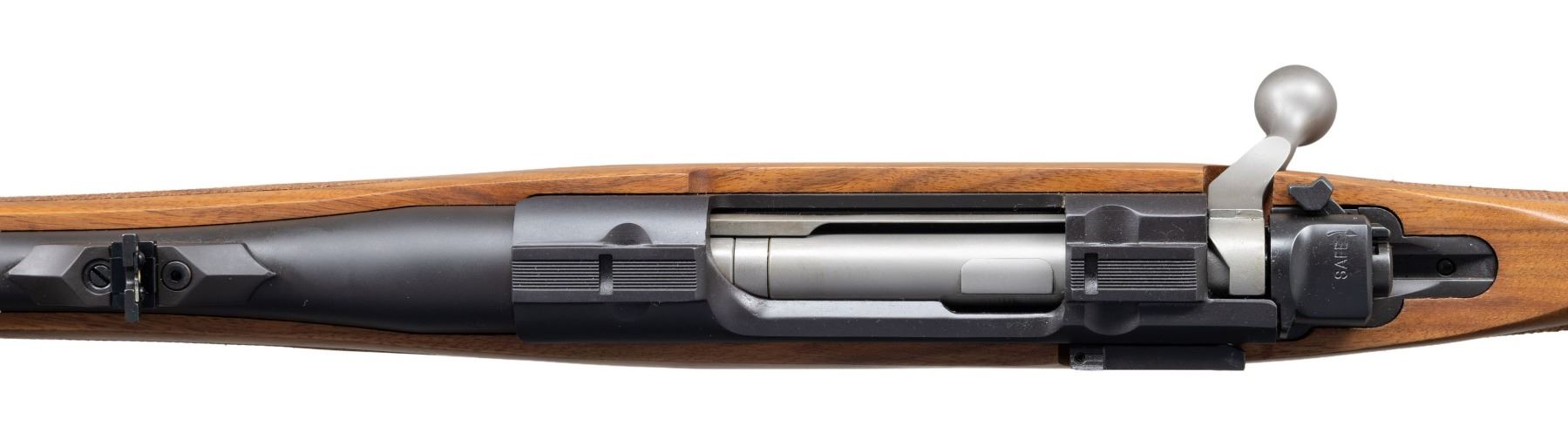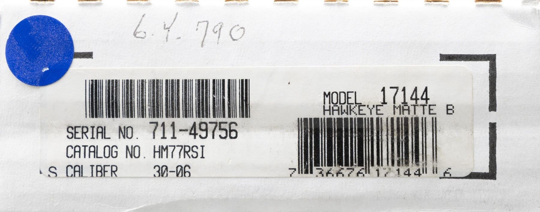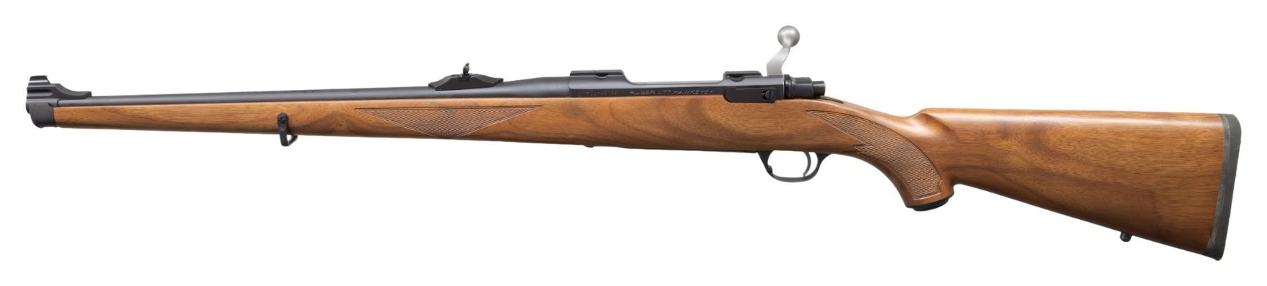 BOLT ACTION RIFLE WITH MATCHING FACTORY BOX. Cal. 30-06. S# 711-49756. Shipped 2012 as Catalog # HM77RSI; Model 17144. Bbl. 18.5". Matte blued finish. Gold bead band mounted front sight & island mounted folding leaf adj. rear sight. Control feed action w/ claw extractor, integral ring grooves & matching numbered bolt. Floorplate has laser engraved Ruger emblem. Checkered International walnut stock w/ sling stud, forearm swivel, Ruger grip cap & black pad. UNATTACHED ACCESSORIES: matching numbered box containing lock, Ruger rings, swivel & paperwork. CONDITION: as NIB (24-3494/MD). MODERN. $700-1,000.