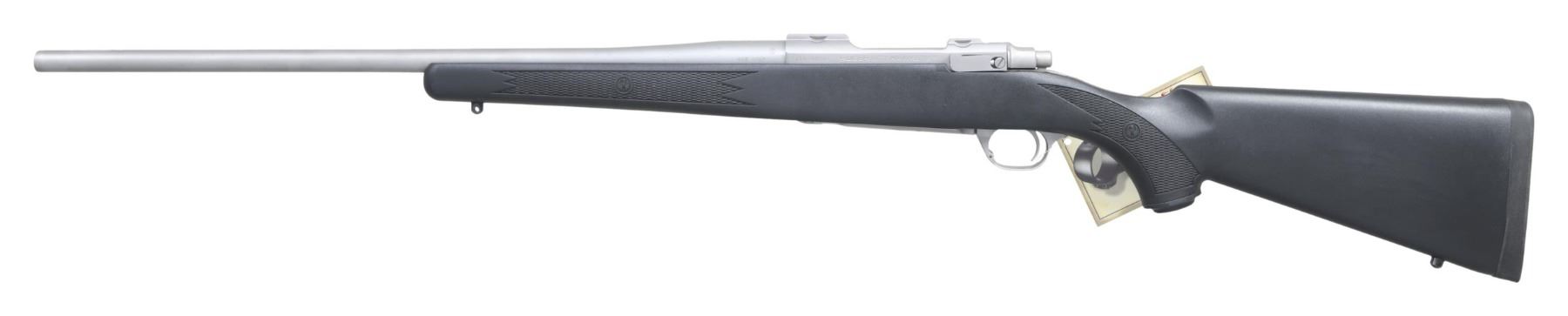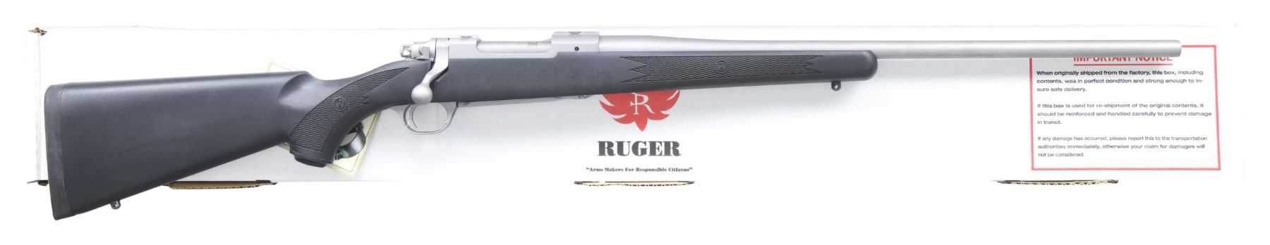 Cal. 358 Win. S# 710-02865. Bbl. 22". Receiver has integral scope bases. Ruger catalog # HKM77RFP & model # 07128 made in 2007. Stainless finish with Ruger logo on floorplate. Black synthetic stock with bottom mounted sling studs & factory recoil pad. LOP: 13 1/2". UNATTACHED ACCESSORIES: matching numbered factory box that has a tear on one end with set of stainless Ruger rings, manual & trigger lock. CONDITION: all aspects near excellent with factory hang tag on trigger guard. (24-3399/MJC). MODERN. $400-600.